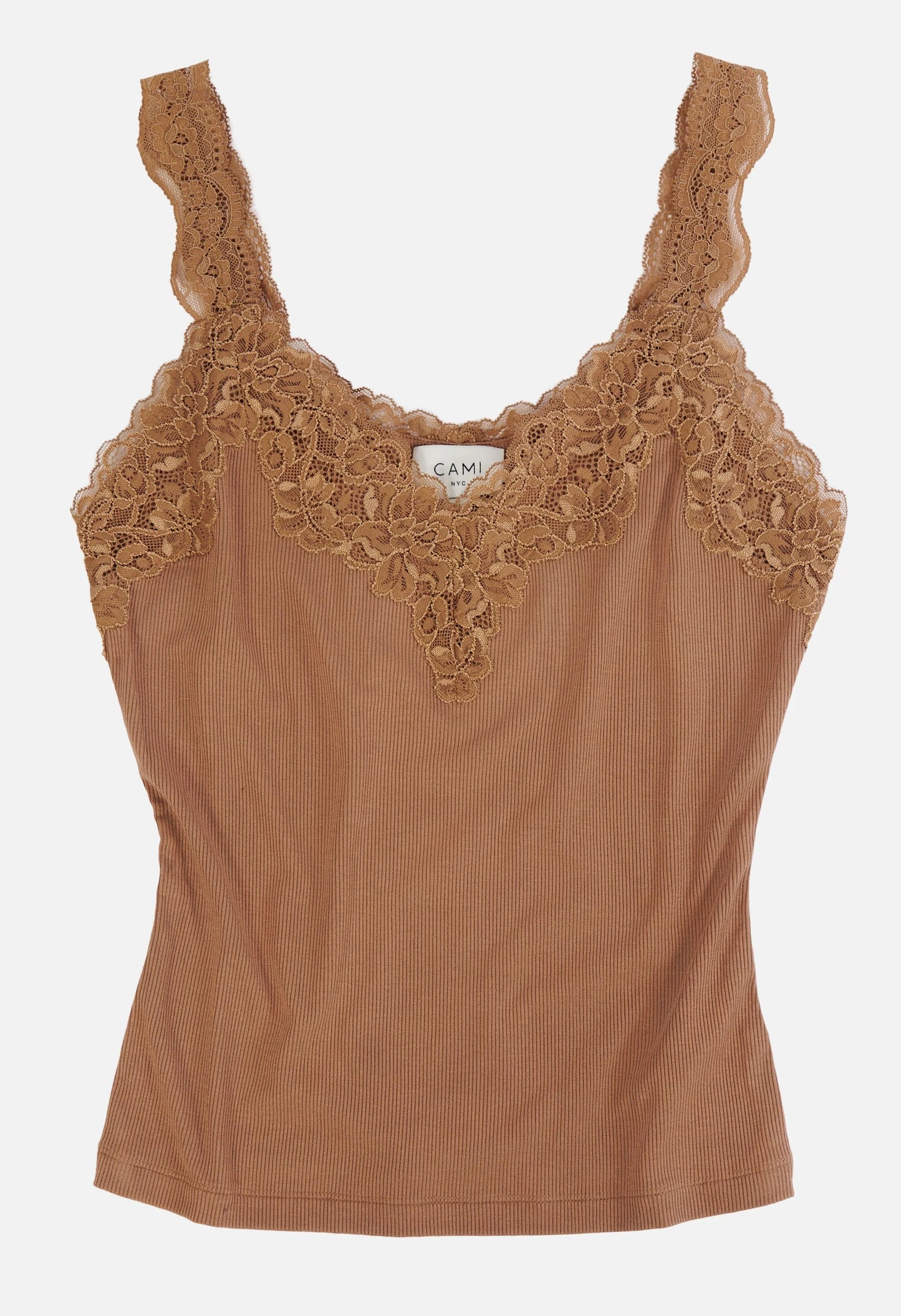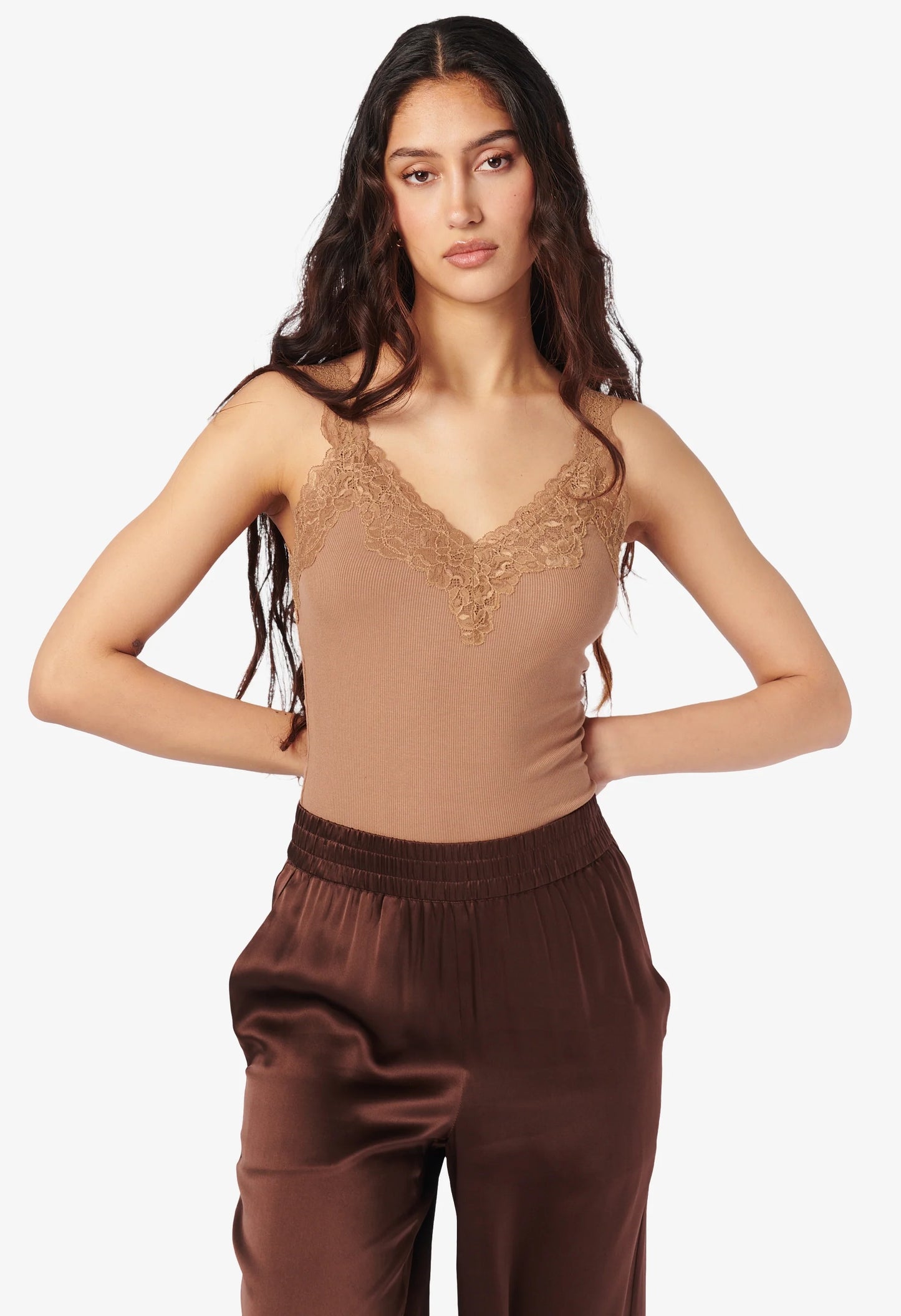 The Lani Tank Top is the perfect addition to your wardrobe. Made from a super soft rib knit material, you'll feel comfortable and stylish all day. The lace trim along the neckline and armholes adds a feminine touch, while the high hip length ensures a flattering fit. Plus, it's bra friendly for added convenience.