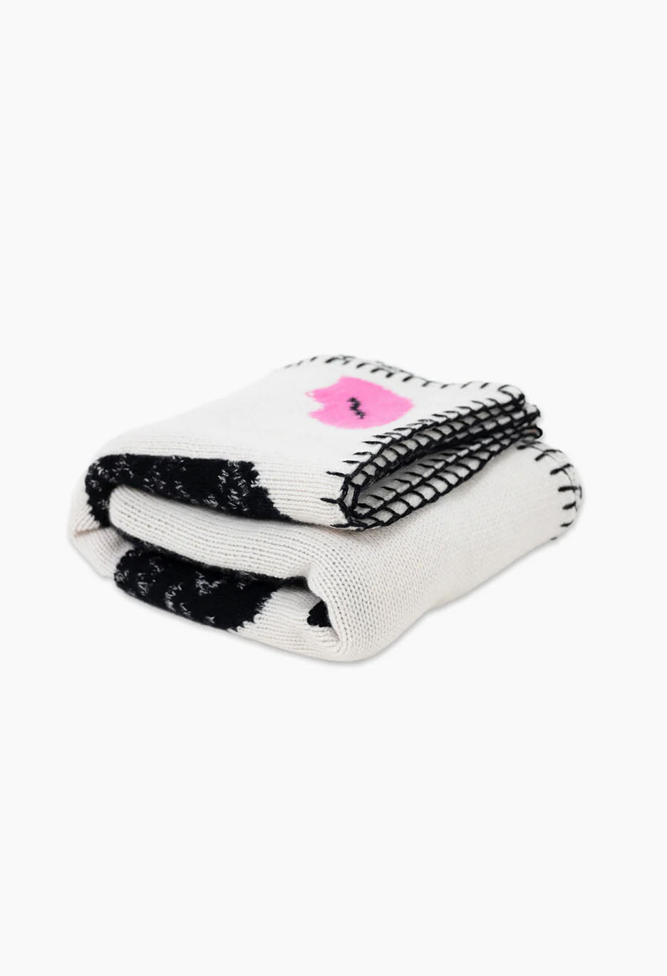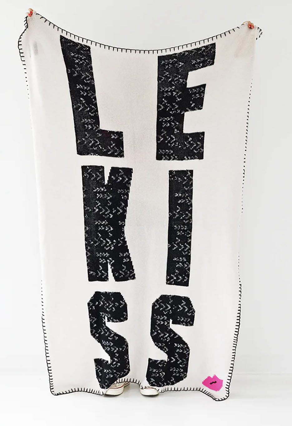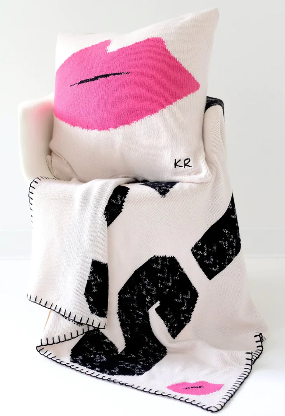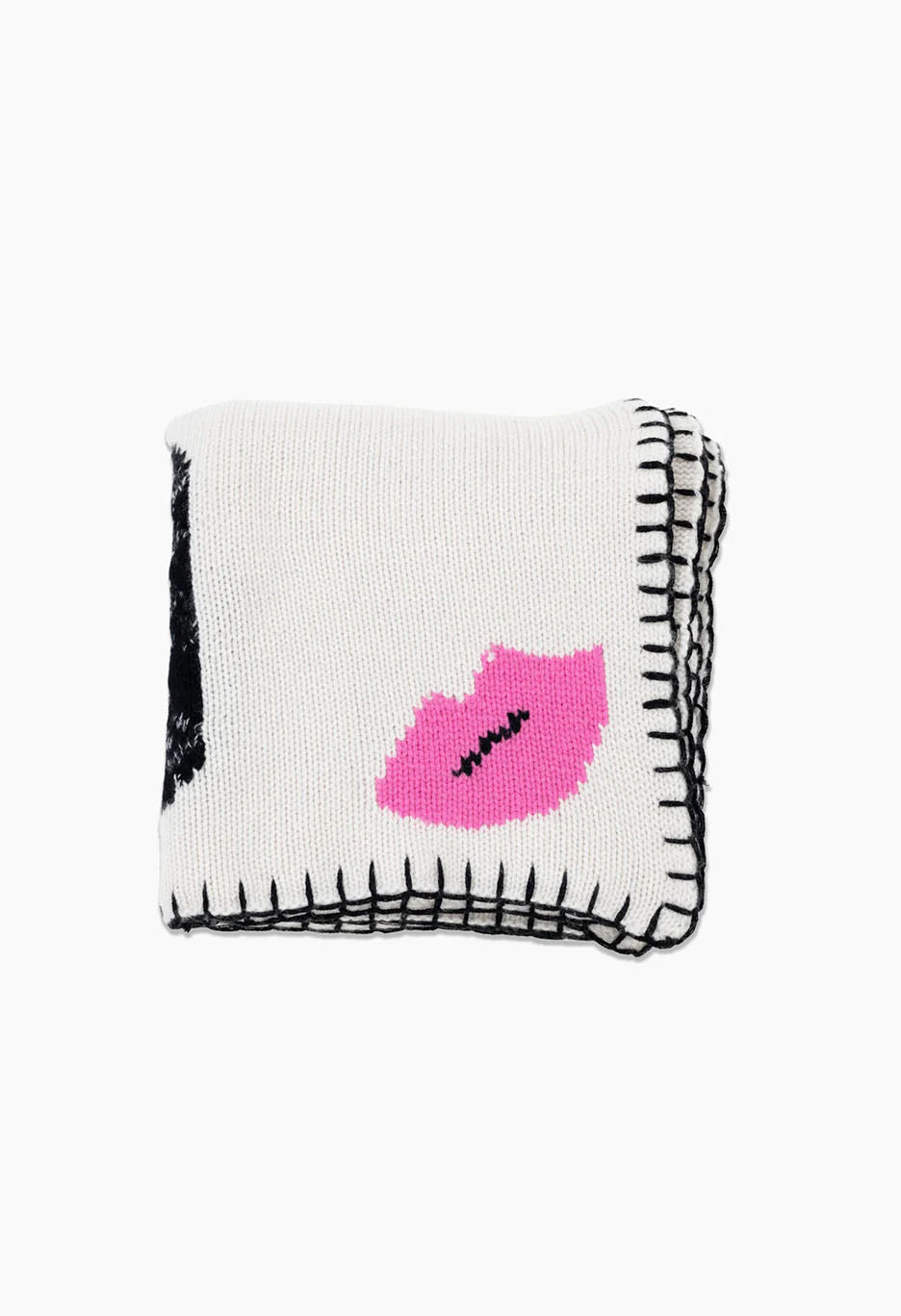 Le Kiss sweater blanket is based on Kerri's Le Kiss Painting. It's offered in this cotton-cashmere intarsia blanket is finished with stitched edges.