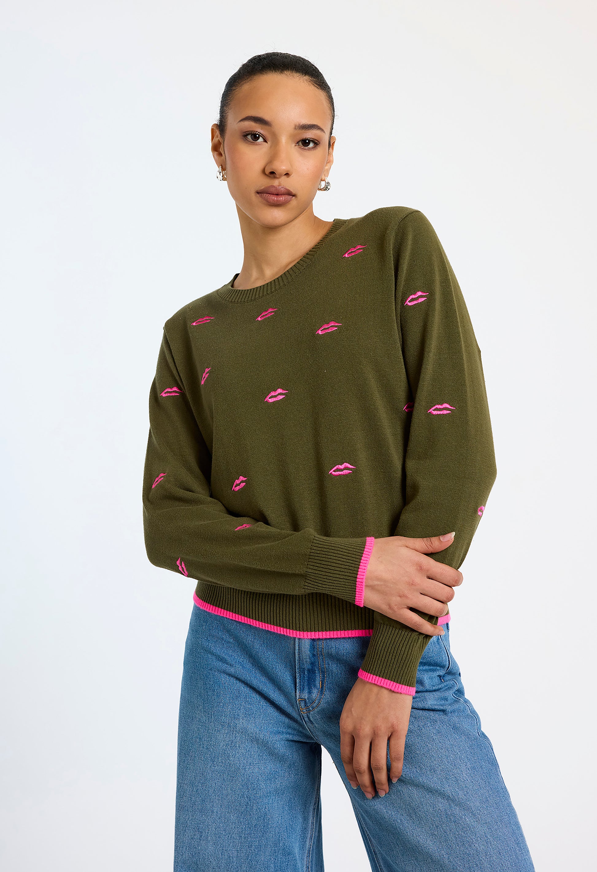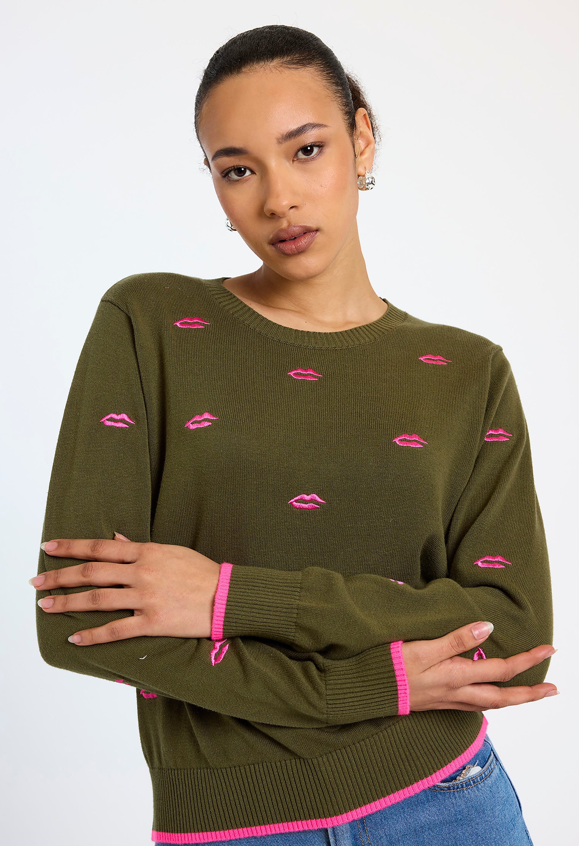 This crew neck sweater features a distinctive embroidered lips design, adding a subtle yet stylish statement to your wardrobe. Crafted for comfort and a polished look, it pairs effortlessly with casual or smart outfits, making it a versatile addition to any closet.