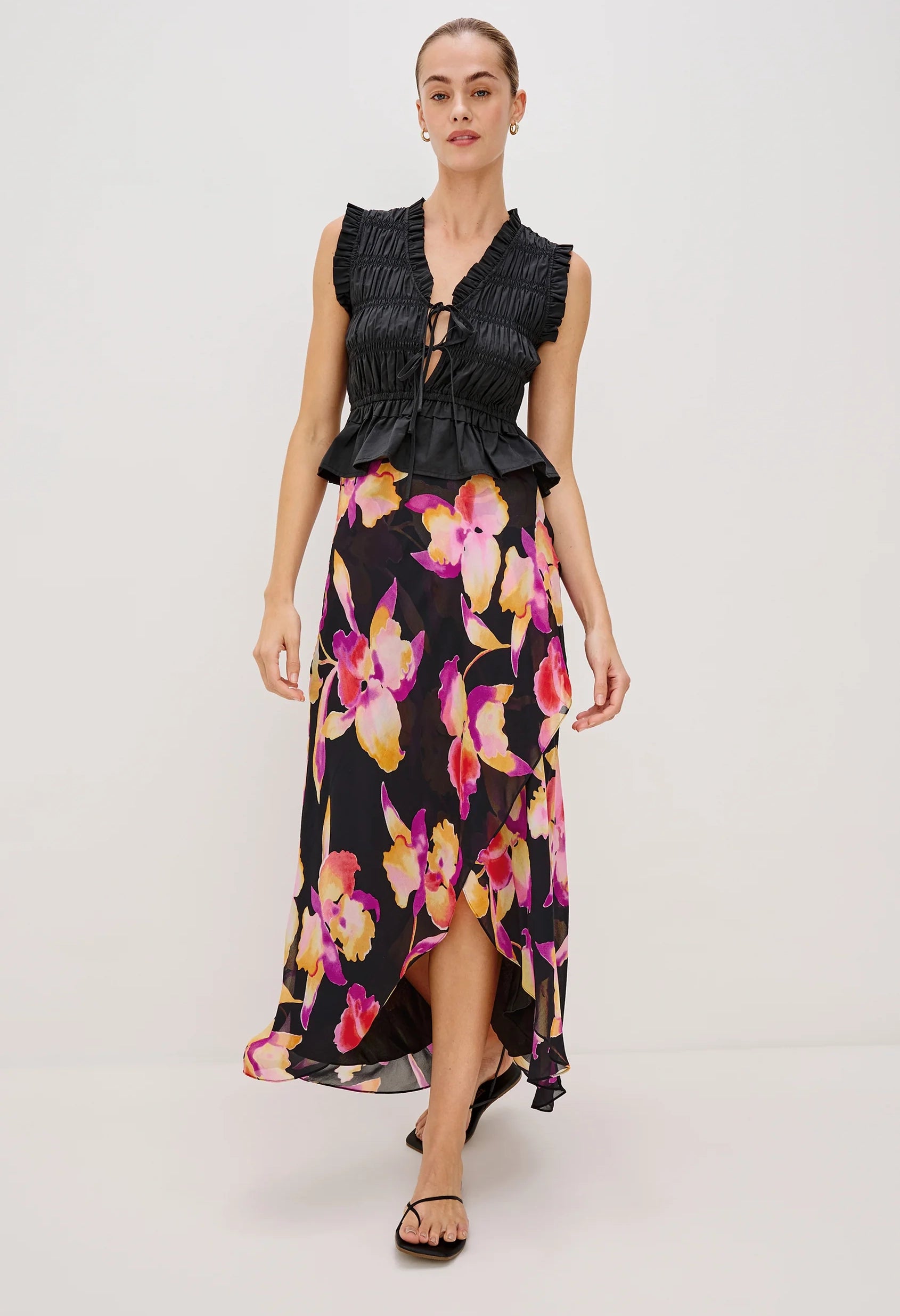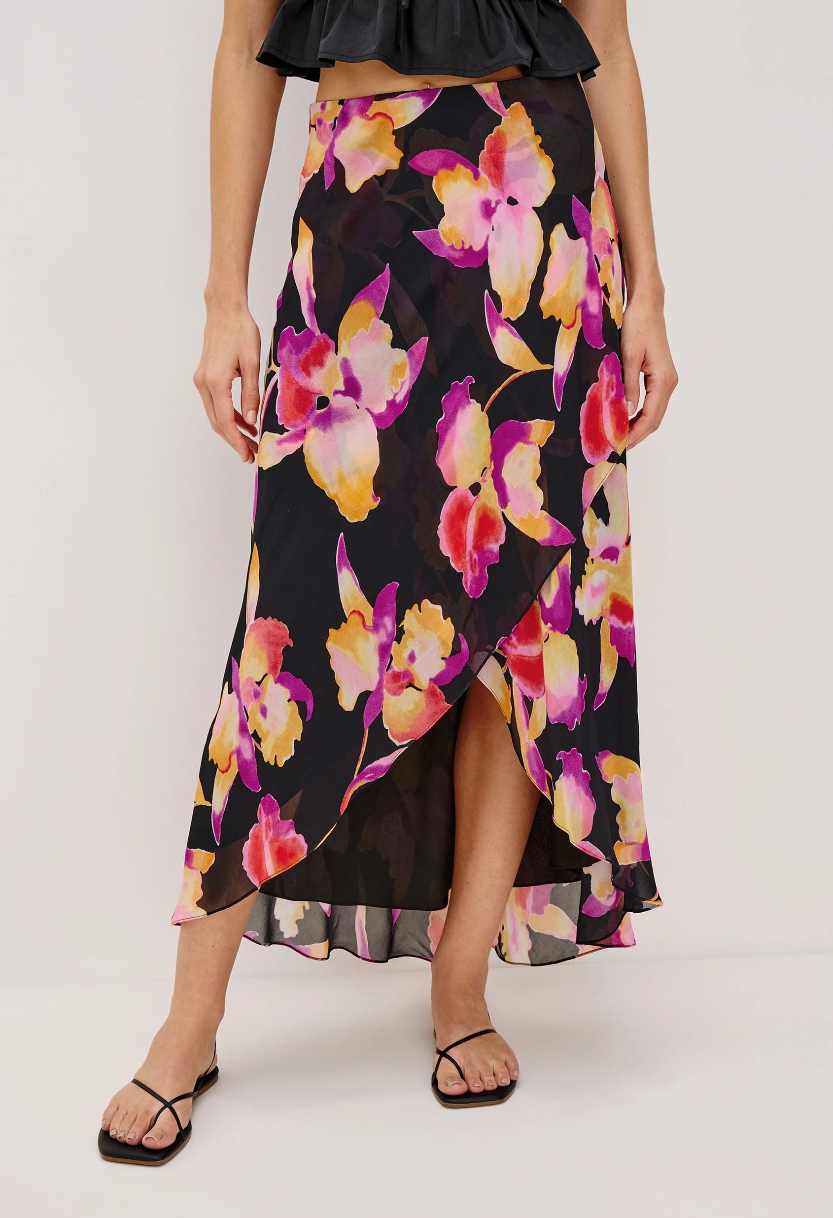 The Lenora midi—crafted in luxe chiffon—is a body-skimming skirt with a high-low hem, cut on a bias for a made-for-you fit. Features a hidden elastic waistband.