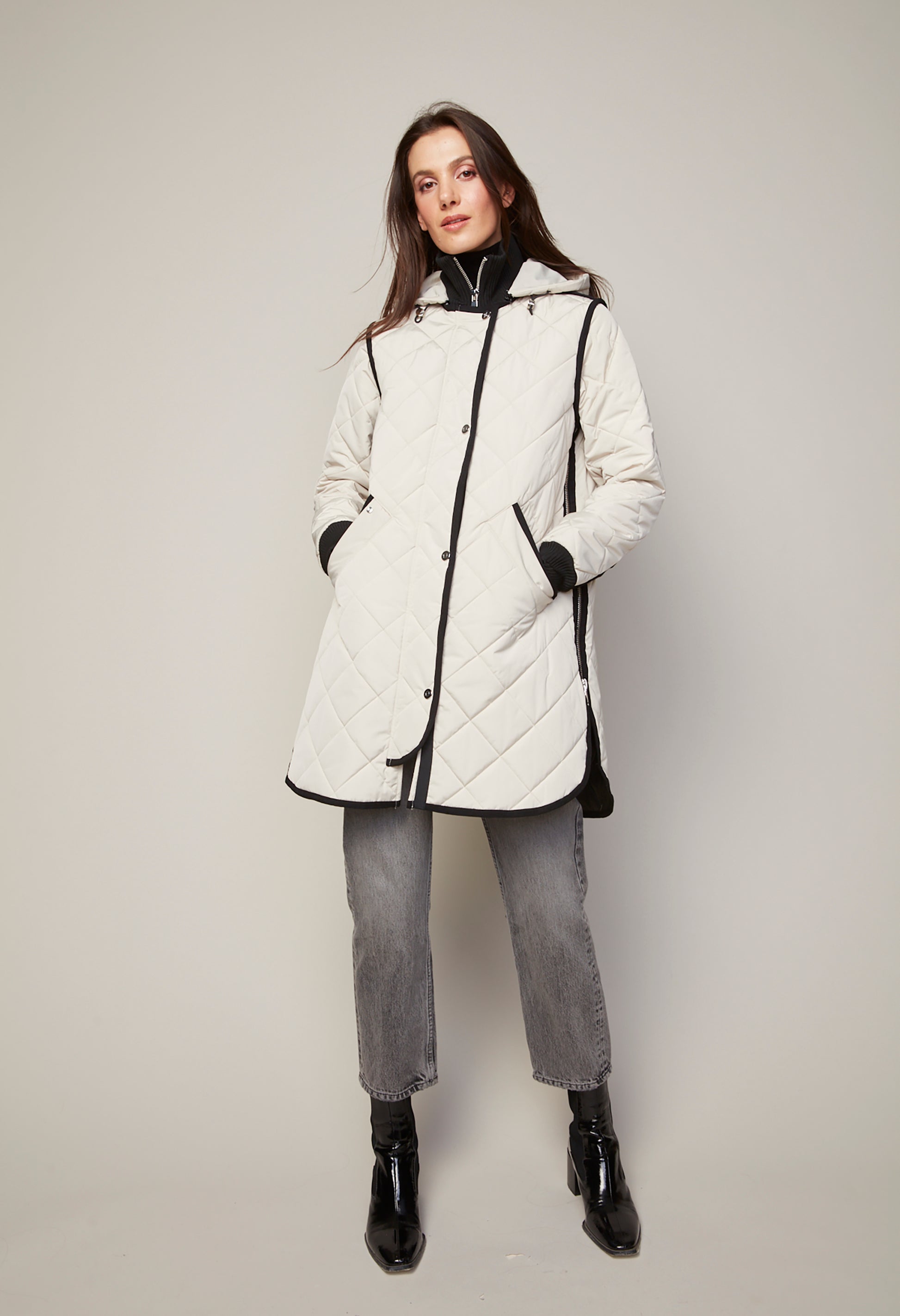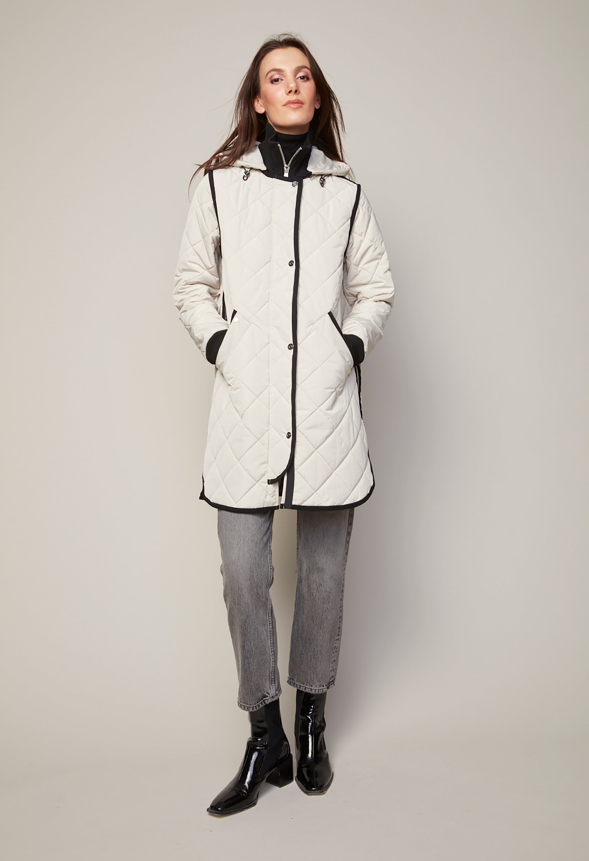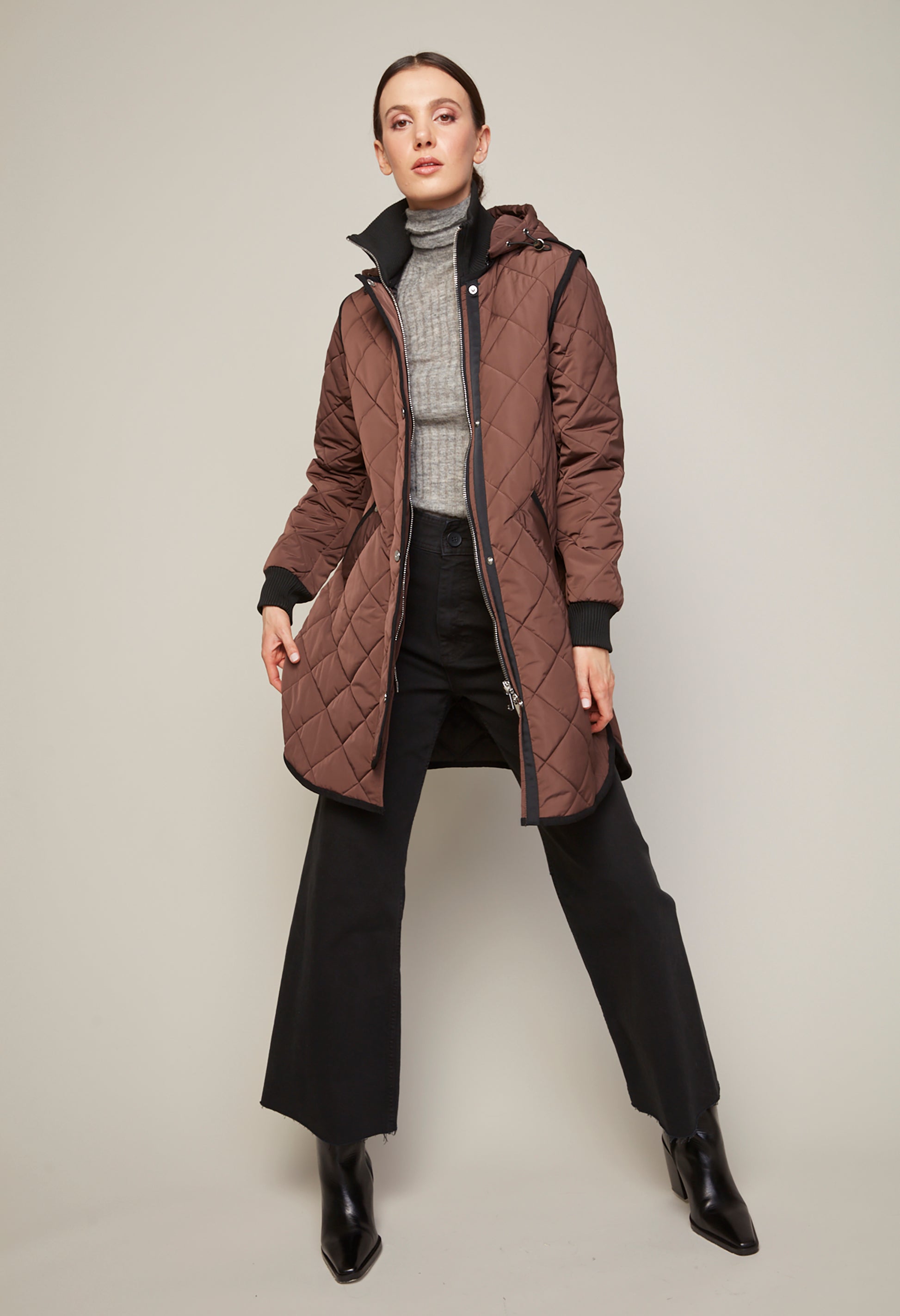The Libby Quilted Coat is a refined choice for transitioning from fall to winter. Featuring a mid-thigh length and quilted construction, it offers exceptional warmth without sacrificing style. This coat combines elegance with practical comfort, making it a sophisticated addition to your seasonal wardrobe.