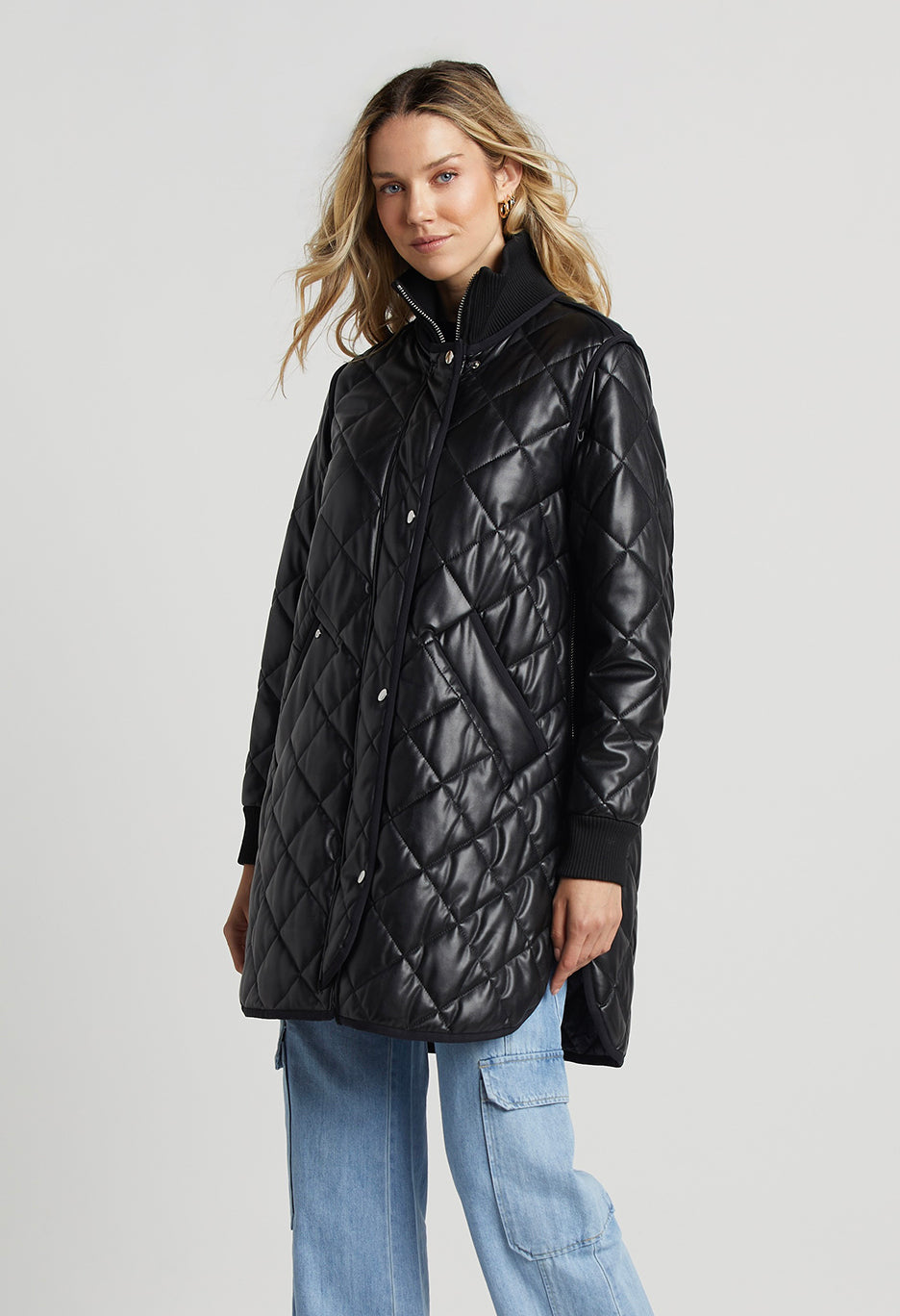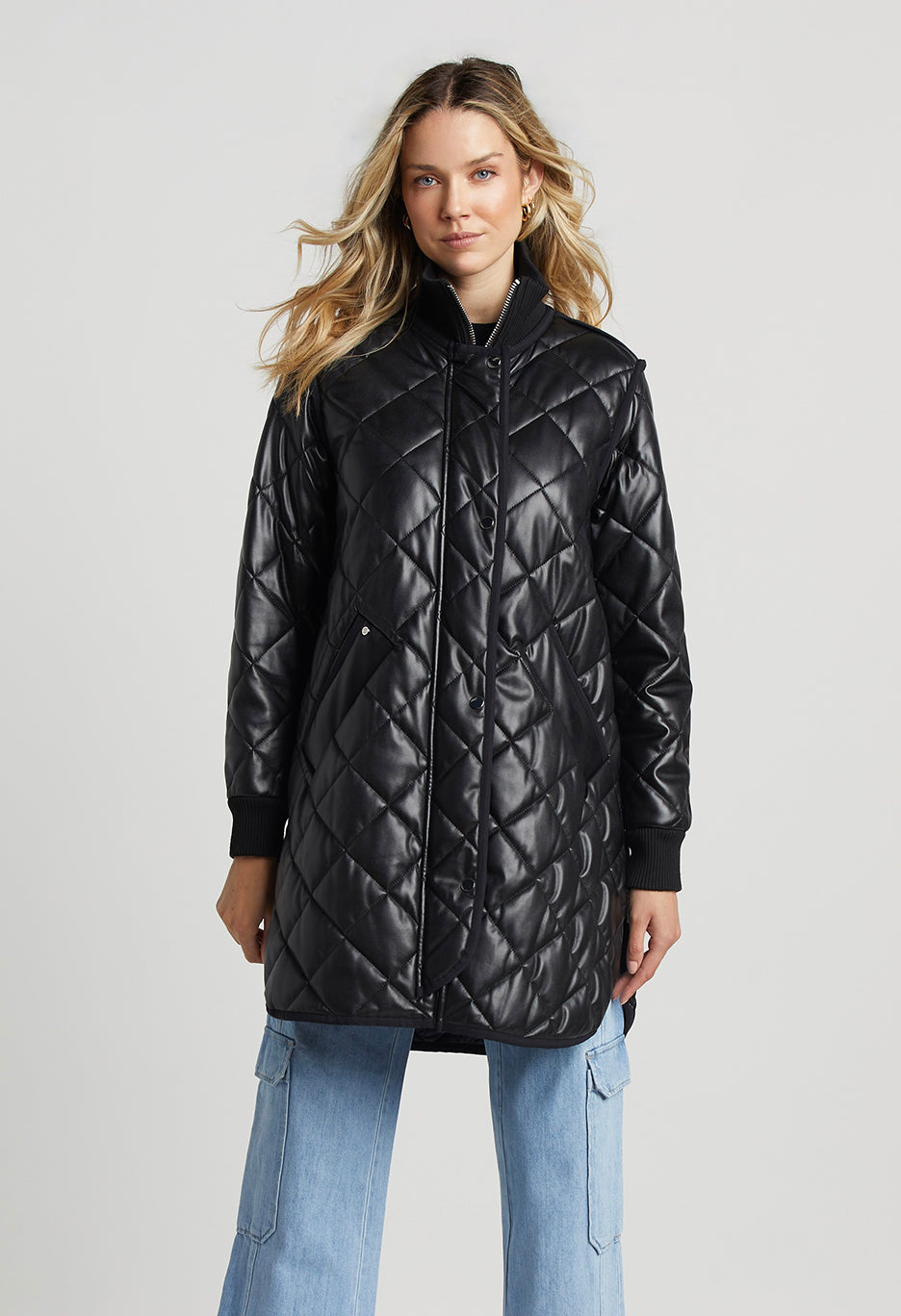 Discover the ultimate in luxury with the Liberty Vegan Leather Quilted Coat. This stunning piece exudes sophistication and exclusivity with its mid-thigh length and impeccable quilted design. Not only that, but it's also made from vegan leather, providing both style and ethics. Elevate your wardrobe with this one-of-a-kind coat.