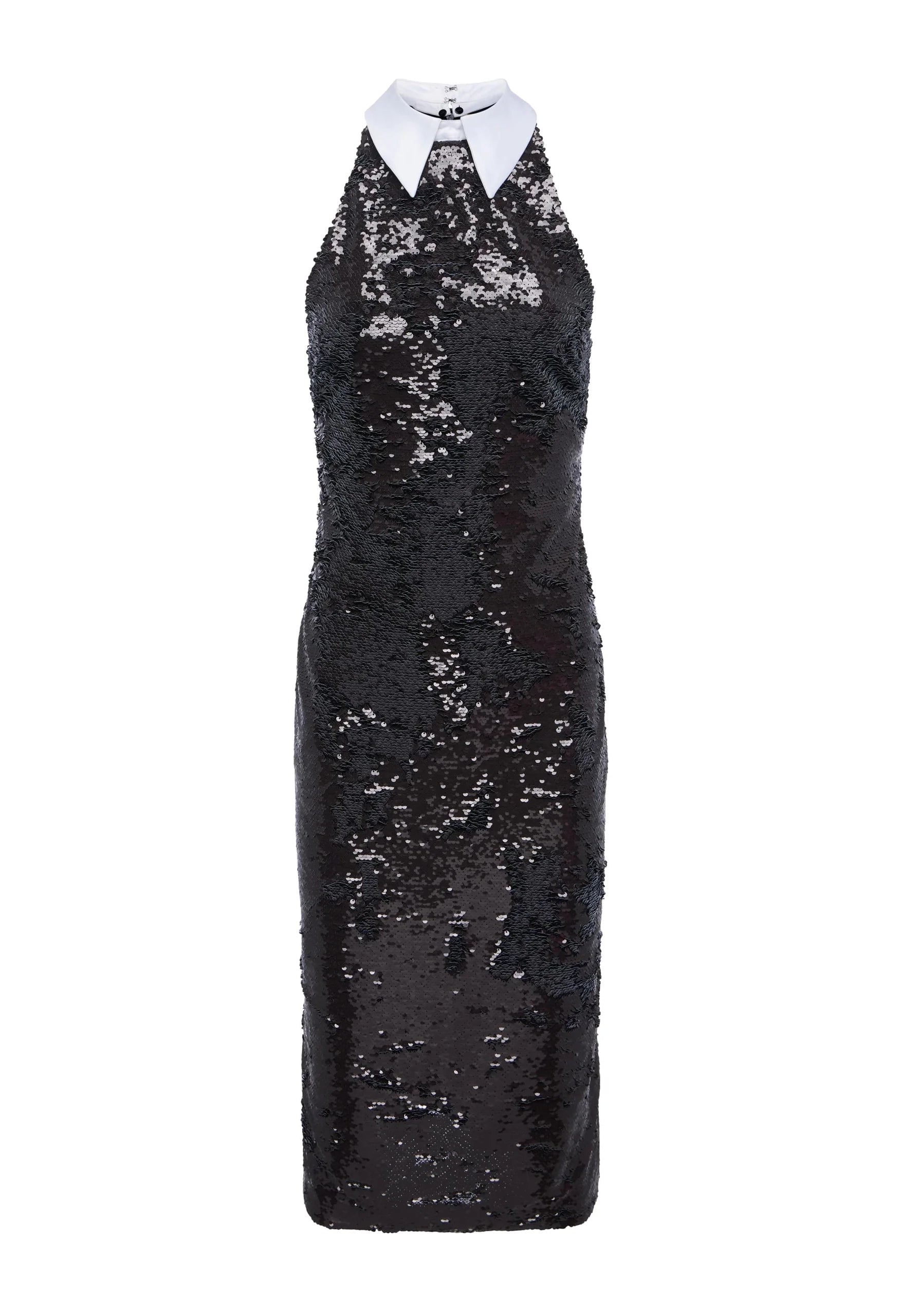 Introduced during L'agence's Fall '25 NYFW showcase, the Lilith dress merges sophisticated tailoring with eye-catching embellishment. A crisp white poplin collar provides structured elegance against a body of lustrous black sequins, creating a striking contrast that commands attention. The streamlined silhouette offers a refined fit that flatters while maintaining an air of understated confidence. Ideal for occasions where you seek to balance glamour with polished restraint