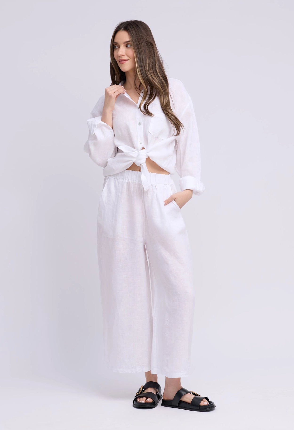 Effortless style meets comfort in these Sofia Linen Capri Pants. Crafted from breathable linen, they're perfect for warm weather days when you want something casual yet put-together. The slightly cropped cut hits just right—flattering and easy to move in. Pair them with a simple tee or linen shirt for that relaxed, laid-back vibe that works everywhere from weekend errands to casual outings.
