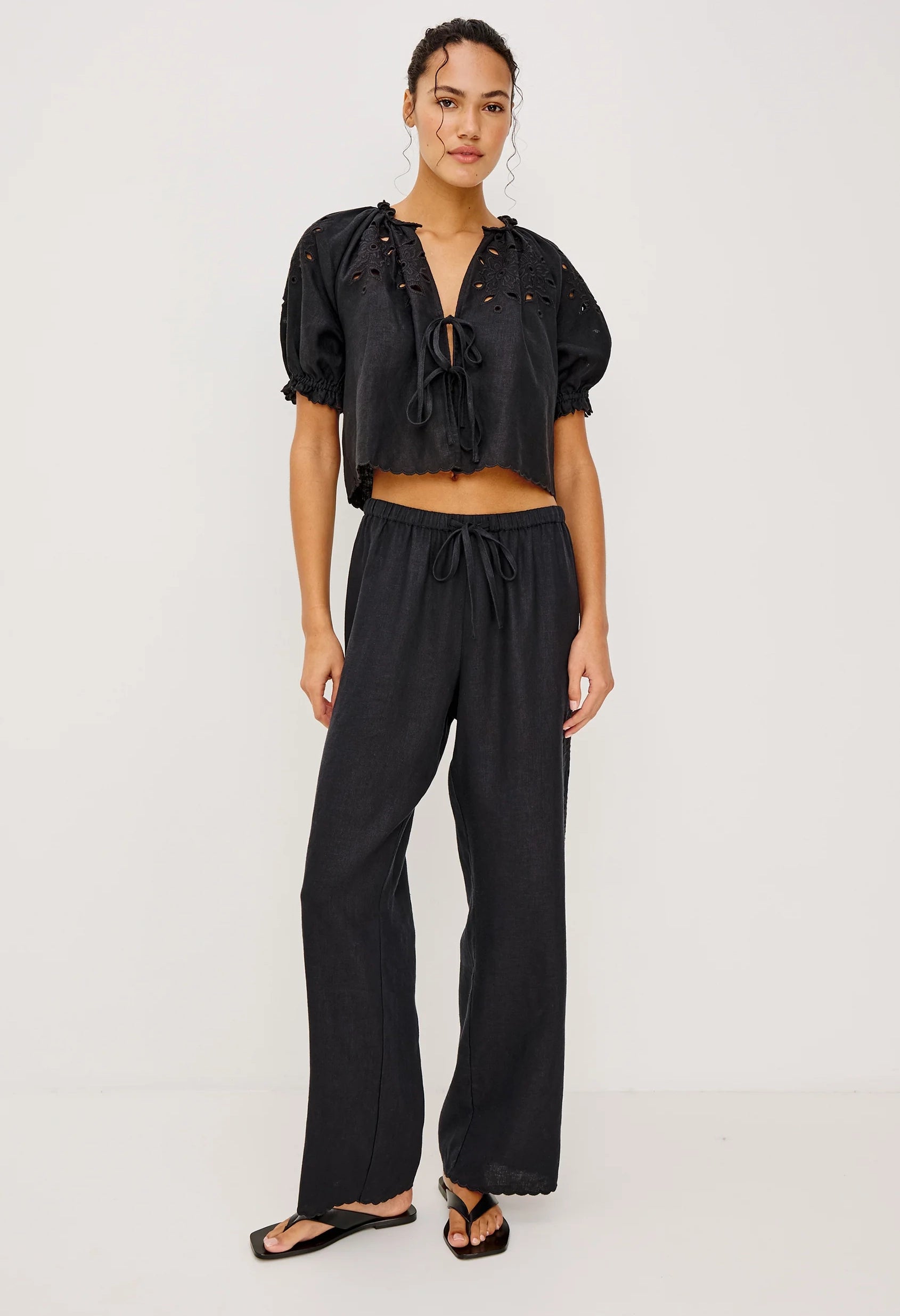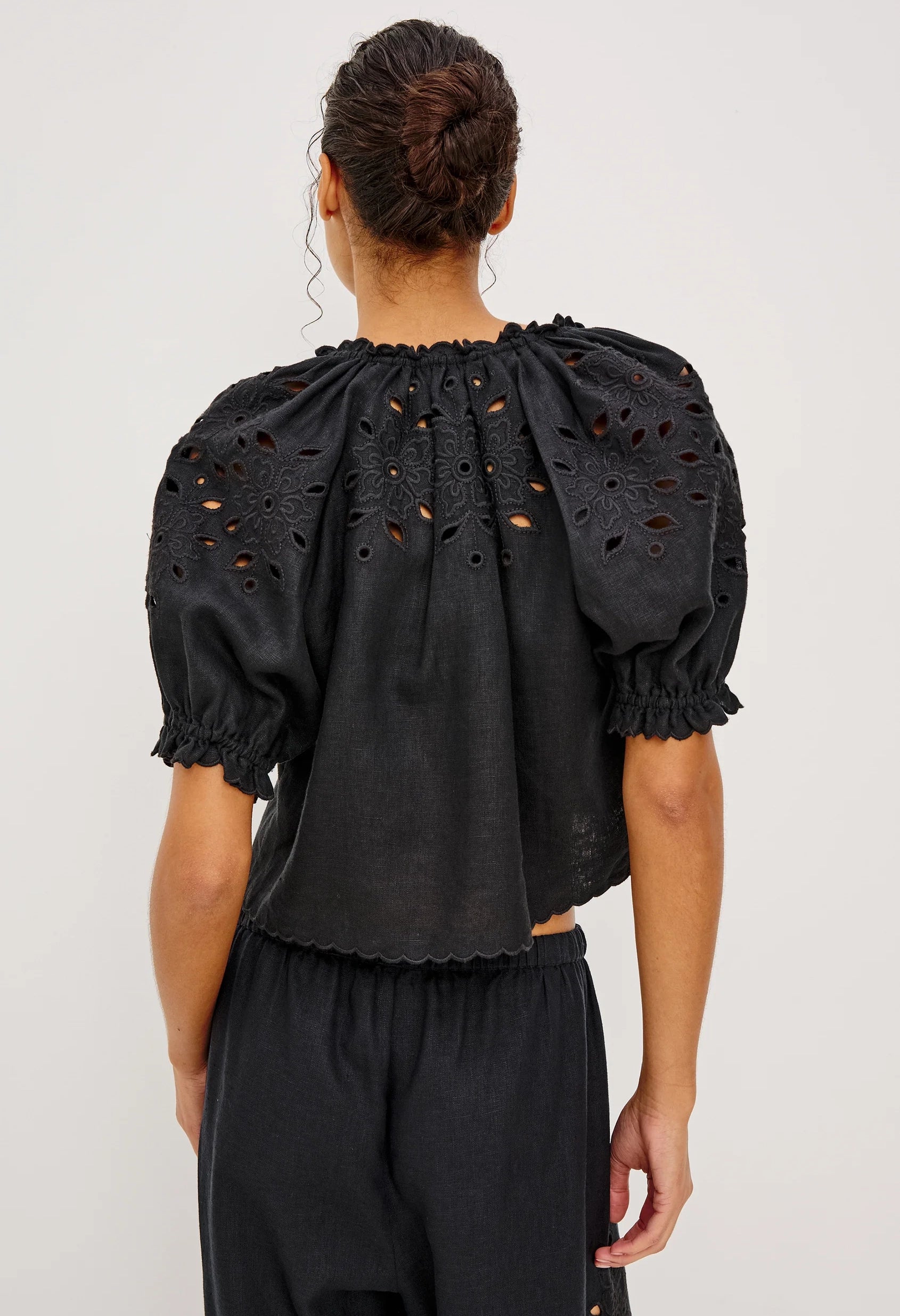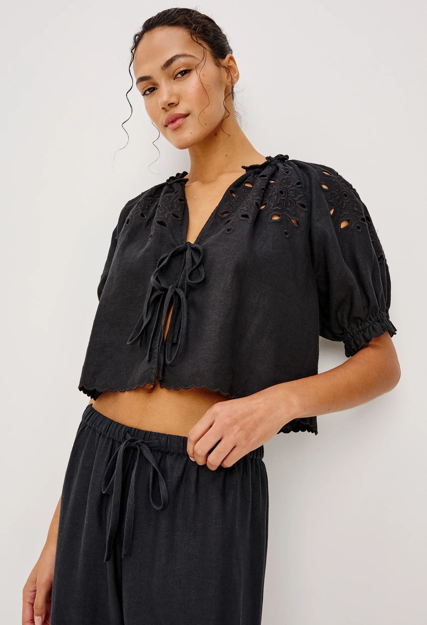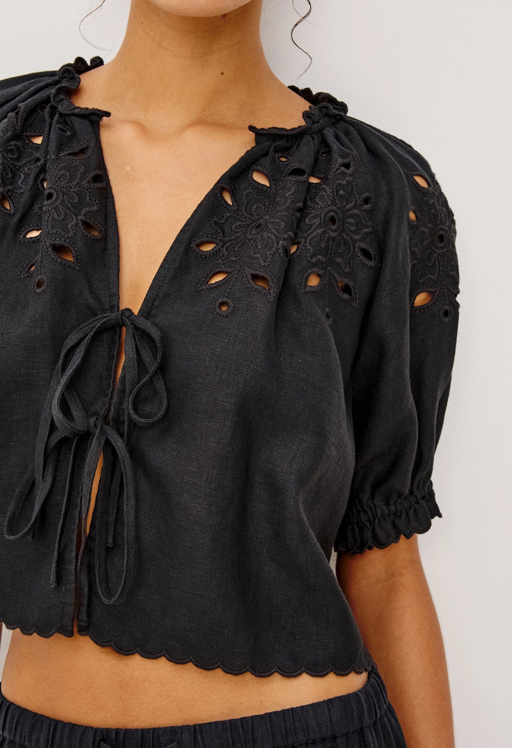 Inspired by timeless milkmaid style, the Lizbeth Top reimagines a vintage silhouette in premium, substantial linen. Delicate floral eyelet detailing adds romantic texture, while the adjustable tie-front V-neckline, voluminous puff sleeves with fitted cuffs, and ruffled edges create effortless charm. The cropped, relaxed fit offers modern ease with classic appeal.