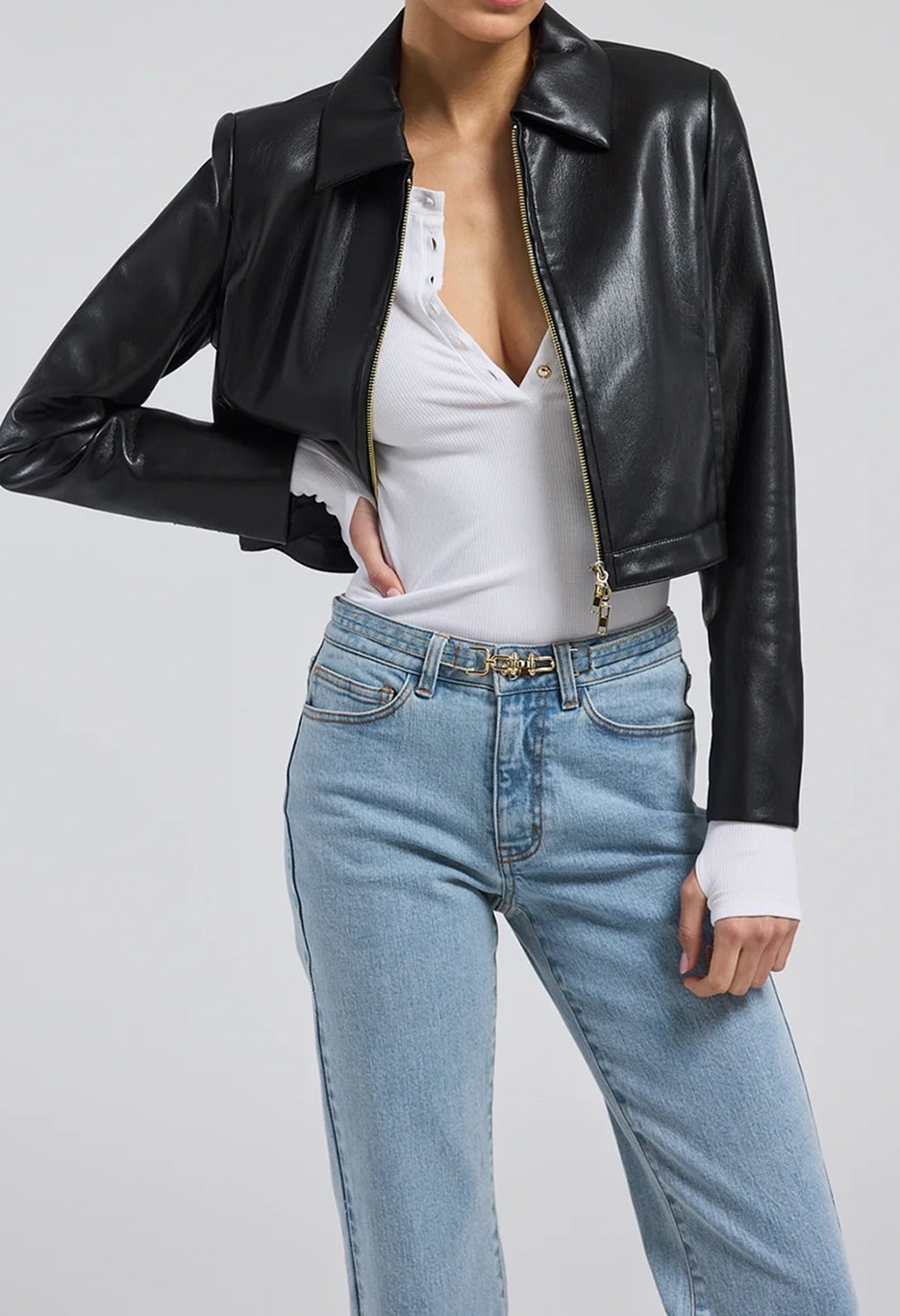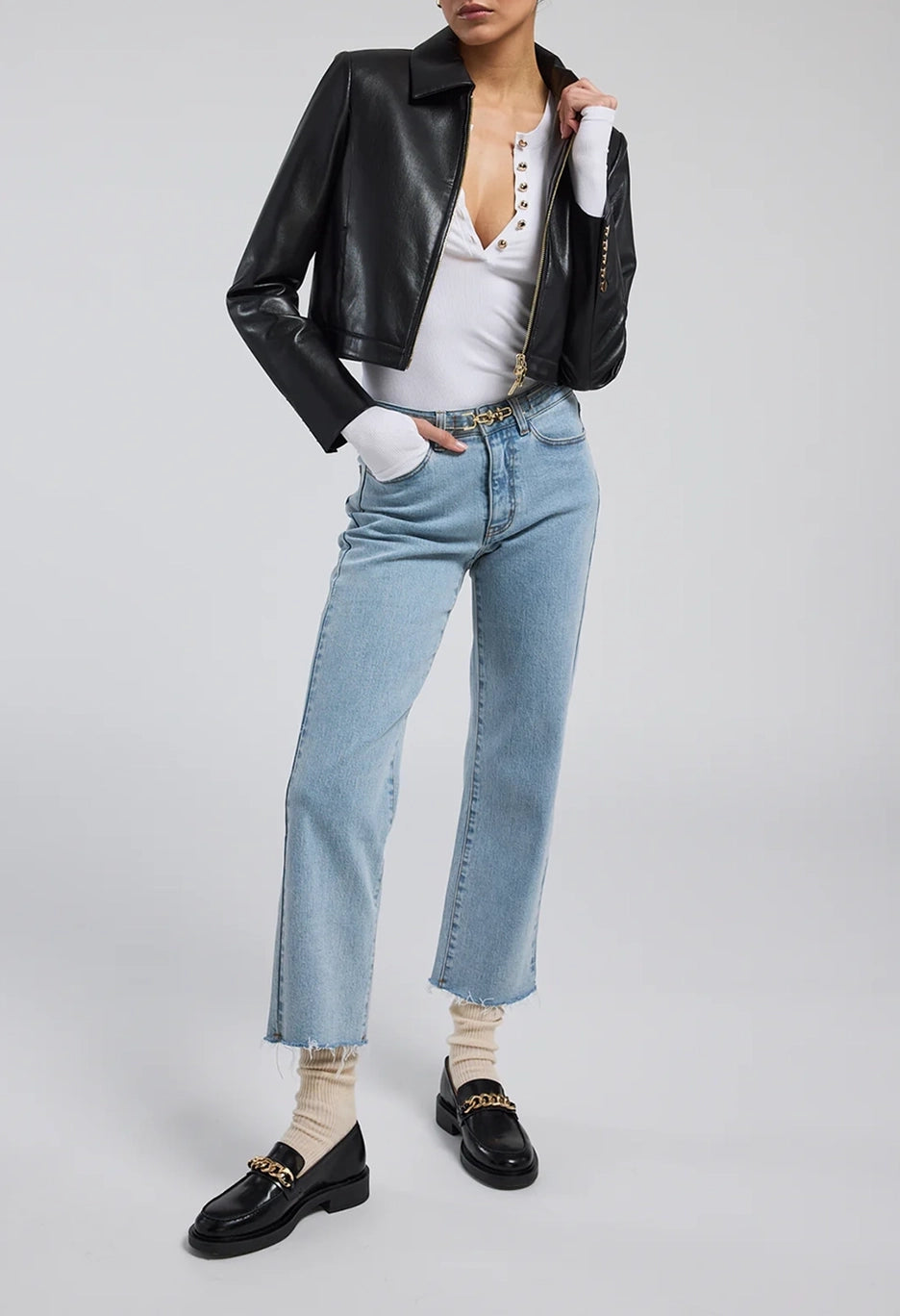 The Lola Vegan Leather Jacket is a must-have for the fashion-conscious and environmentally-conscious individual. Crafted from high-quality vegan leather, this cropped jacket features side pockets and shank buttons detailing. Perfect for adding an edgy touch to any outfit.