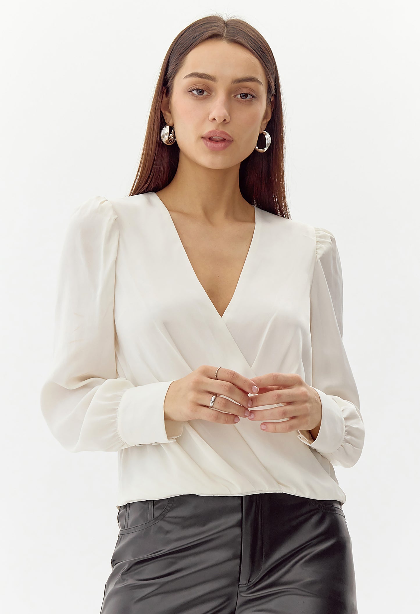 This blouse features faux wrap front, long cuffed sleeves, a v-neckline with snap closure, a back yoke, and a slight hi-lo hem. Fully lined.