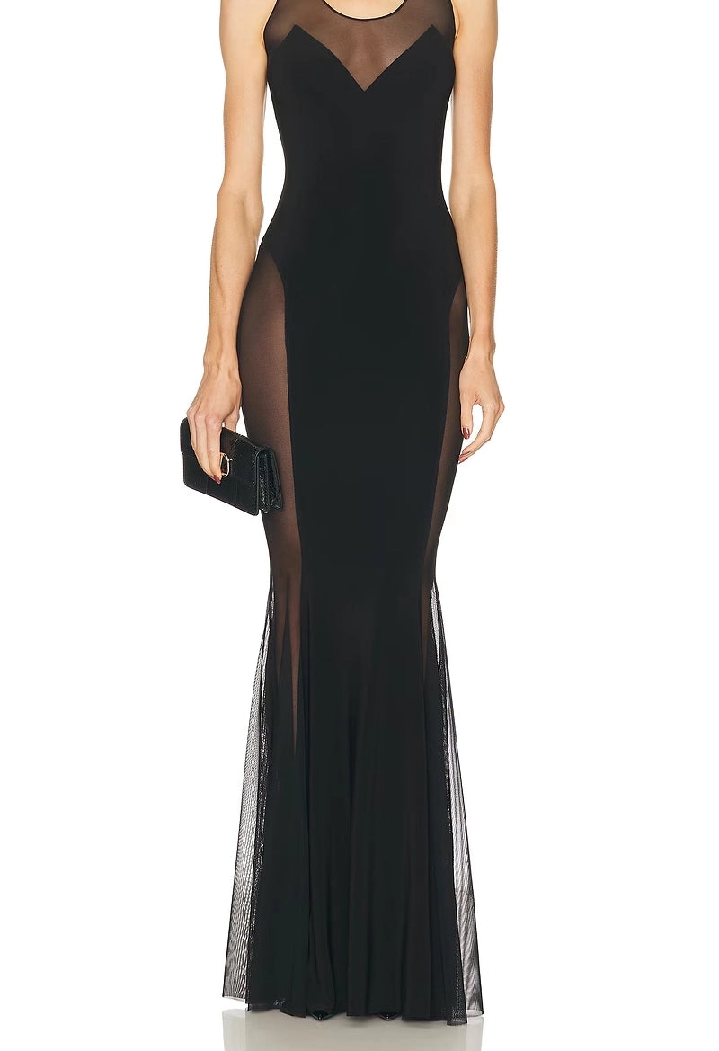 This elegant black sleeveless gown combines modern sophistication with striking design details. Sheer mesh paneling creates visual interest throughout, while the scoop neckline offers a flattering, classic silhouette. The convenient pull-on styling ensures effortless dressing, and the dramatic fishtail hem adds movement and glamour. Perfect for formal events and special occasions where you want to make a refined statement.