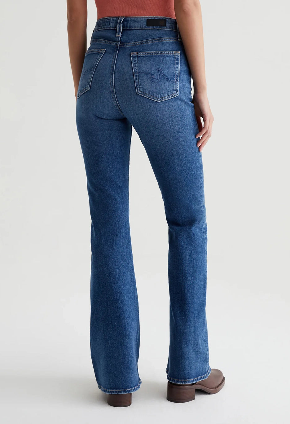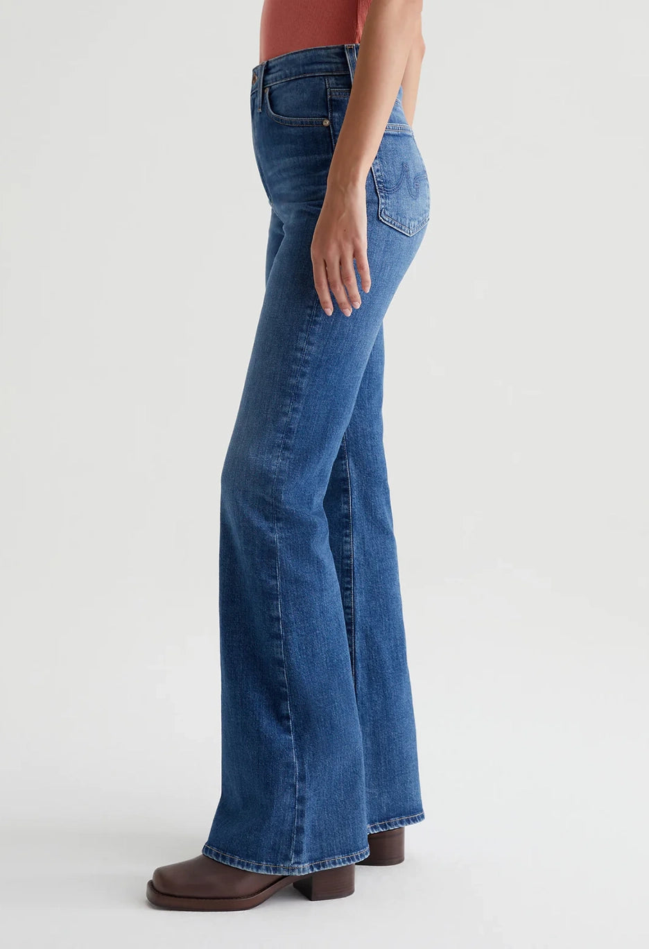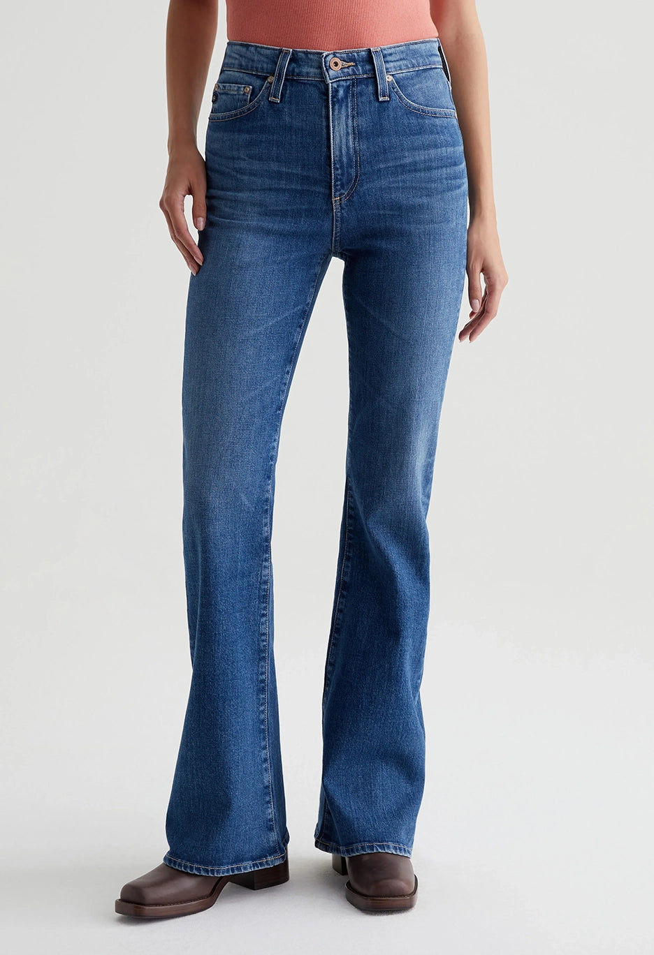 The Madi high-rise flare jeans have a '70s-inspired silhouette and a medium-indigo wash with the perfect worn-in fade. Crafted from stretch-blend 11 oz. Journey Denim, the style is designed to hug the hips and elongate the legs. The pair sits high on the natural waist and features an extended length that kicks out to a super-wide flare for a nostalgic fit that's incredibly flattering to the figure.