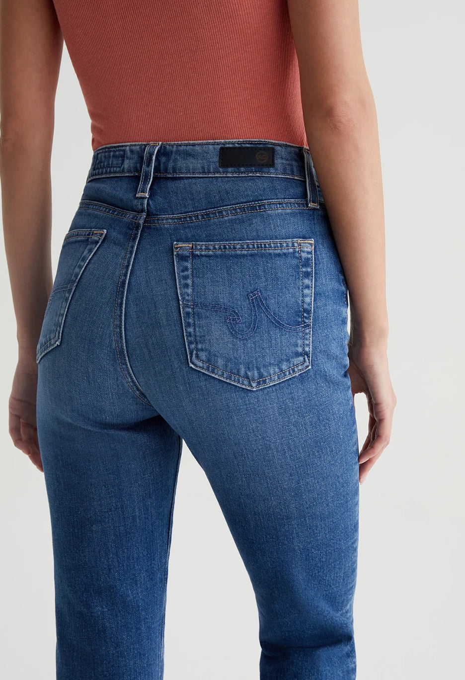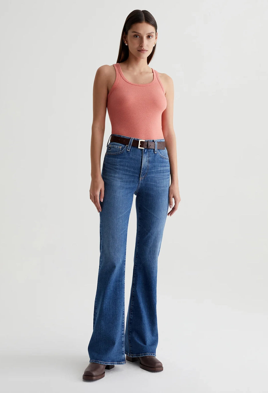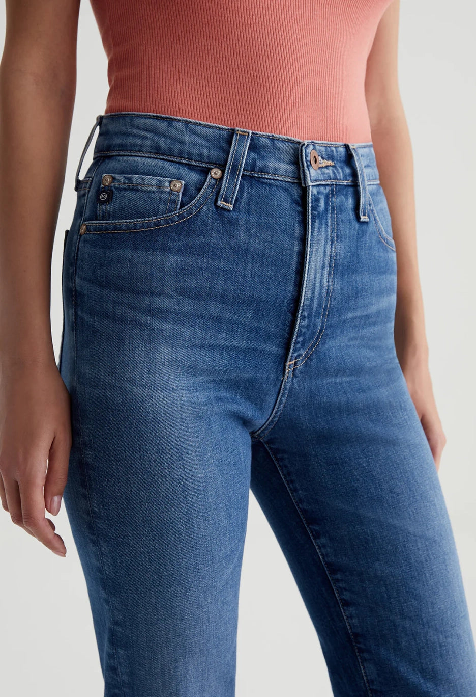 The Madi high-rise flare jeans have a '70s-inspired silhouette and a medium-indigo wash with the perfect worn-in fade. Crafted from stretch-blend 11 oz. Journey Denim, the style is designed to hug the hips and elongate the legs. The pair sits high on the natural waist and features an extended length that kicks out to a super-wide flare for a nostalgic fit that's incredibly flattering to the figure.
