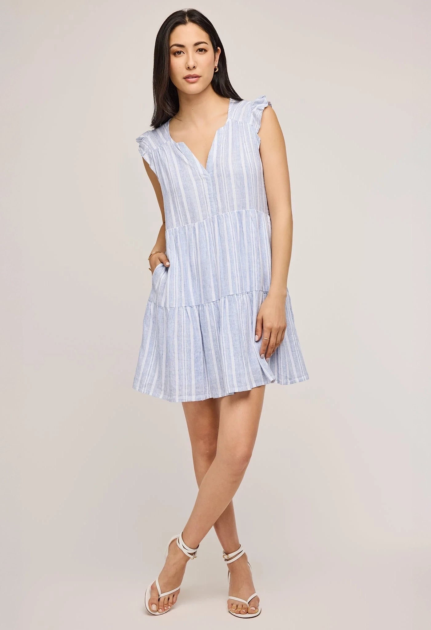 The Maggie dress is made of a lightweight linen blend fabric in a yarn-dyed stripe. Features include inseam pockets and skirt lining for ease of wear.