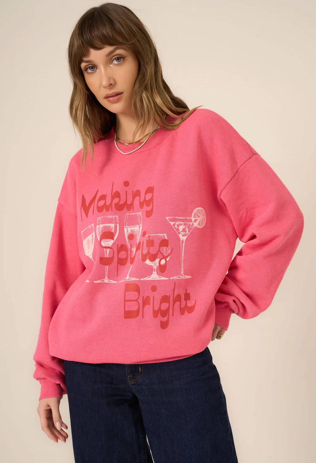 The Making Spirits Bright Sweatshirt is sure to spread holiday cheer with its festive design. Made from our soft fleece, this sweatshirt boasts a comfortable, relaxed fit, drop shoulders, and classic crew neckline. Its playful pink graphic adds a touch of retro style, making it a great choice for layering or wearing on its own during the holiday season