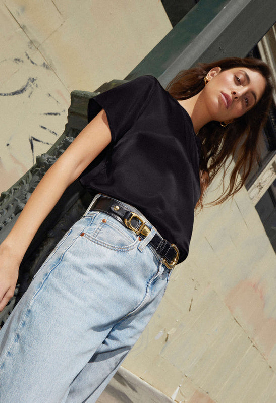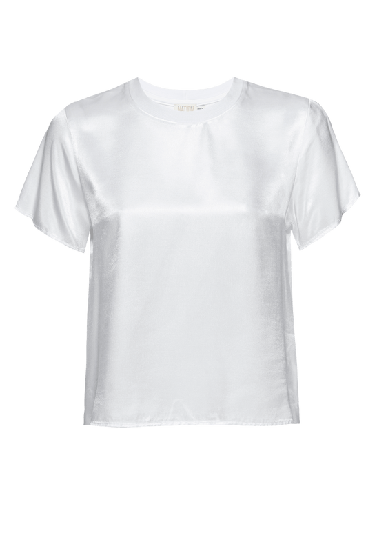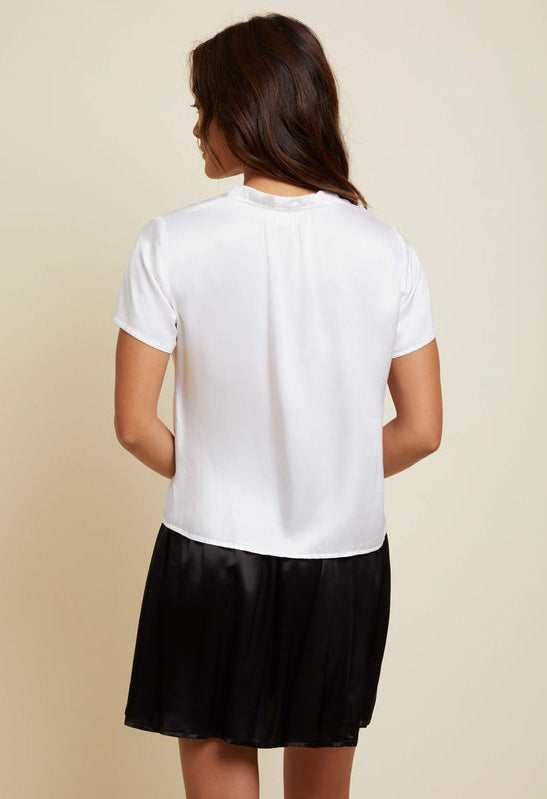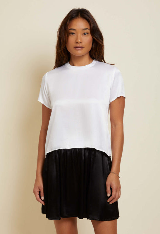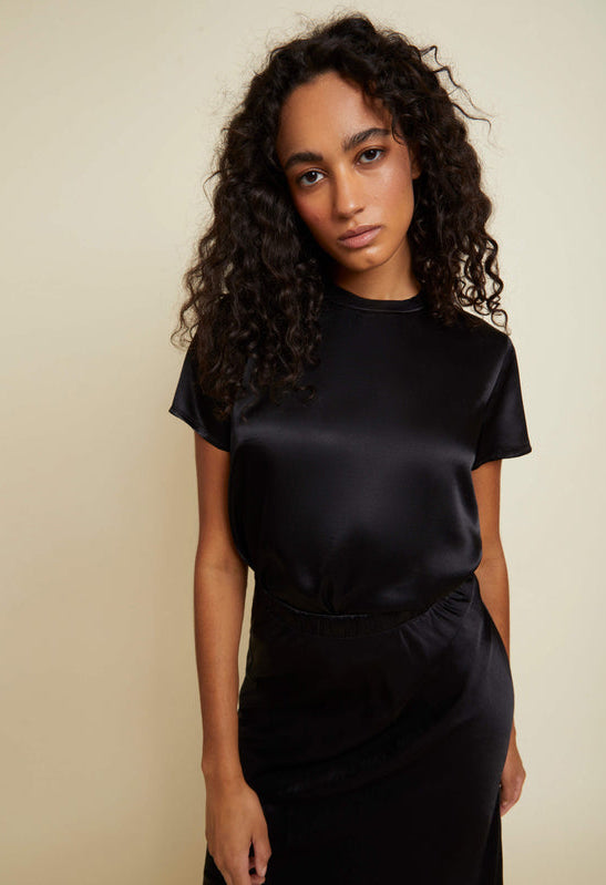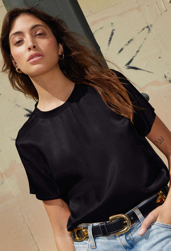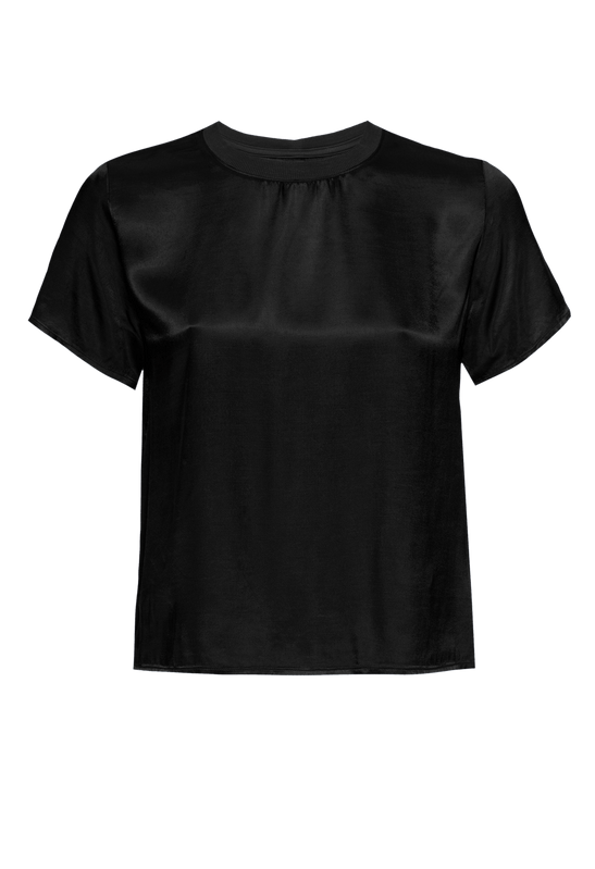 The dressed up version of your favourite laid-back, slightly cropped, black tee with a contrasting rib neckband.