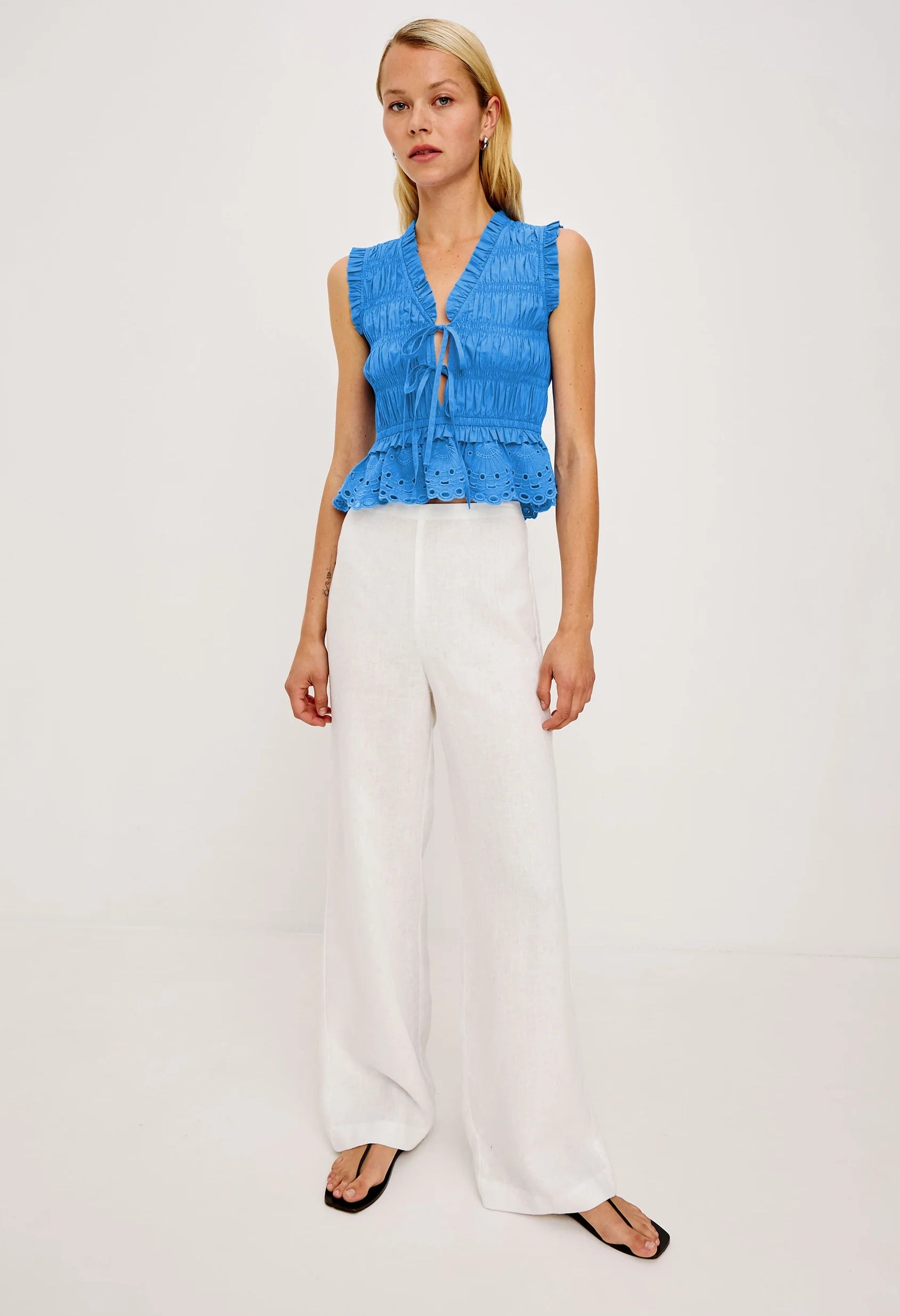 A structured peplum tank that commands attention. The Martine features a plunging neckline with adjustable front ties, crafted from substantial cotton poplin for lasting shape. Delicate ruffles add feminine detail to this statement piece.