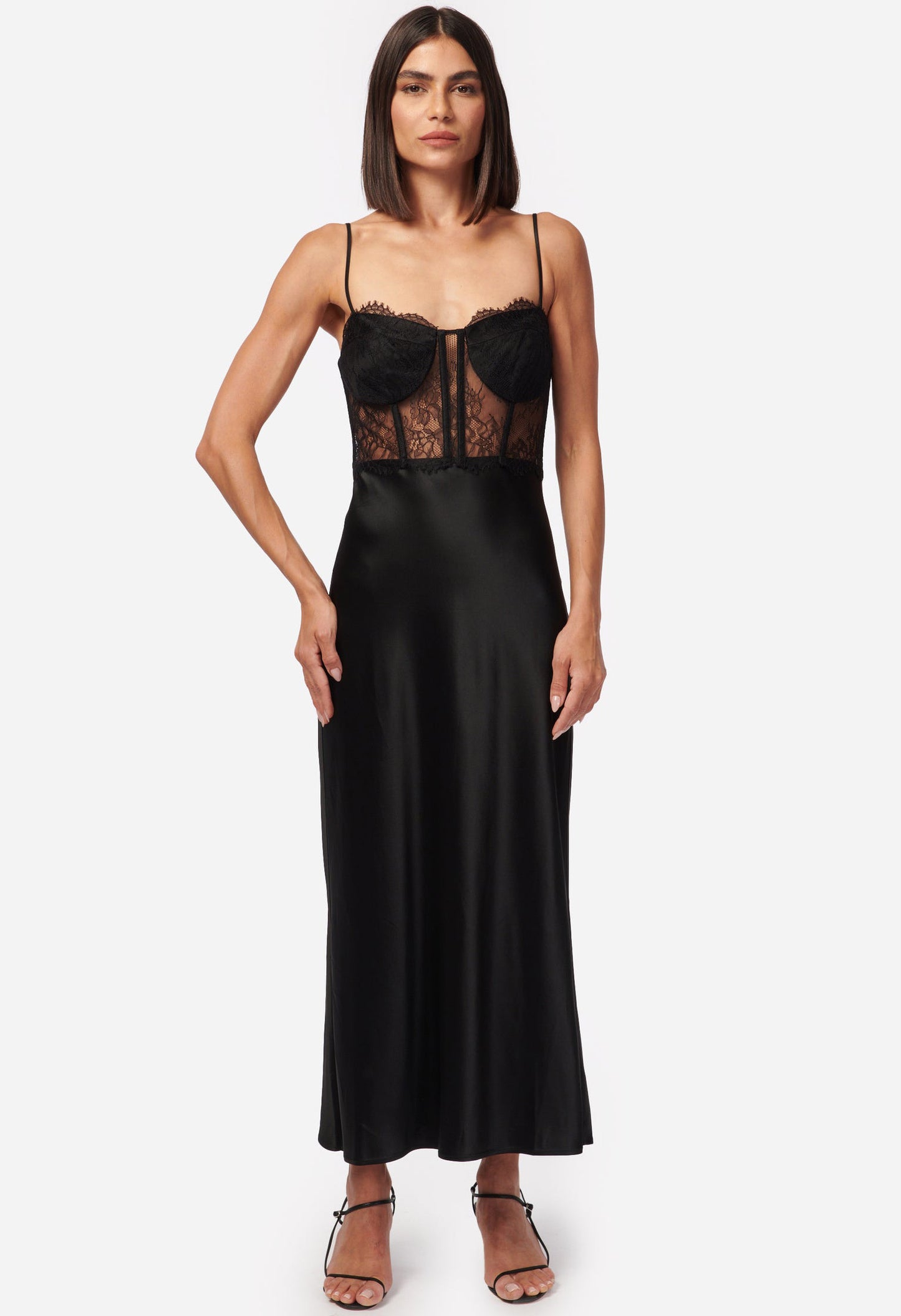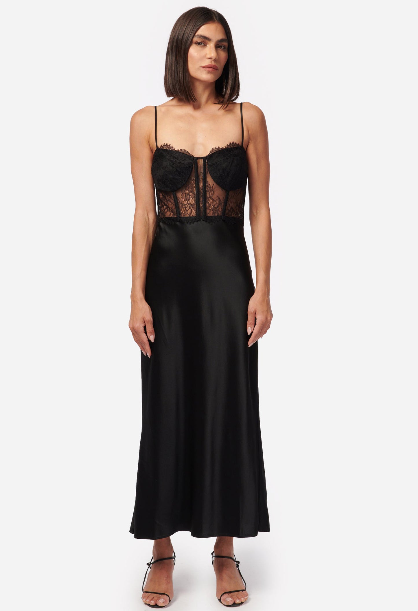 The Maureen Dress is soon-to-be your new favorite LBD. Designed with underwire bust cups and boning with a lace overlay for a supported fit. The Maureen features a bias cut slip style skirt for a sleek look. Finished with adjustable straps for a custom fit and an invisible zip closure at the back.