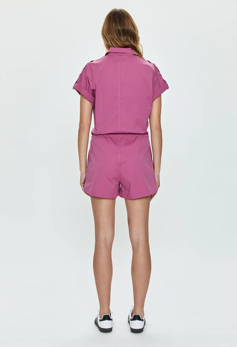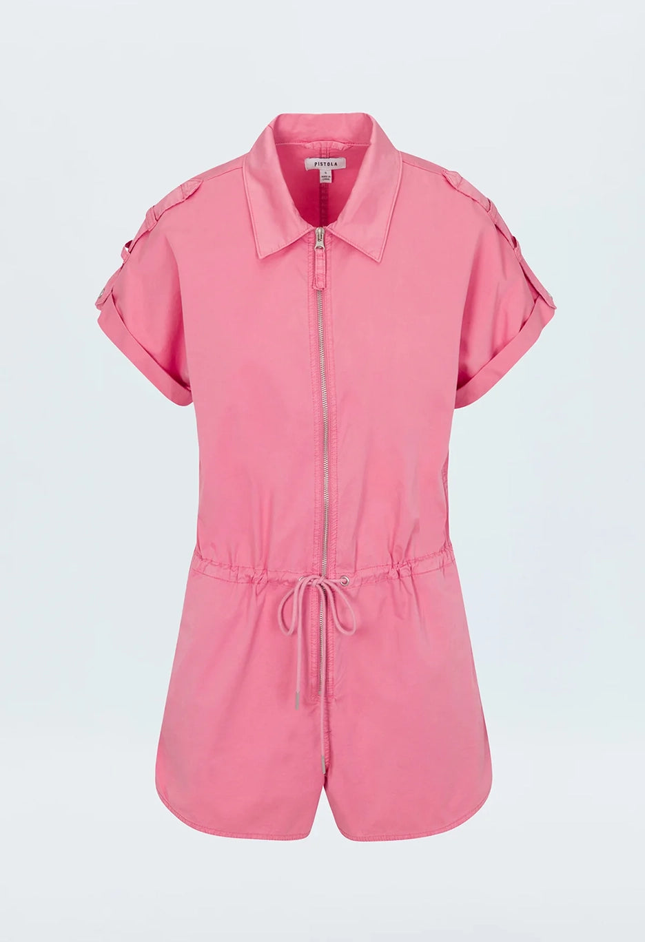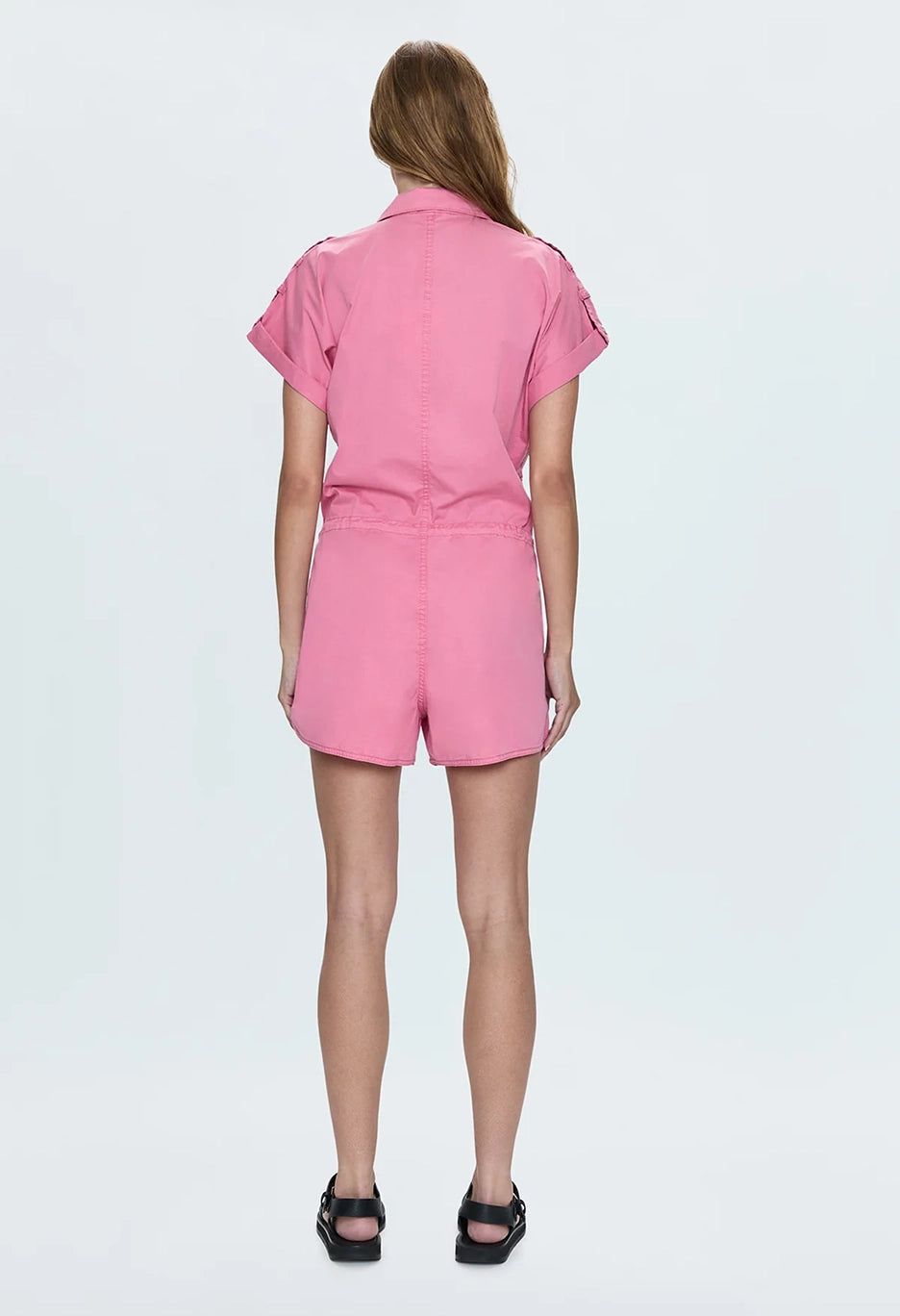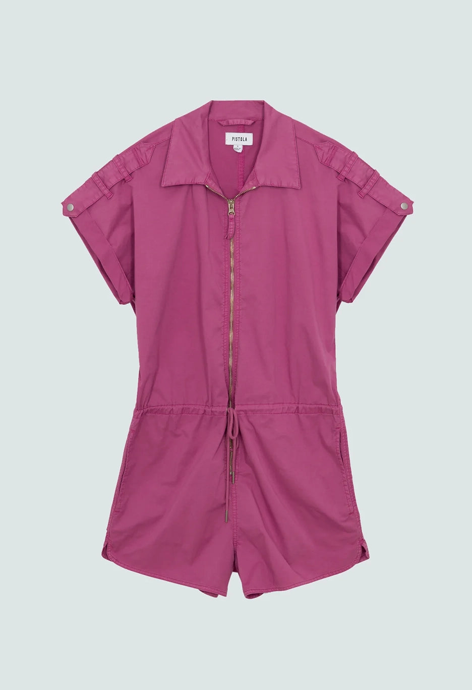Birds of a feather. Short sleeved field suit with zippered front closure and adjustable drawstring waist. Decorated with shoulder epaulettes and a collared neckline, crafted from a lightweight fabrication with a touch of stretch for endless wearability.