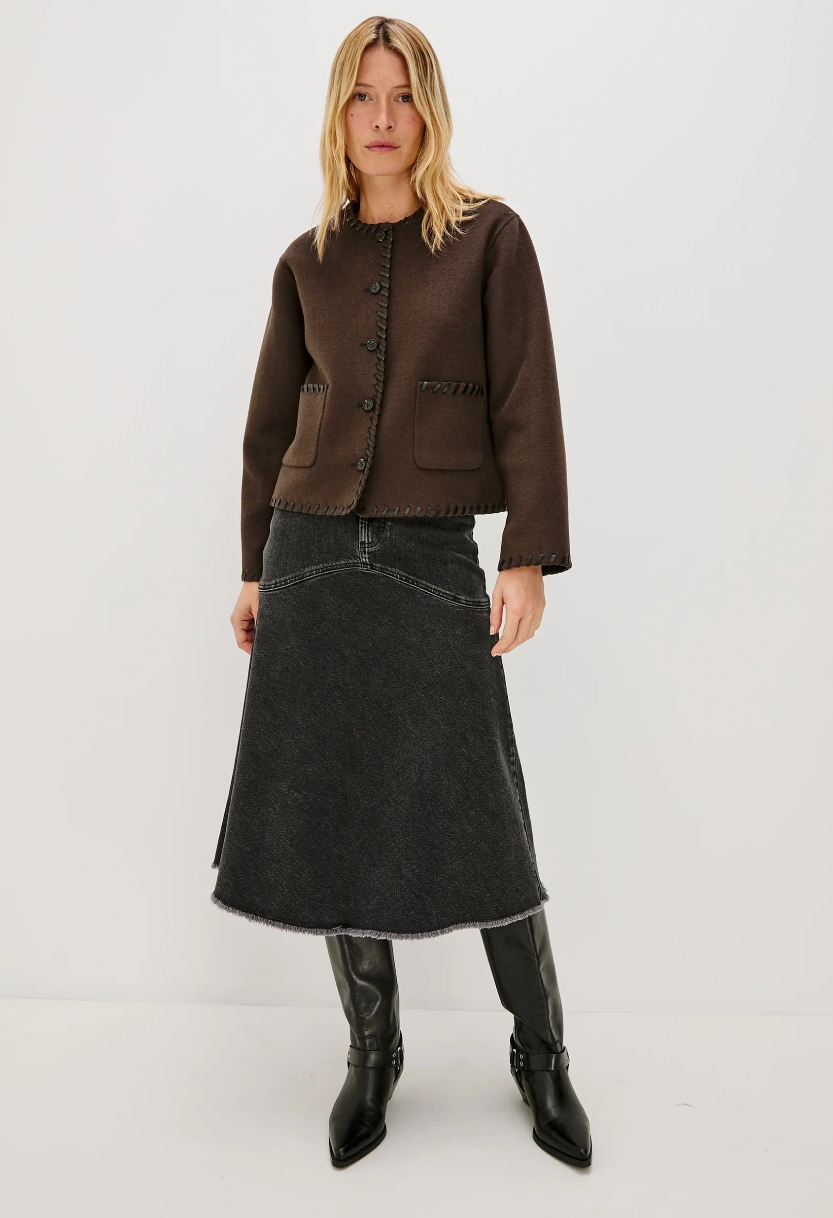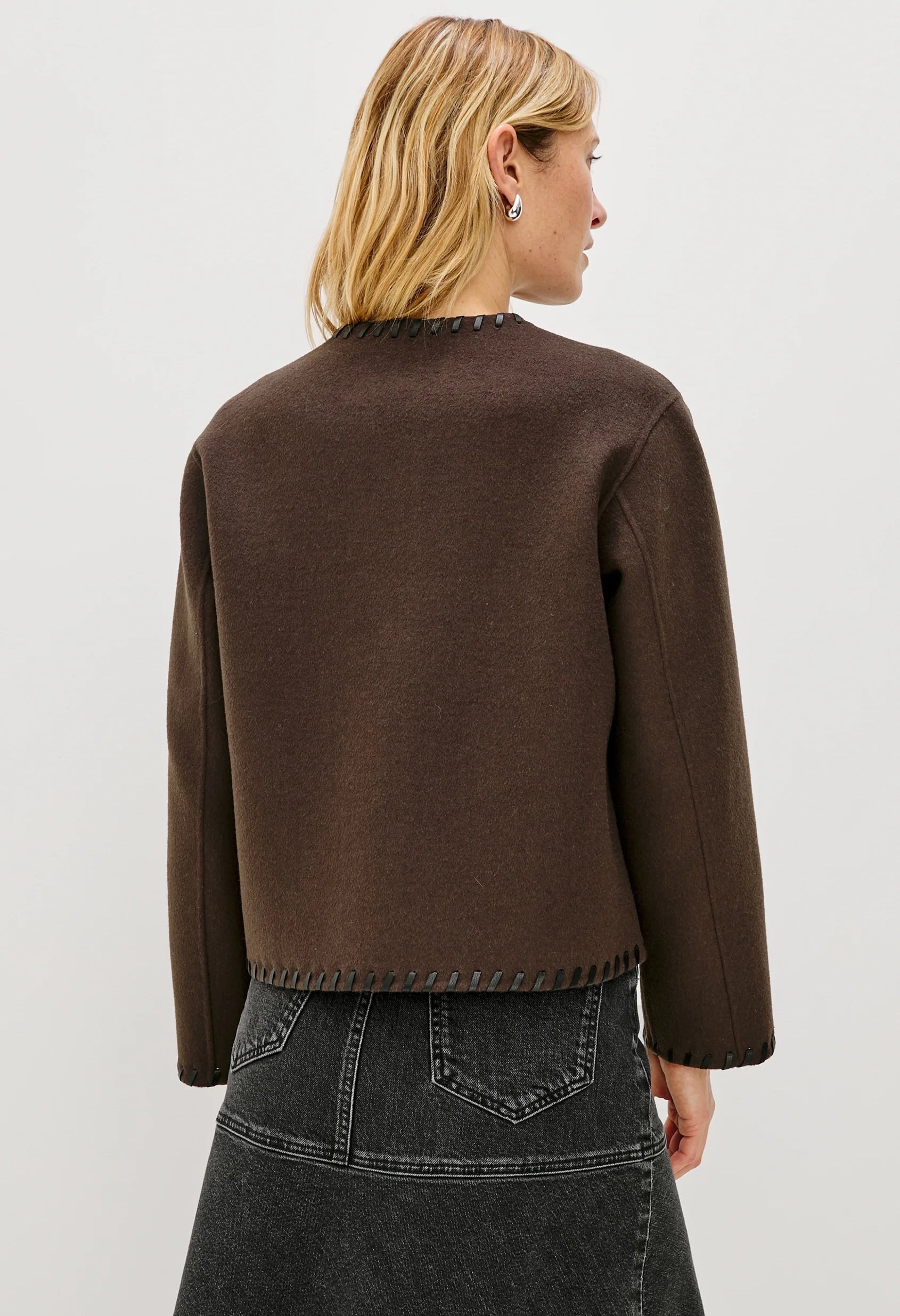 The Melanie is a heavy wool jacket that's both stylish and cozy. Its unique, put-together look is enhanced by contrast stitching at the seams, buttons, and a boxy fit.
