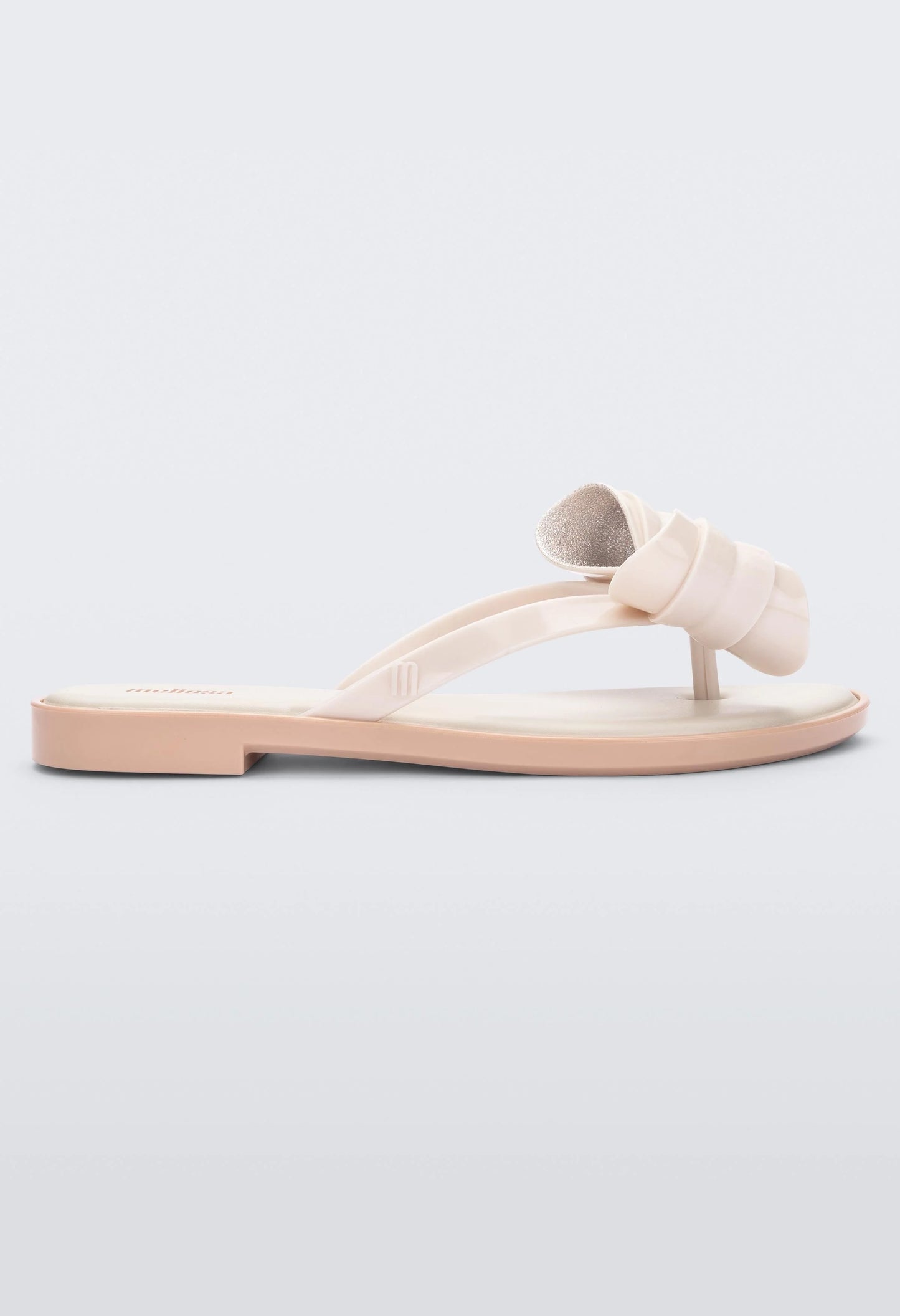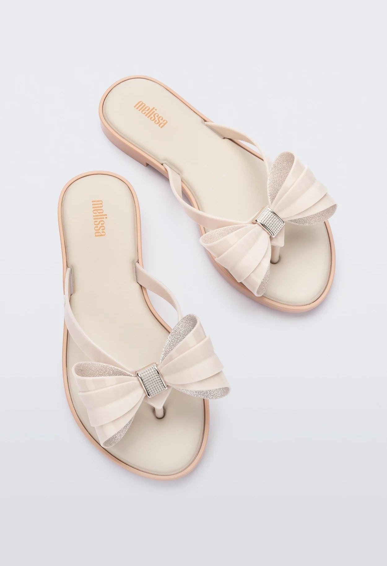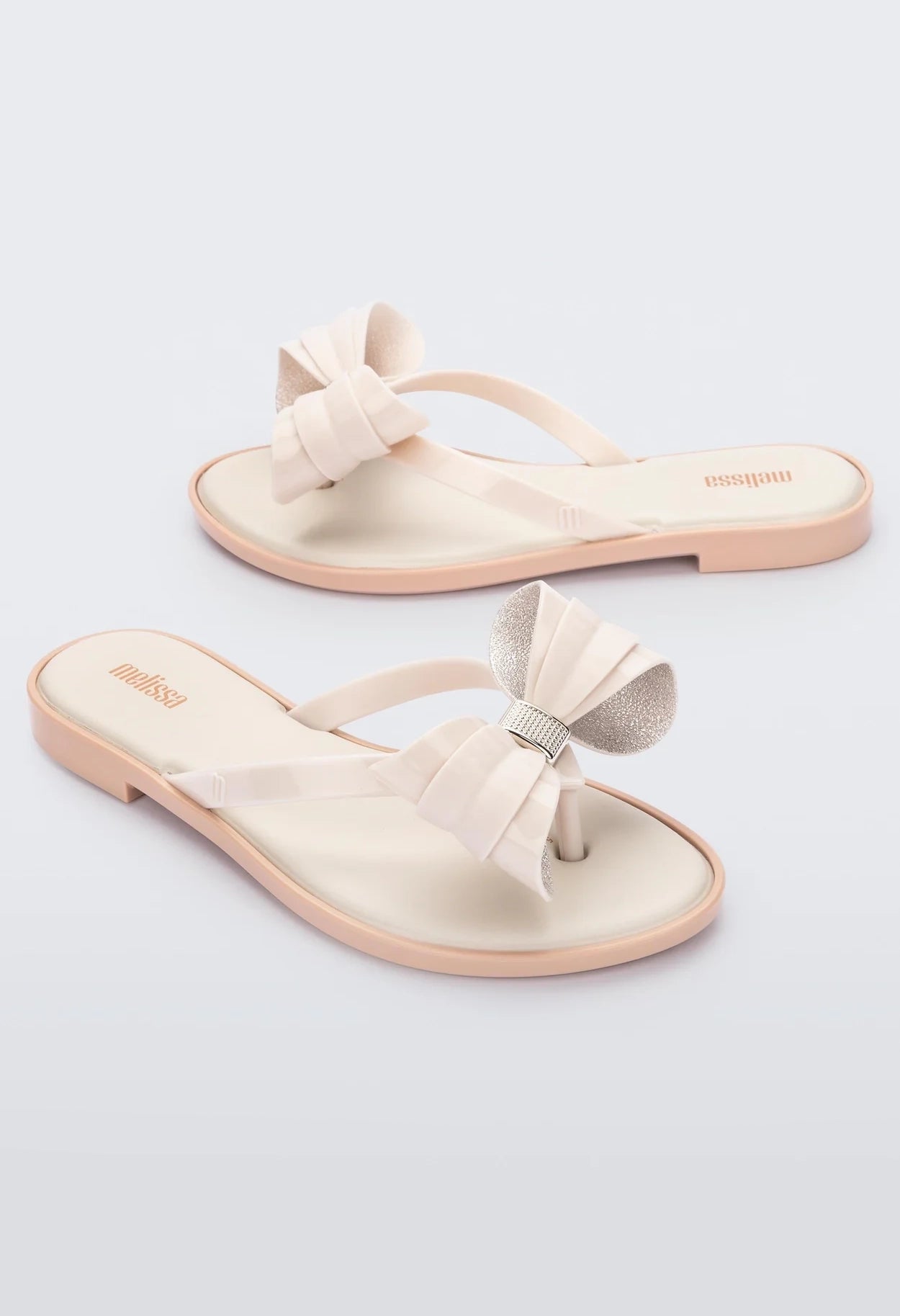 The Melissa Flip Flop Slim adds a touch of elegance and luxury with its charming bows, perfect for stylish lounging by the pool. With a soft footbed, metallic accents, and adorable bow details, these feminine sandals are the ideal choice for adding a bit of panache to your casual outfits. Experience the perfect blend of glamour and comfort.