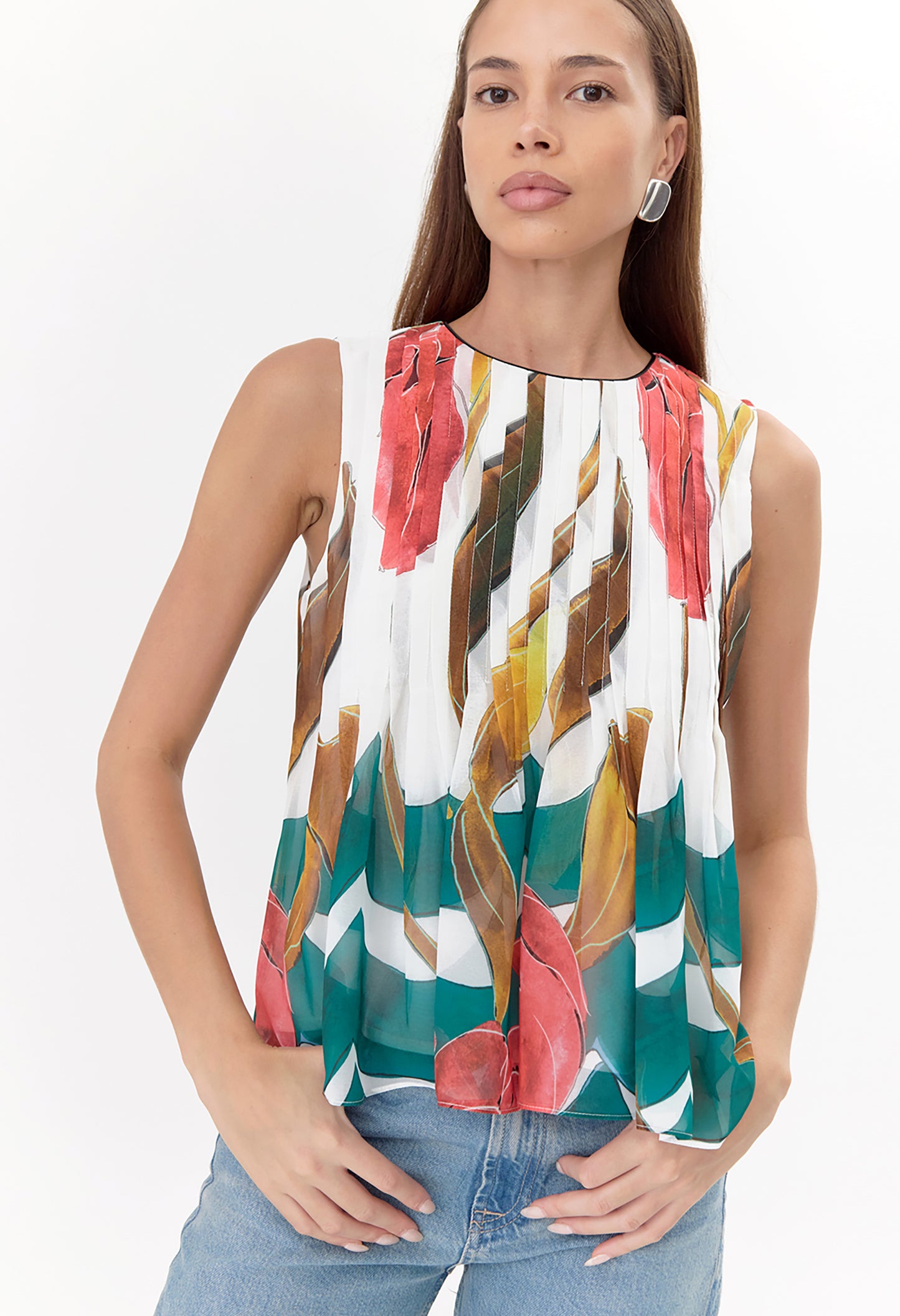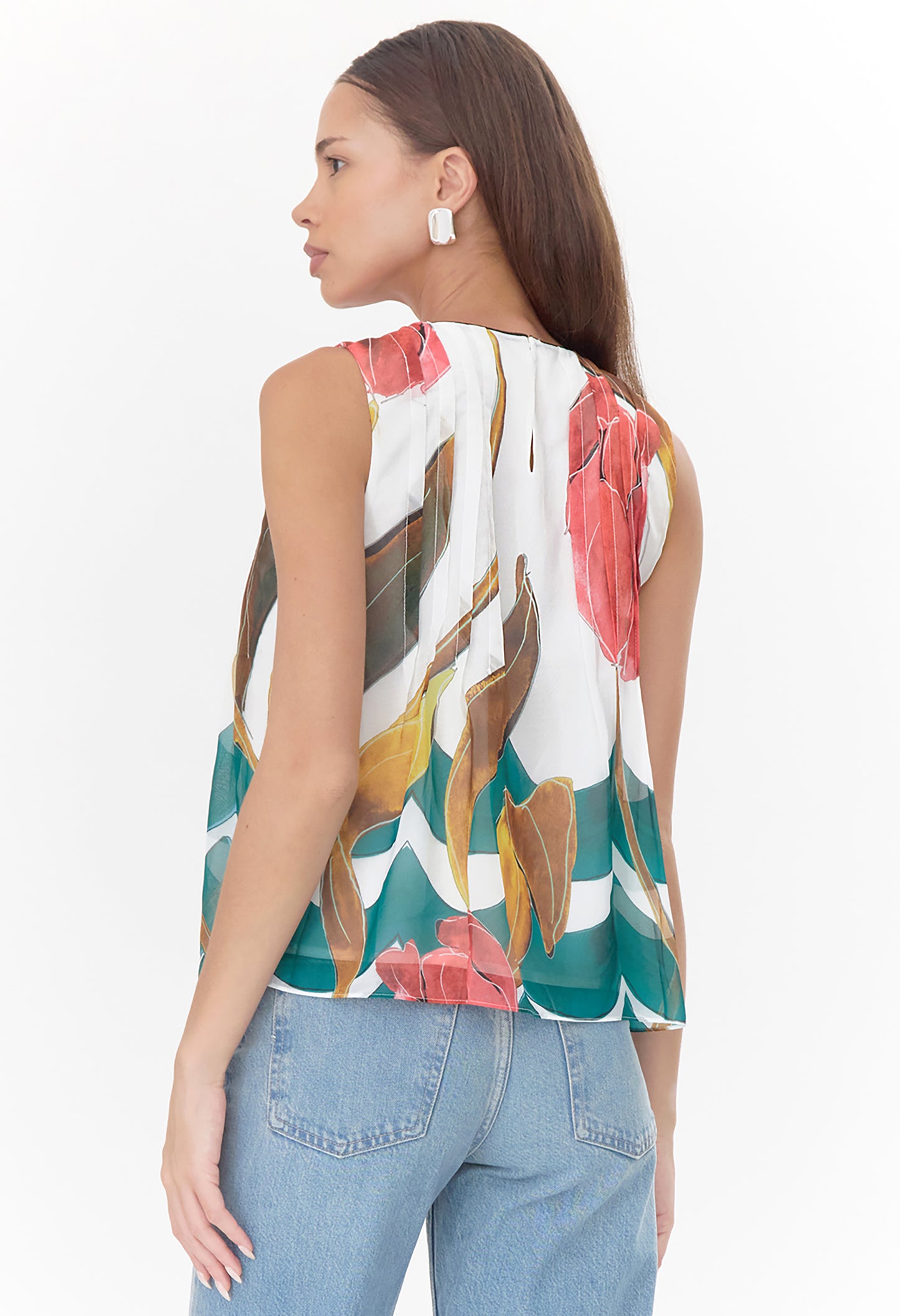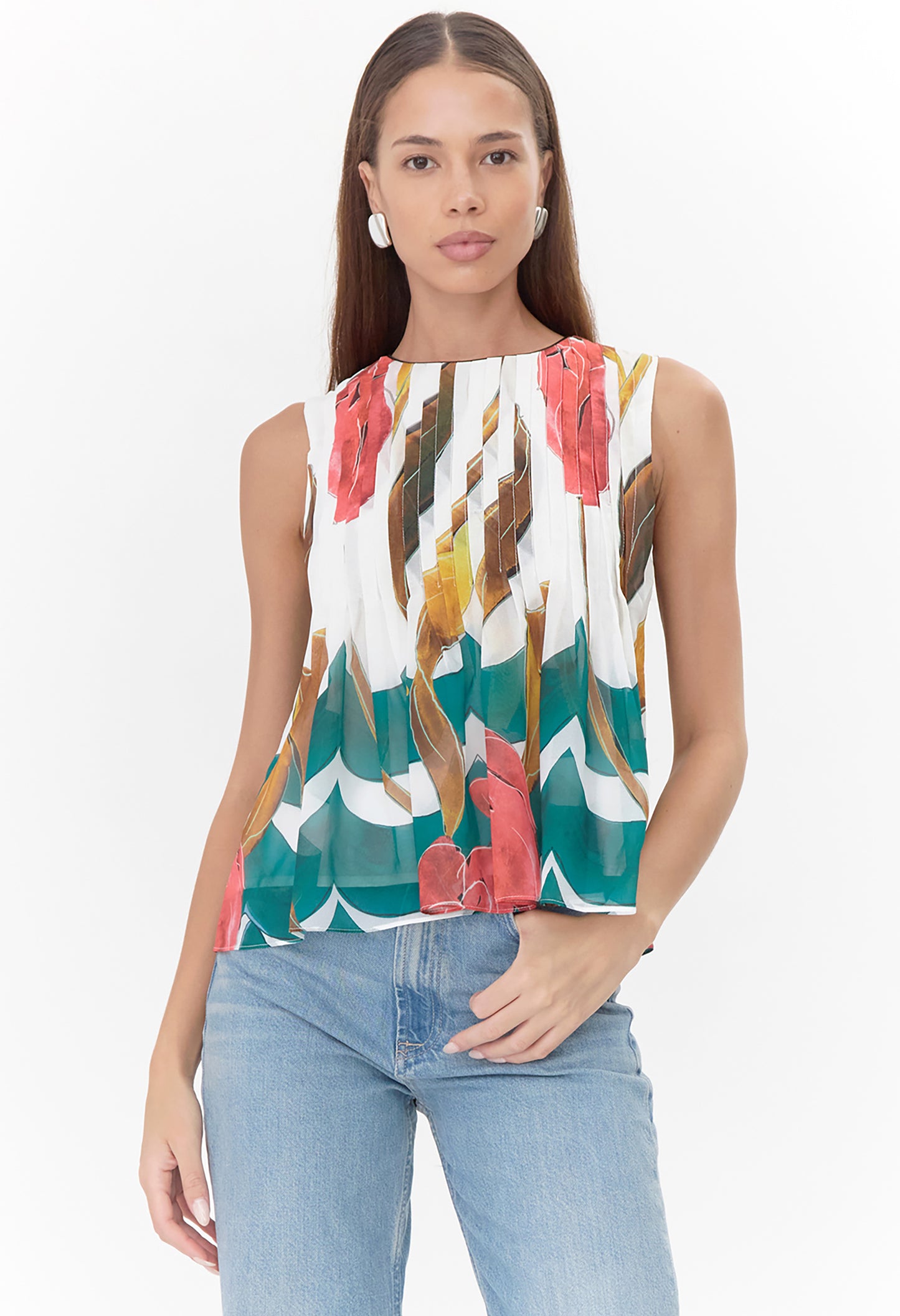 Effortlessly elevate your look with the Merida Pintucked Printed Peplum Top. Designed with a beautiful floral motif and pintucked detailing, this sleeveless top is a versatile addition to your wardrobe. Perfect for adding a touch of femininity to any outfit.