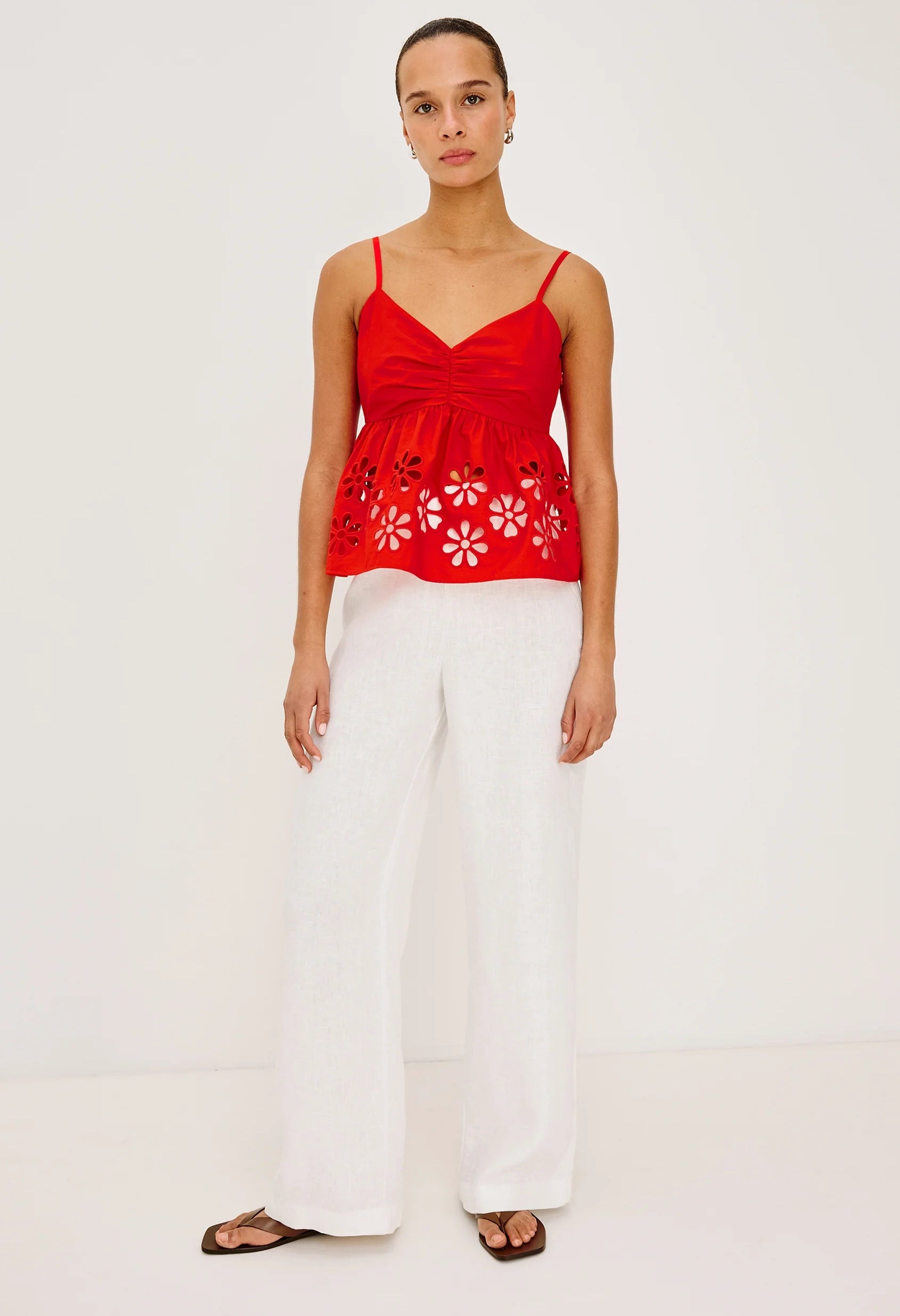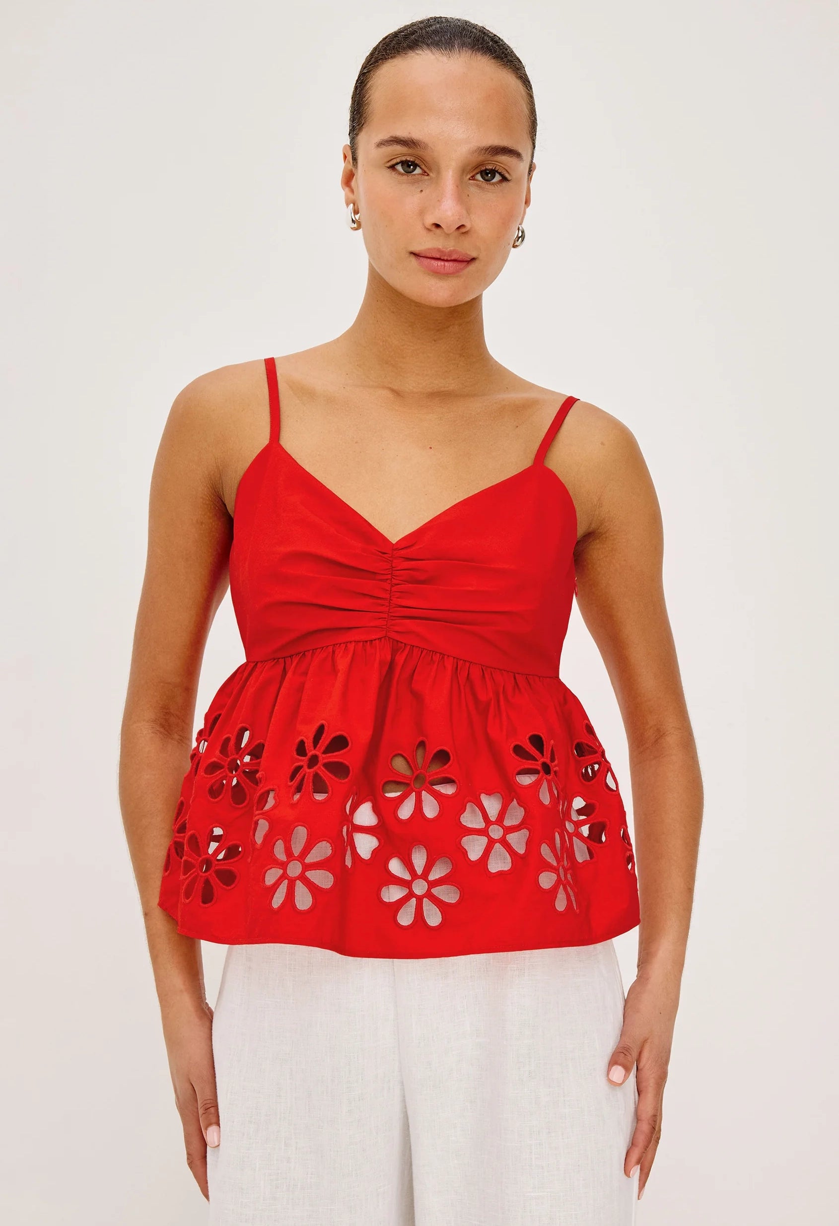 This elegant tank combines timeless style with thoughtful details. The crisp cotton poplin fabric drapes beautifully, while the V-neckline and gathered bust create a flattering silhouette. An empire waist provides comfortable structure, and the peplum hem—adorned with delicate floral embroidered cutwork—adds a sophisticated finishing touch.