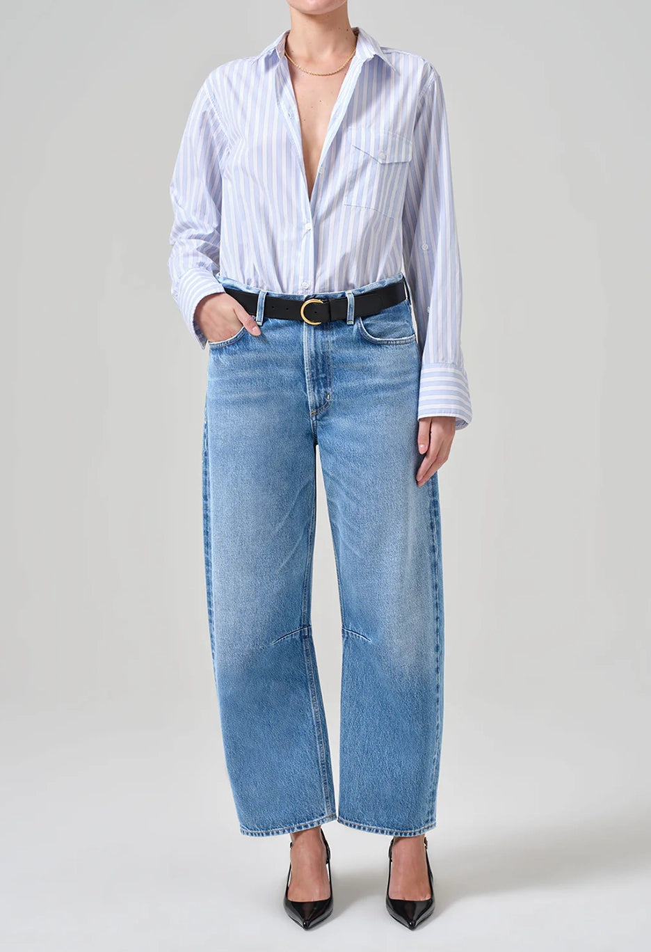 The Miro jean offers a slightly relaxed top block and tapered take on the barrel leg silhouette.