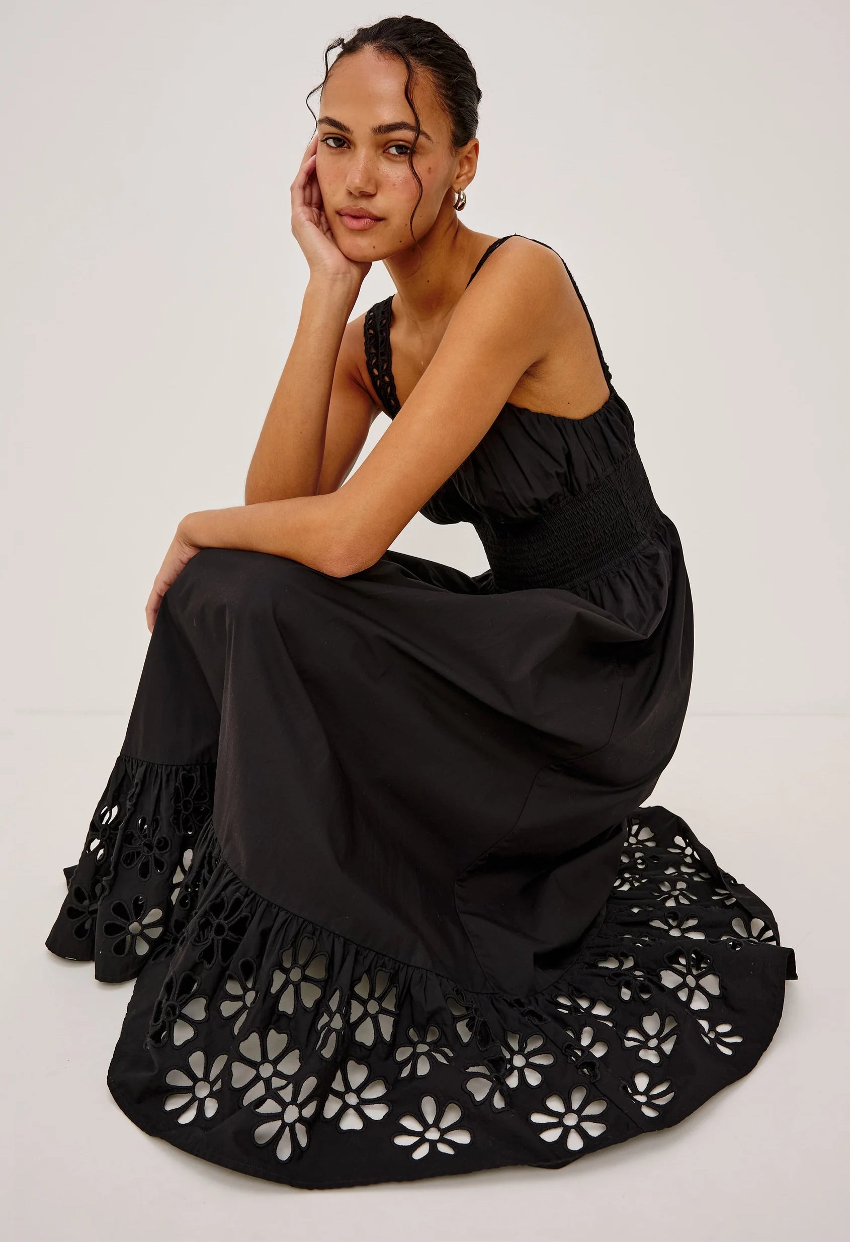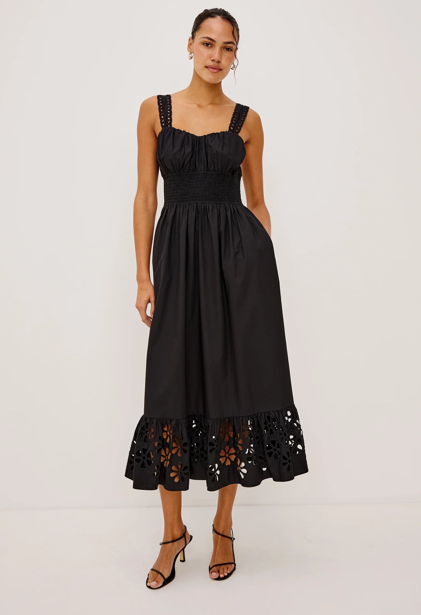 Crafted from crisp cotton poplin, the Moira midi dress combines timeless elegance with thoughtful details. Wide embroidered shoulder straps frame a soft sweetheart neckline, while shirring at the bust and smocking at the empire waist create flattering definition. The fully lined skirt features intricate floral cutwork at the hem for a delicate finishing touch.