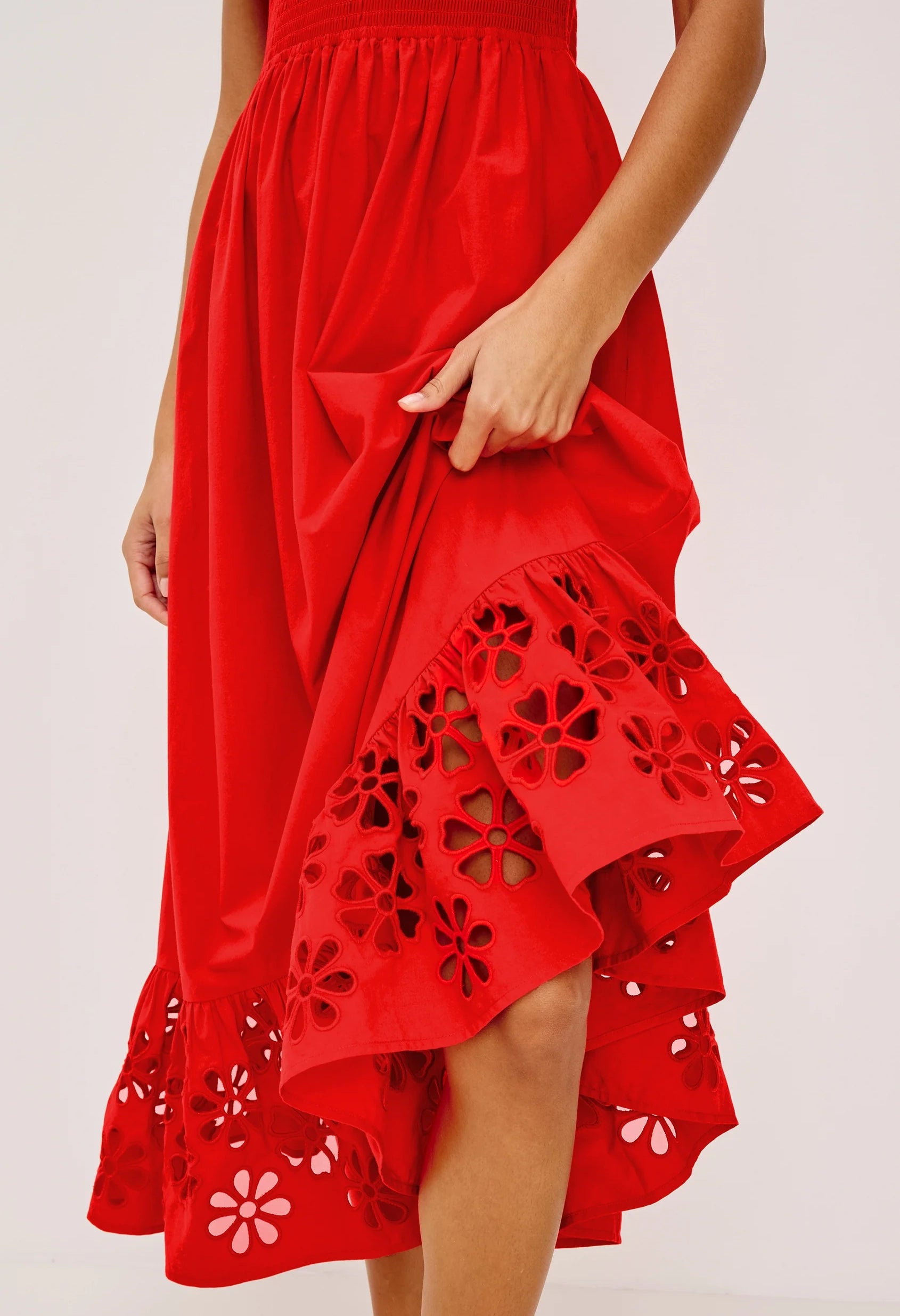 Crafted from crisp cotton poplin, the Moira midi dress combines timeless elegance with thoughtful details. Wide embroidered shoulder straps frame a delicate sweetheart neckline, while shirring at the bust and smocking at the empire waist create flattering definition. The fully lined skirt features intricate floral cutwork along the hem for a refined finishing touch.