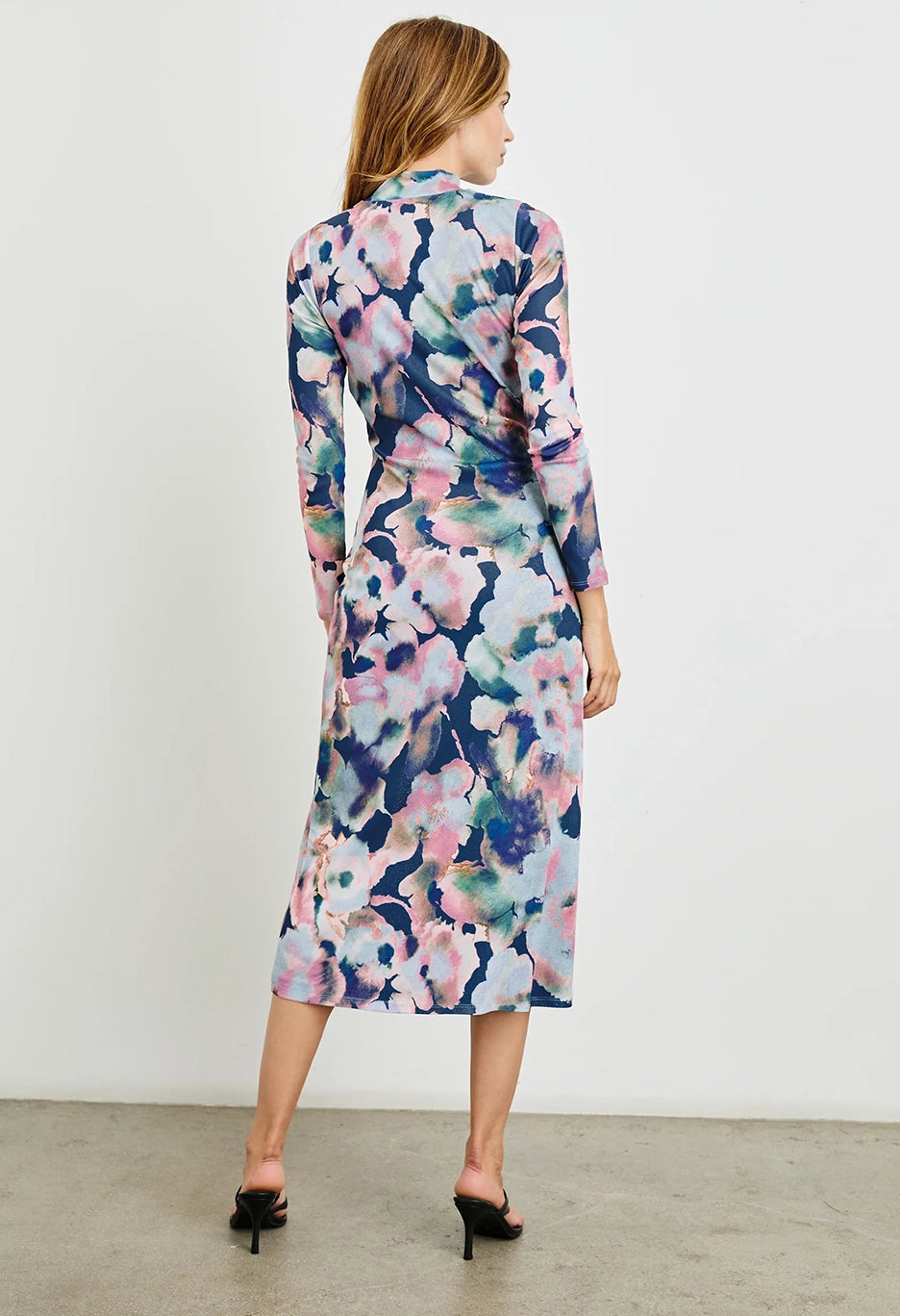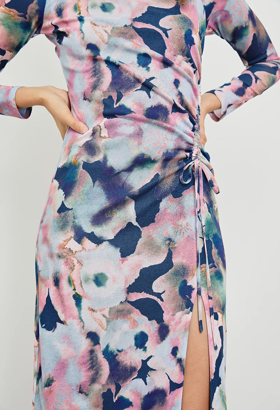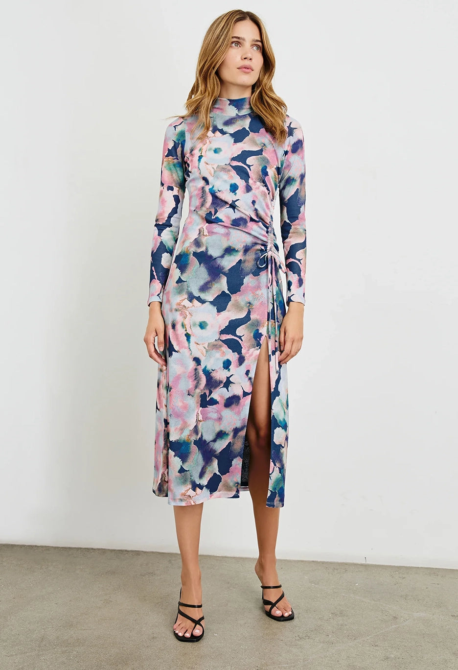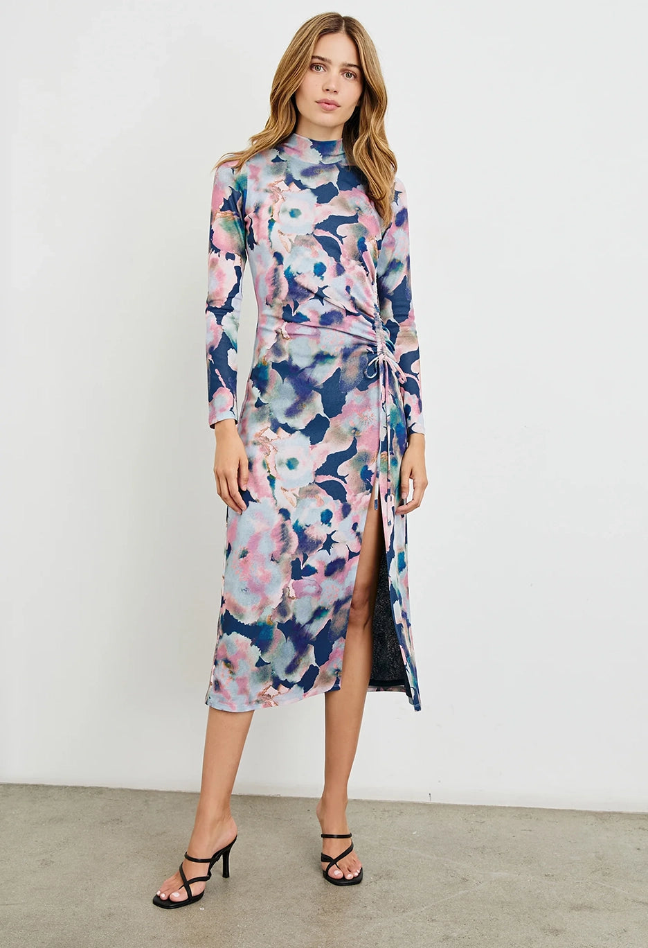 Add a pop of color to your wardrobe with this floral-printed beauty. Made from mesh, this high-collar dress features adjustable ruching at the thigh and an open leg slit. Pair yours with heels for an evening look or black boots to keep things casual.