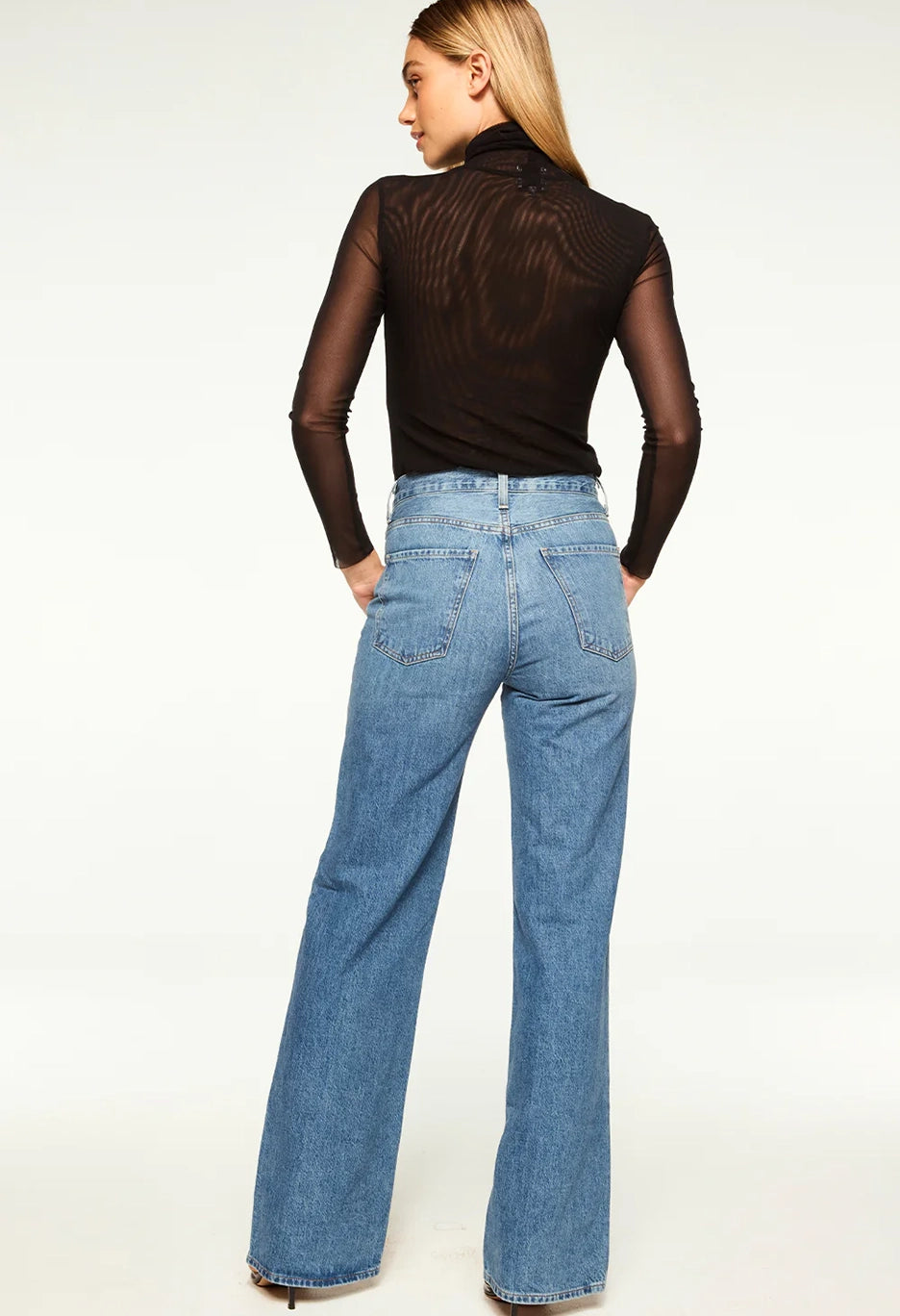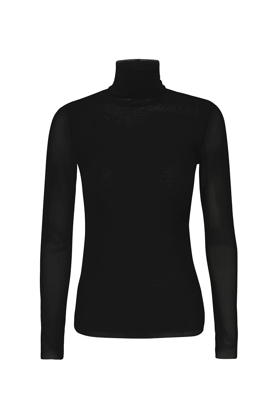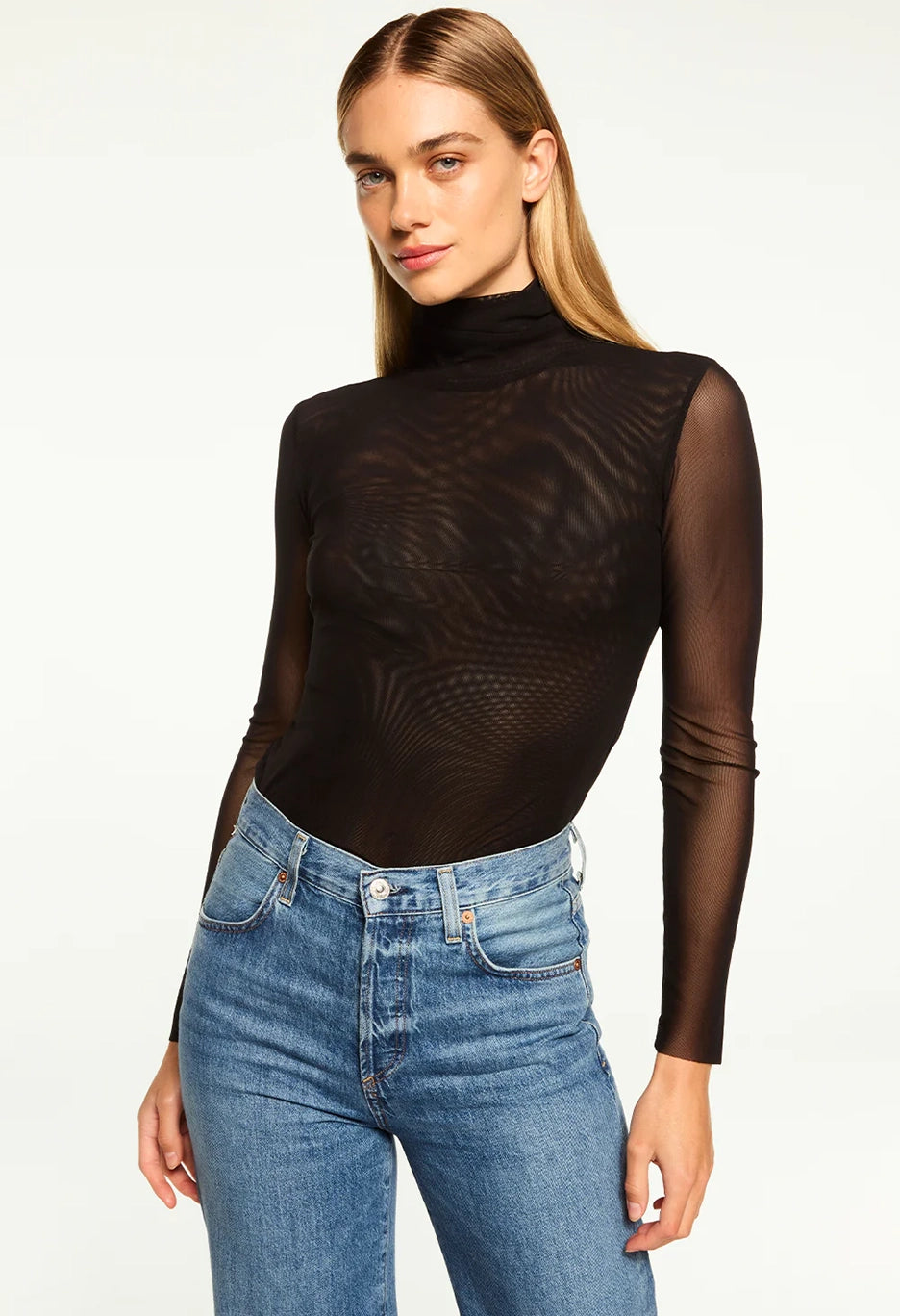 Upgrade your fall wardrobe with this fitted stretch turtleneck. Double lined at the body and featuring long sheer sleeves, this top is perfect for layering or wearing on its own. Its sheer material adds a touch of elegance to any outfit.