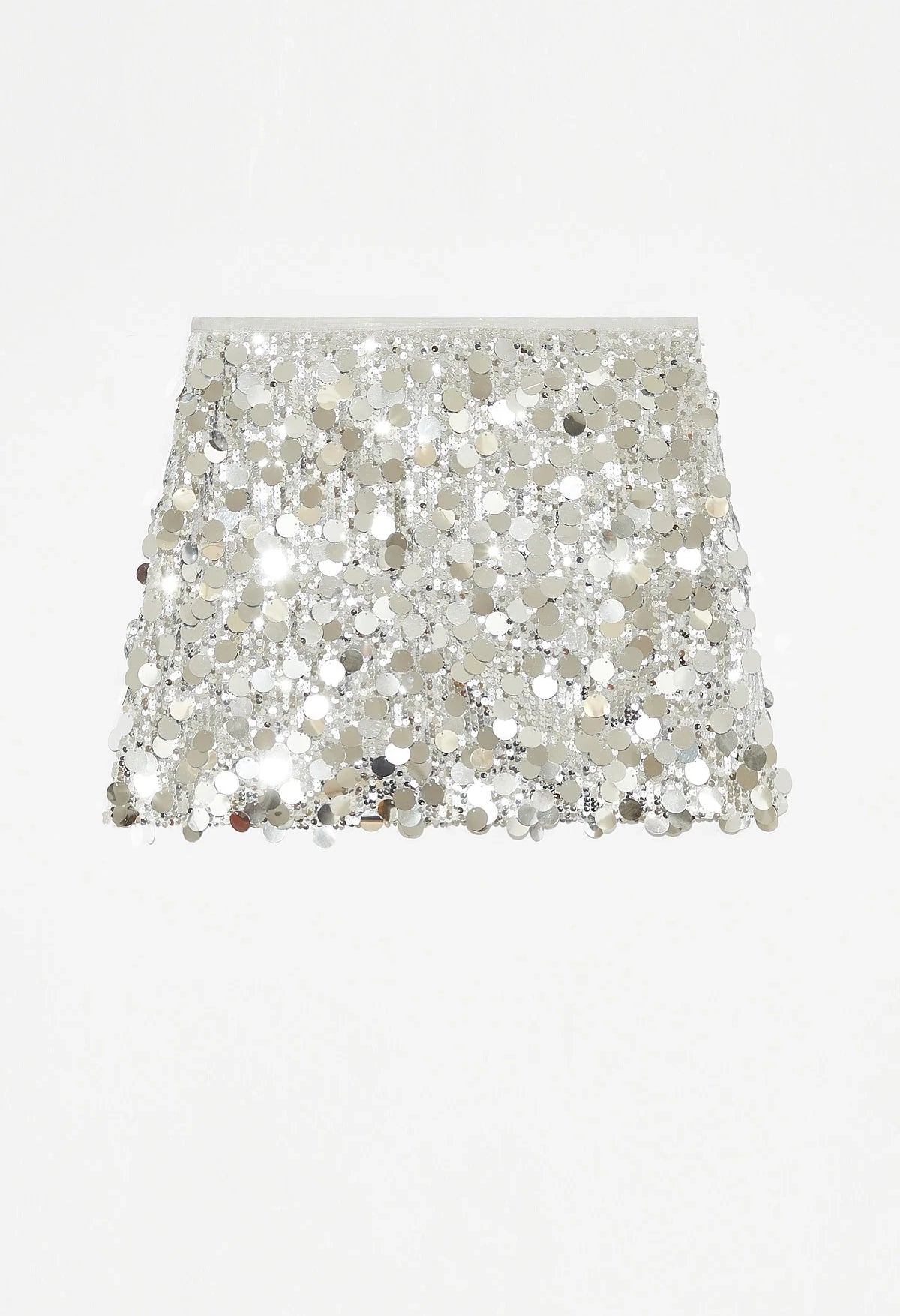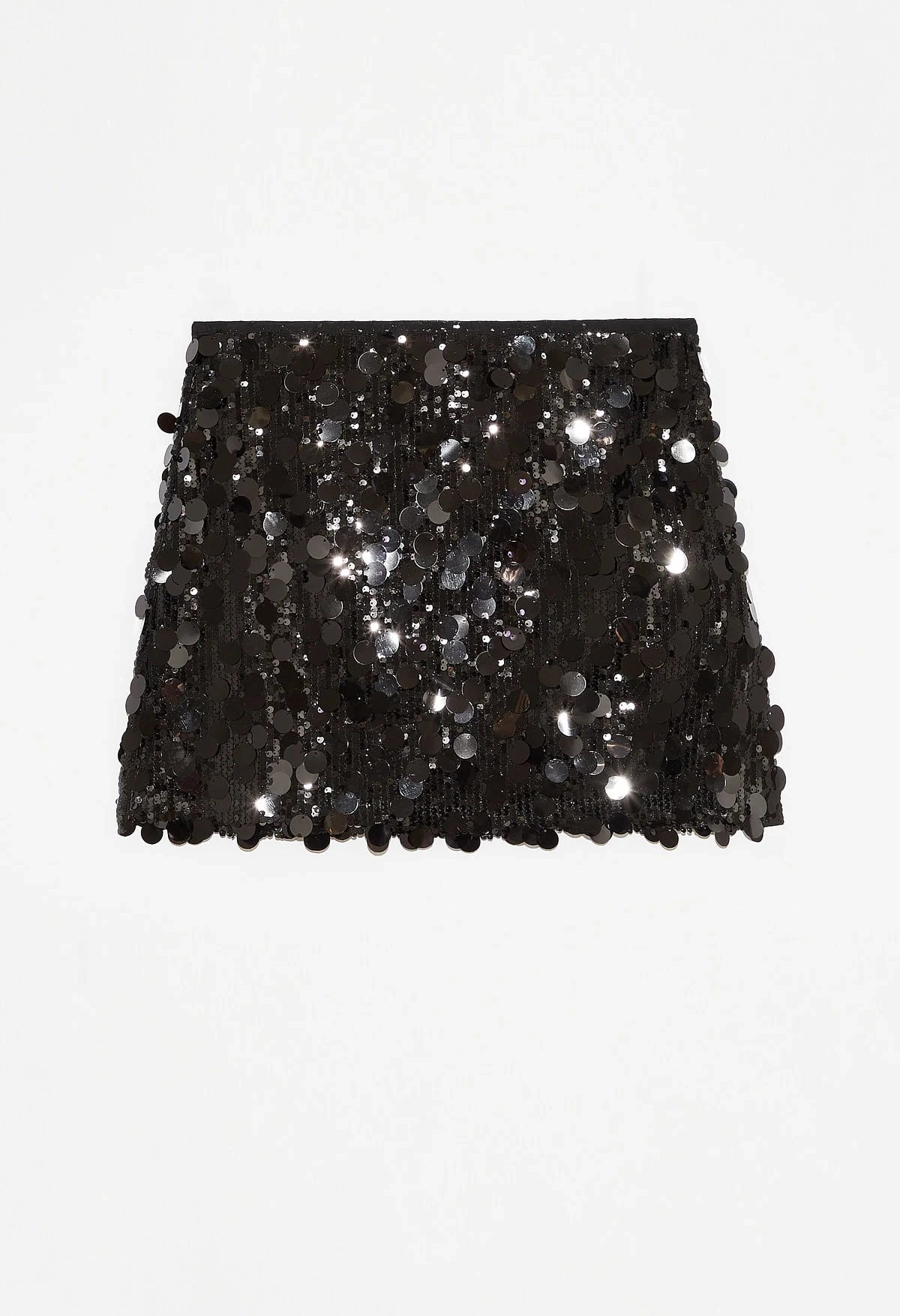 This Nandina Skirt features a trendy sequin design, adding sparkle and shine to any outfit. With its mini length, this skirt offers a modern and stylish look. Perfect for a night out or special occasions, the Nandina Skirt is a must-have in any fashion lover's wardrobe.