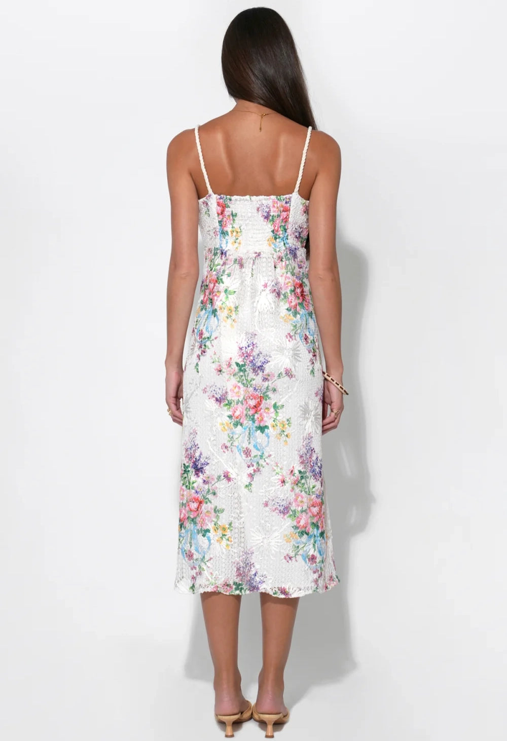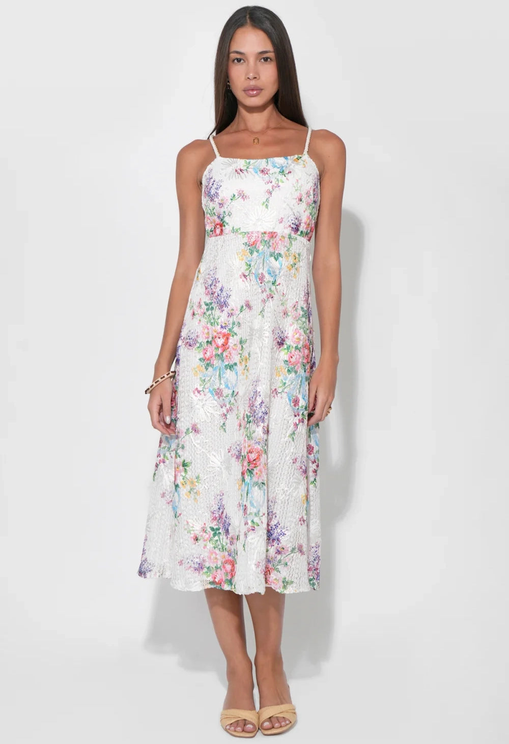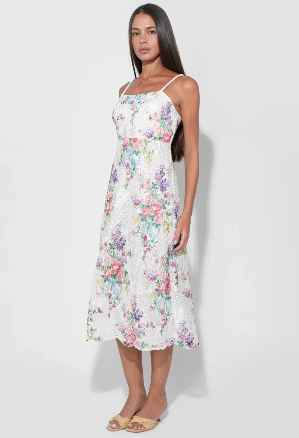 Ivory crochet embroidery dress with intricate three-dimensional floral detailing and braided accents. The Natalia features a flattering midi length with a blend of delicate sheer fabric and structured lining for a polished, comfortable fit. Perfect for elevated occasions where handcrafted elegance meets modern sophistication.