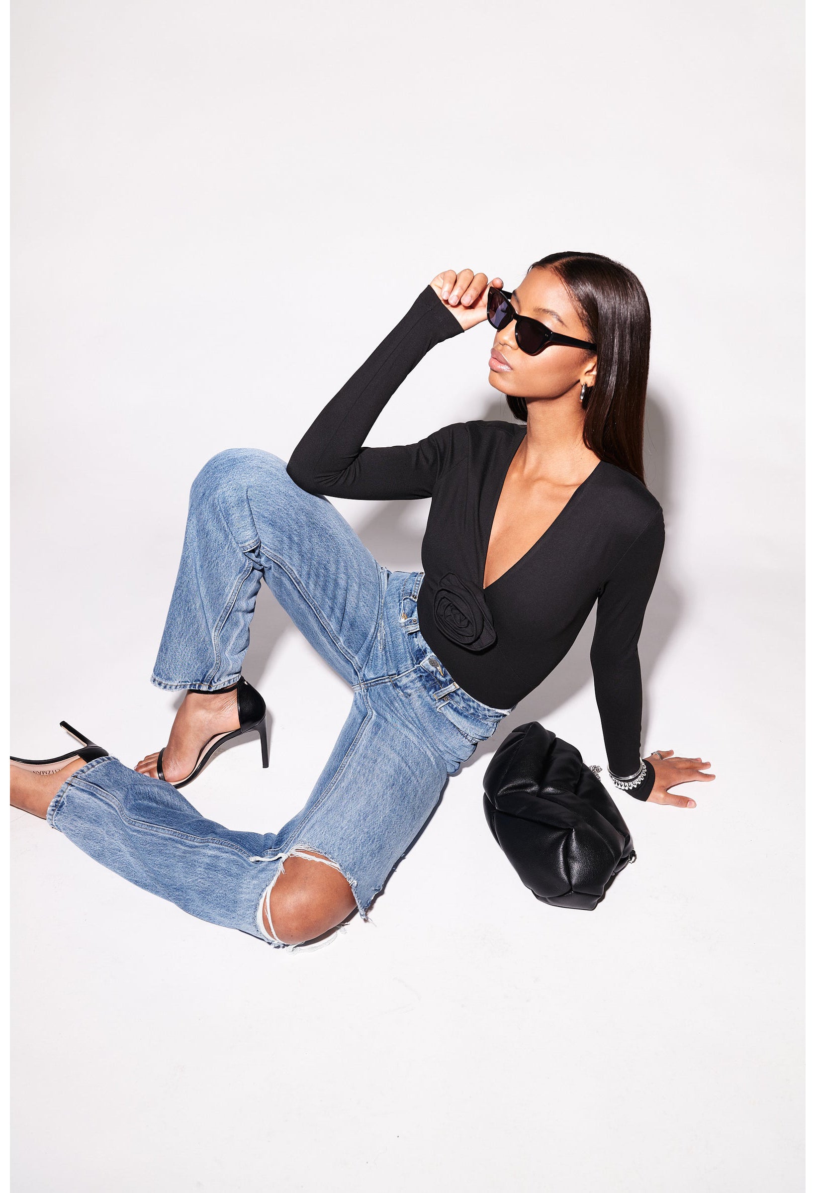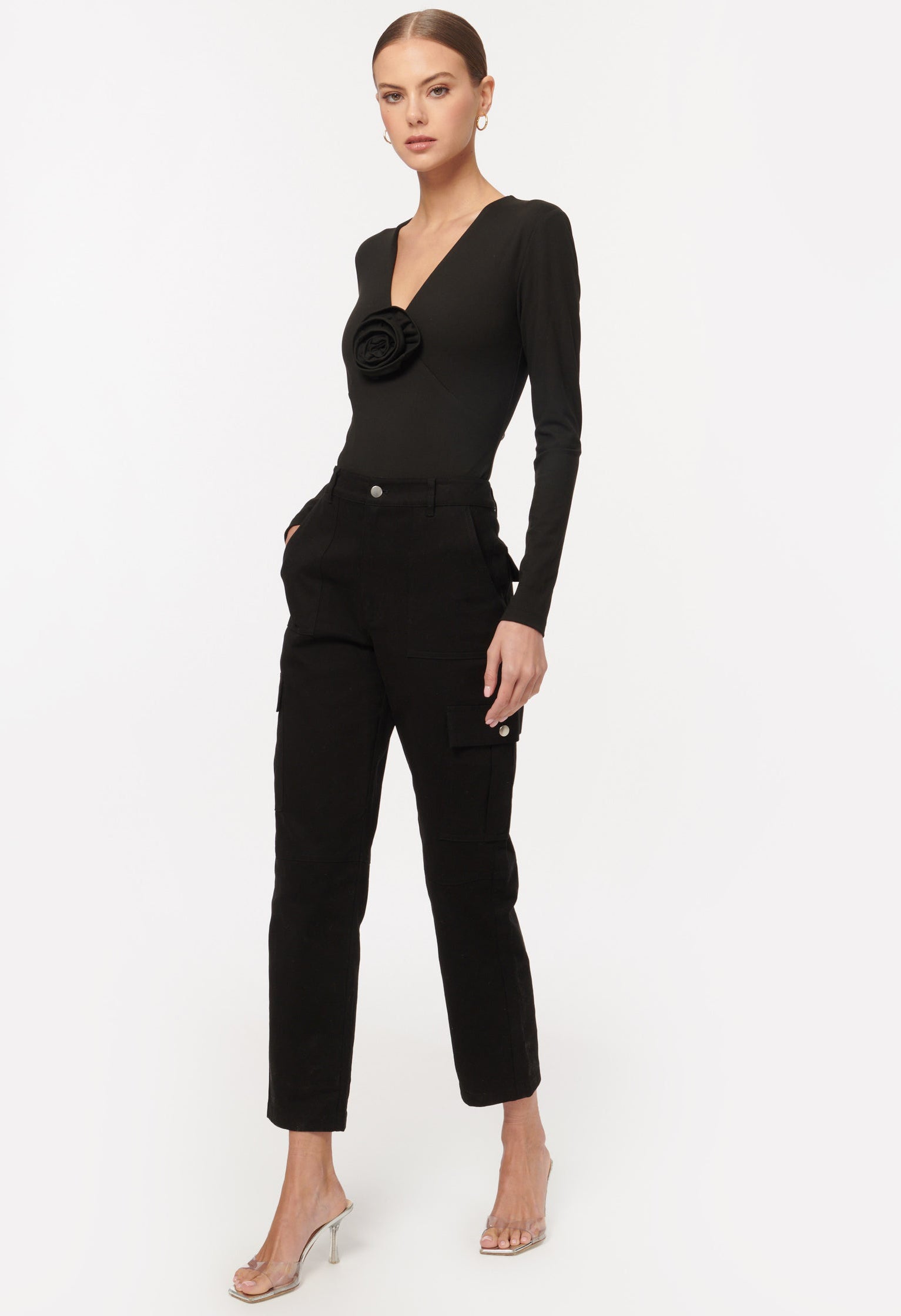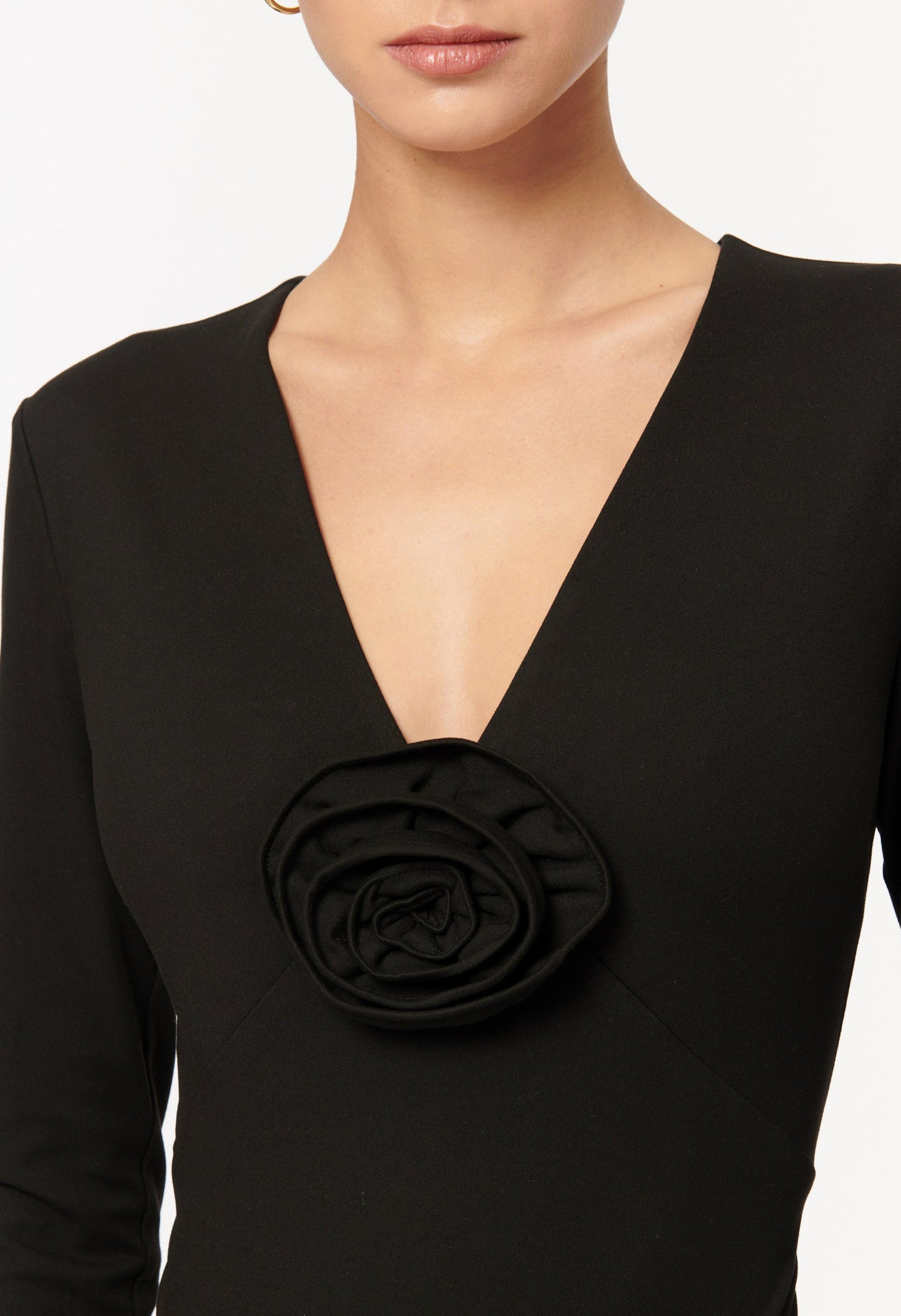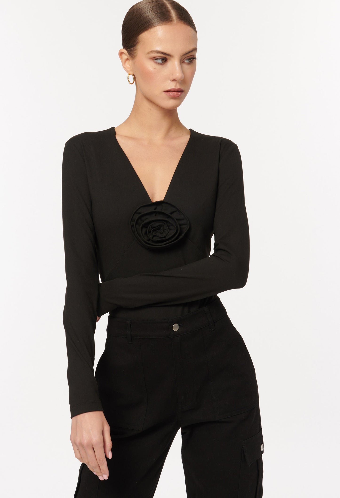 The Nohili is a perfect deep v-neck bodysuit featuring a feminine rosette trim at the centre front. The Nohili is fully lined and form-fitting.
