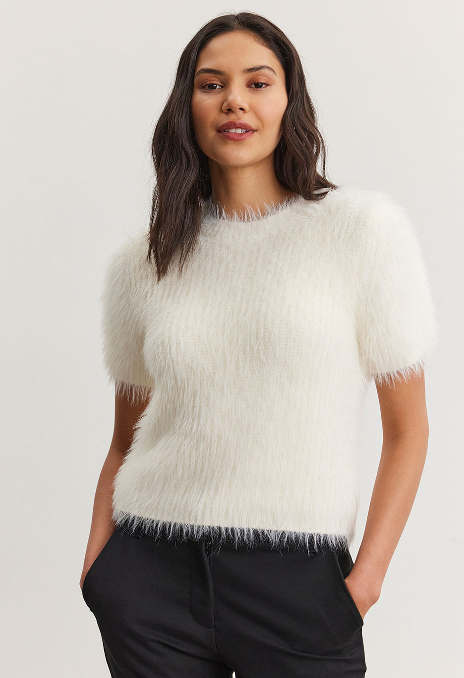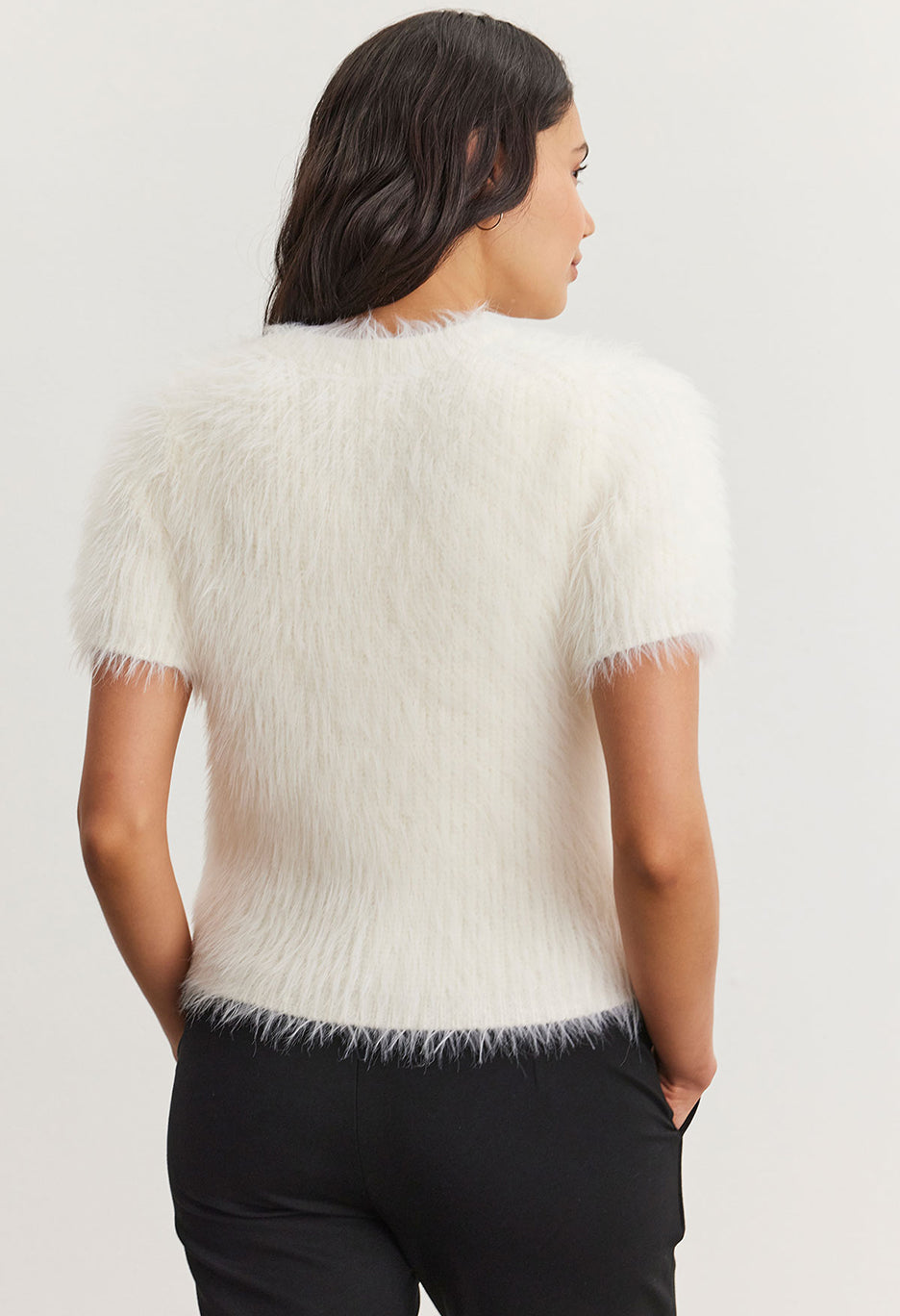Discover the luxurious comfort of Eila Novelty Feather Yarn Top. Made with ultra soft feather yarn, this short sleeve sweater is the perfect blend of style and comfort. Experience the ultimate softness and indulge in a cozy day wearing this top.