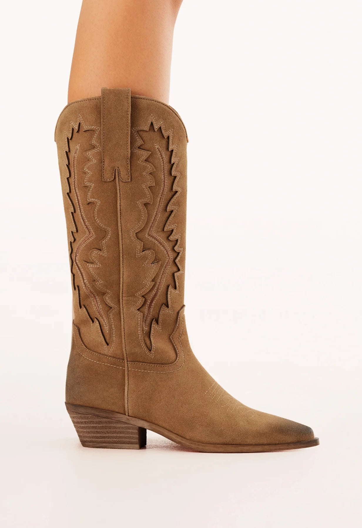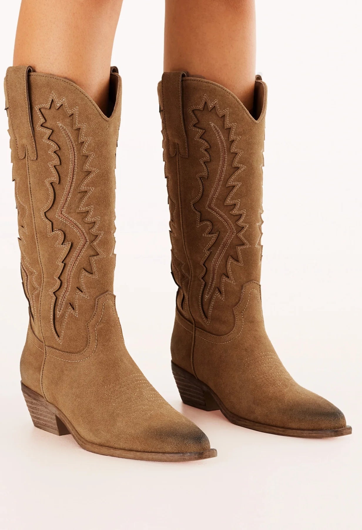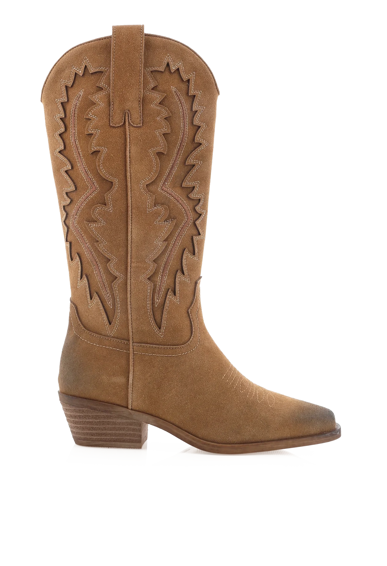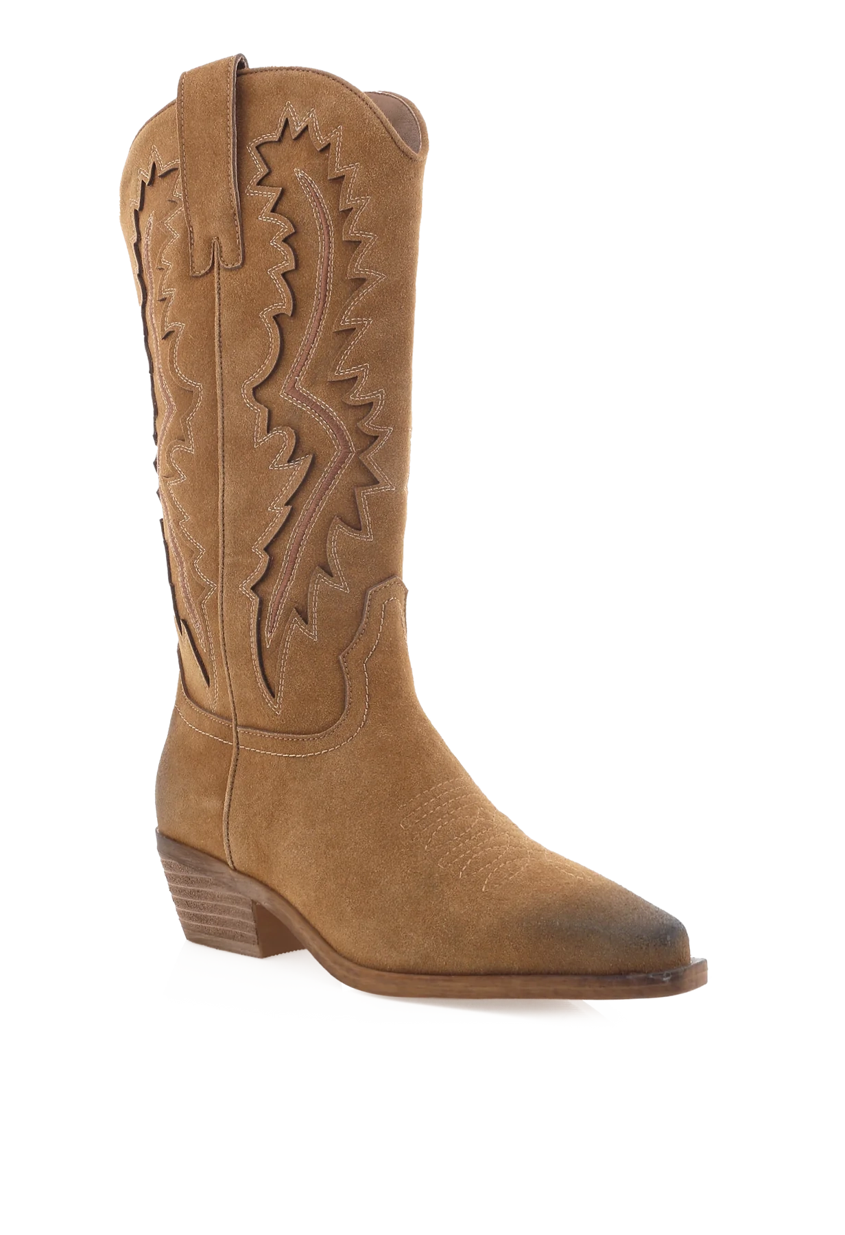 Enhance your wardrobe with Olea - Tan Suede cowboy boots! These fashionable boots made from premium tan suede are great for a country chic appearance.
