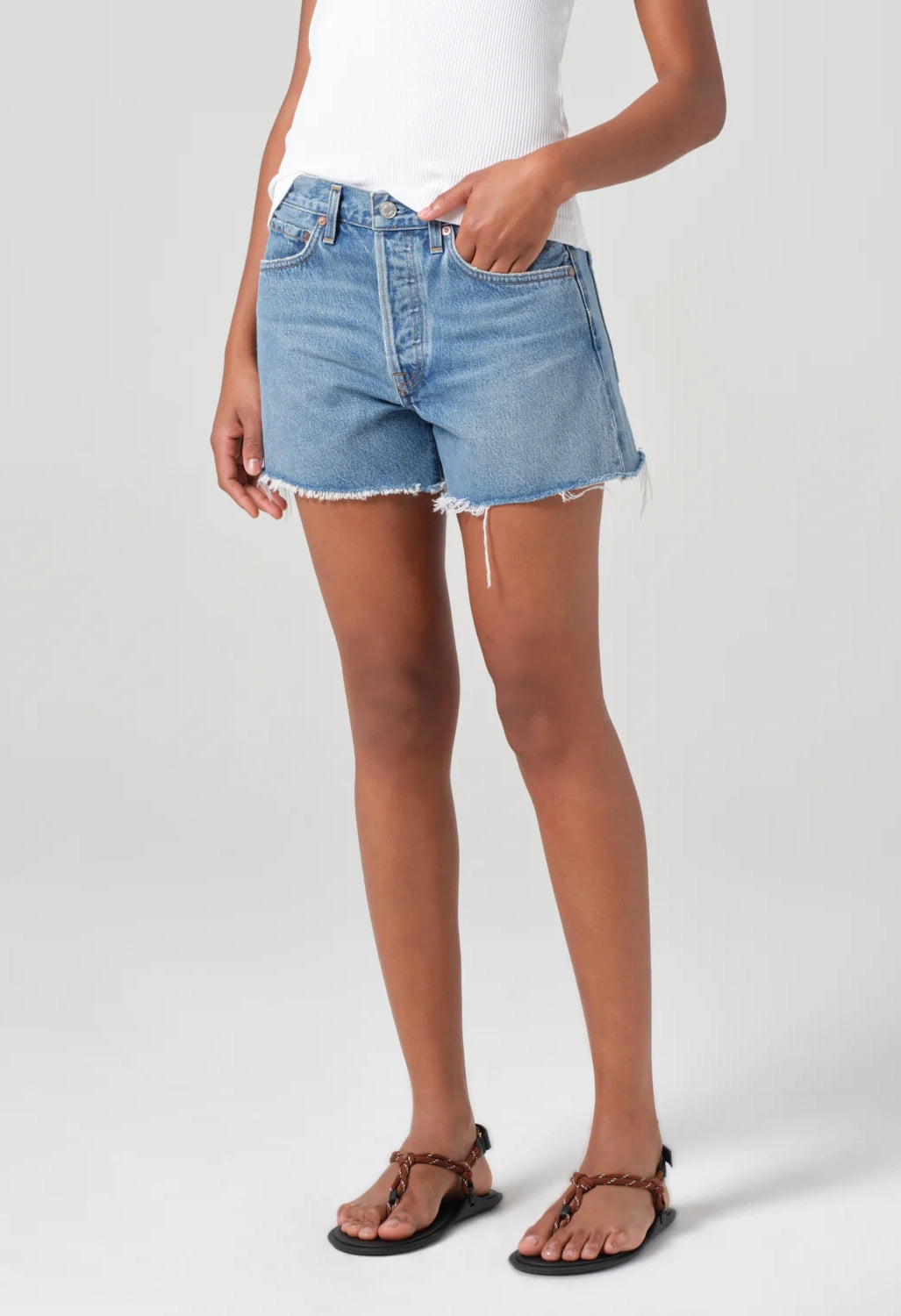 Upgrade your wardrobe with the sustainable Parker Long shorts. Made from a blend of recycled and regenerative cotton in vintage medium indigo denim, they feature natural fading and subtle whiskering for a timeless, well-worn look. With a relaxed high-rise and comfortable fit through the thighs, these shorts are effortlessly cool and versatile for any outfit.