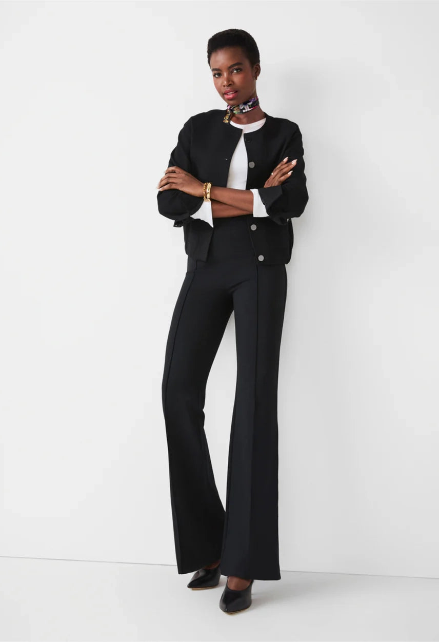 - Flare leg and premium ponte fabric comfortably hug and enhance your curves