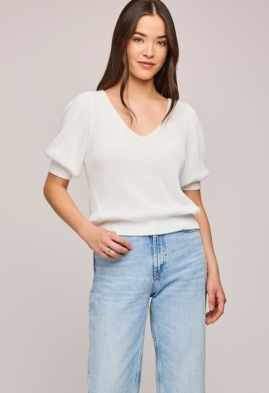Crafted from incredibly soft yarn, the Phoebe sweater boasts a v-neckline and puff sleeves, giving it a effortlessly feminine touch that is ideal for everyday wear.