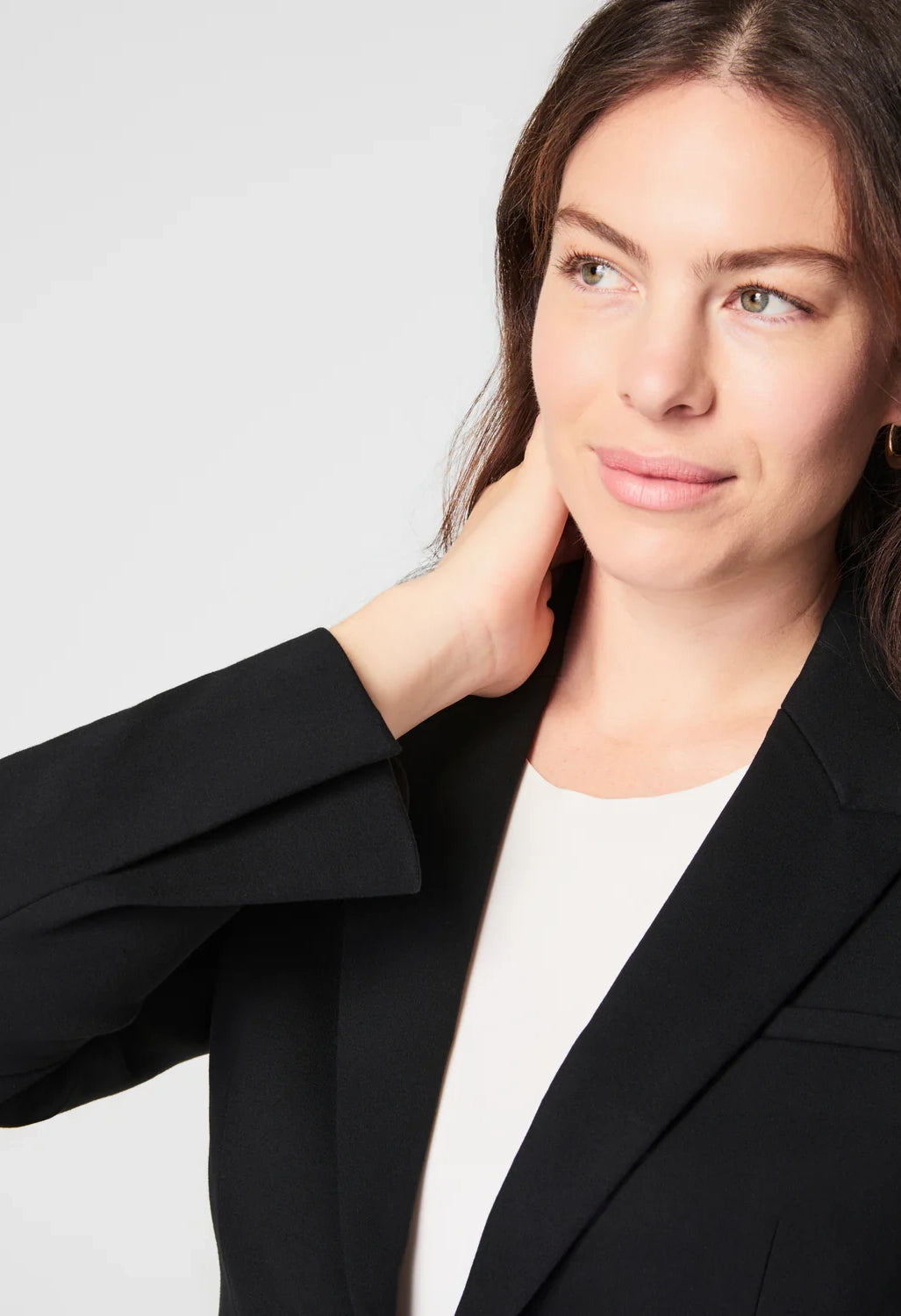 A blazer is essential. Crafted from high-quality ponte fabric with 4-way stretch, this piece offers both timeless style and exceptional comfort. Featuring a classic lapel and back darting, it delivers effortless tailoring for a sharp, polished appearance. This blazer is a highly adaptable wardrobe staple.