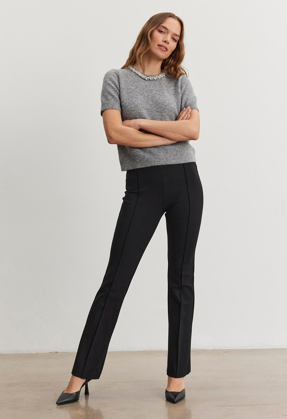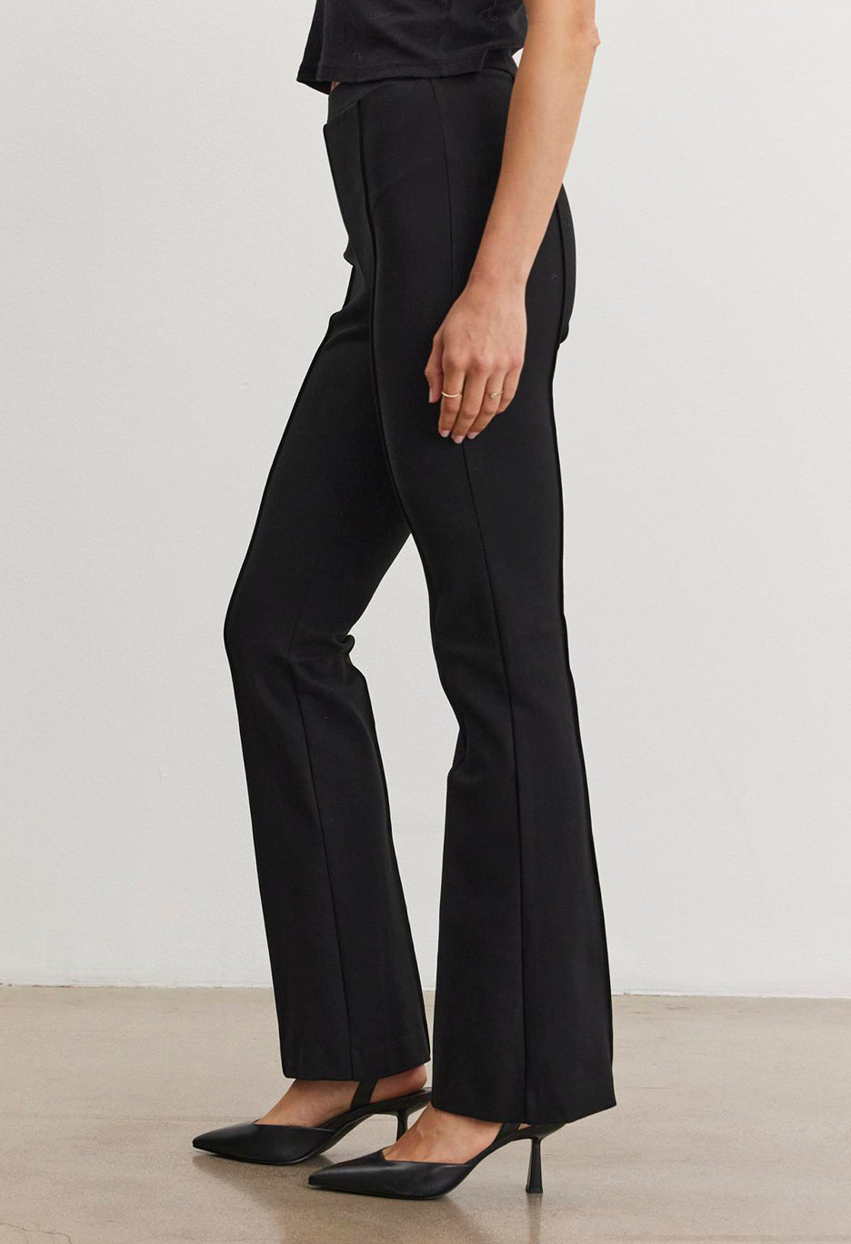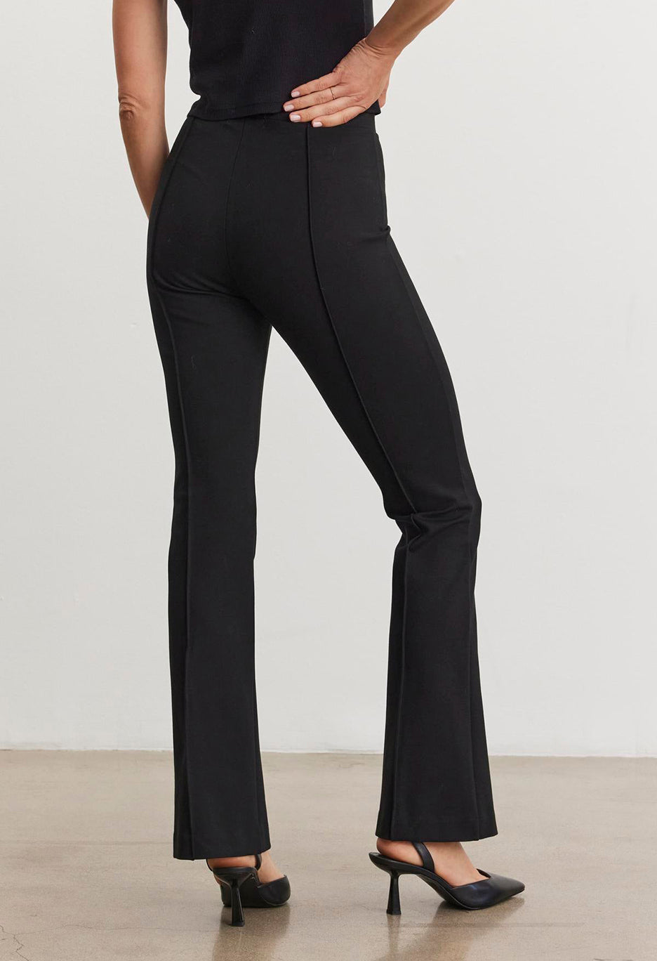 Crafted from a stretch ponte fabric, these pants feature an elastic waist and a stitched front seam, adding structure and polish to the boot-cut silhouette.
