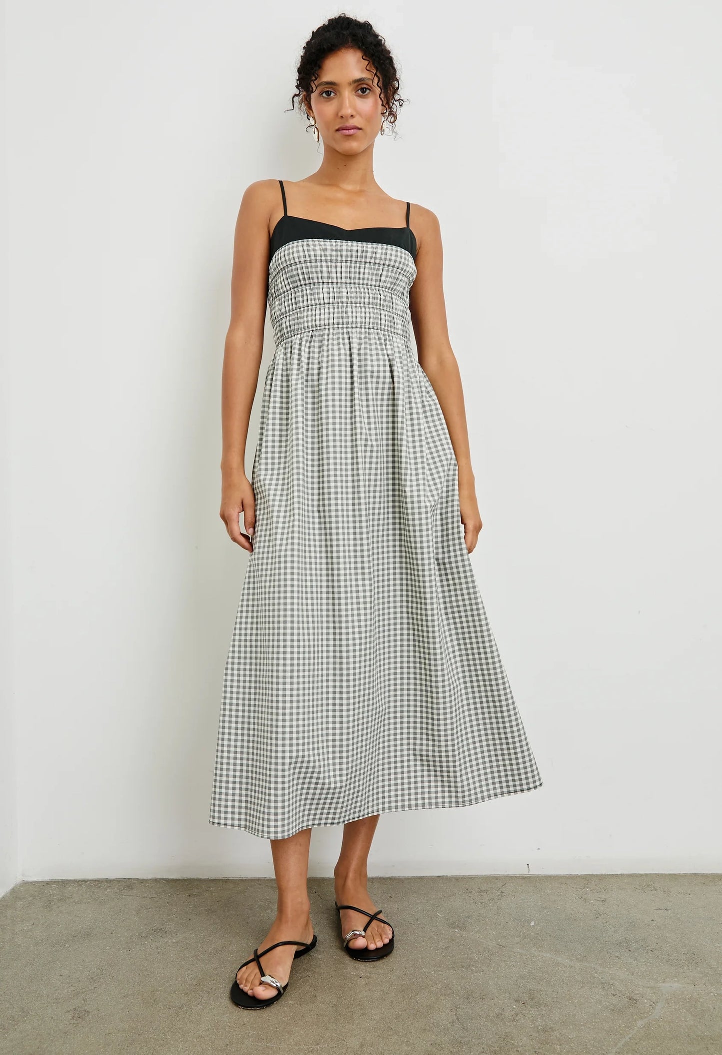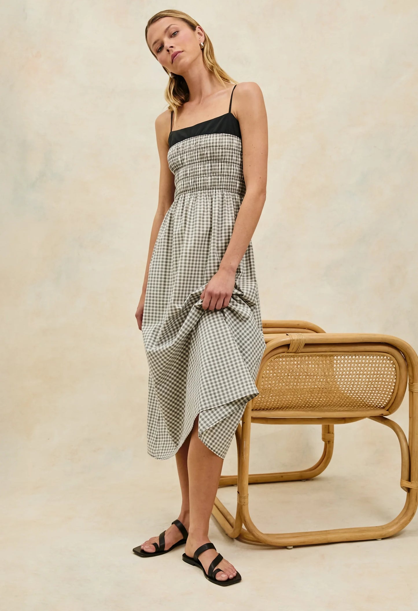 The Primrose Dress, inspired by French screen sirens, showcases a midi-length skirt and a shirred bodice. Made from a durable cotton poplin fabric, this style is both lightweight and highly breathable.