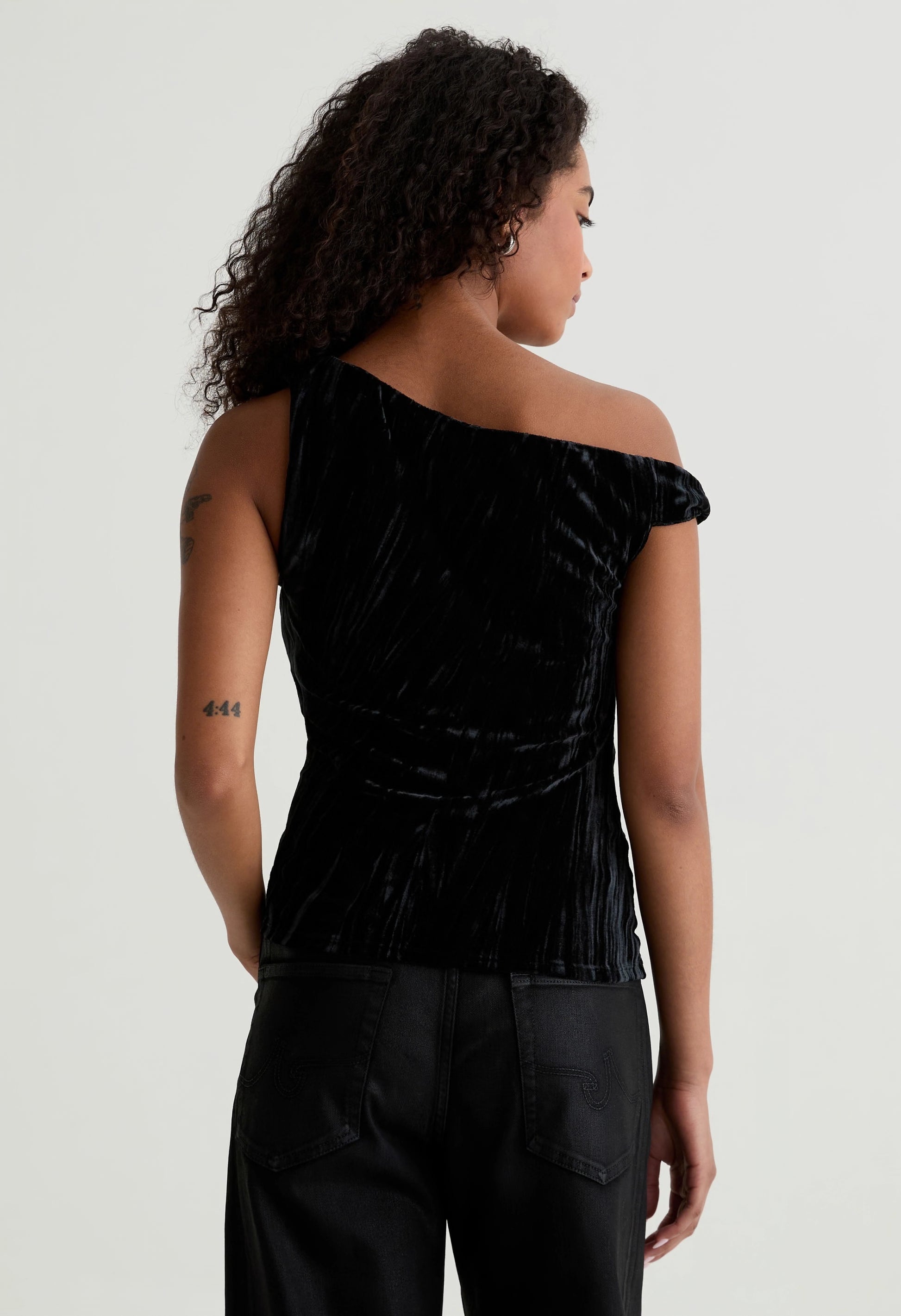 The Rachel Velvet is a cold shoulder top made from Liquid Velvet, a black crushed velvet fabric with slight stretch that contours the body. It offers a fitted silhouette with pleated side seams and asymmetrical off-shoulder sleeves, creating an elegant and feminine style. This essential piece pairs beautifully with denim or the Careen velvet pants for a seamless, polished outfit.