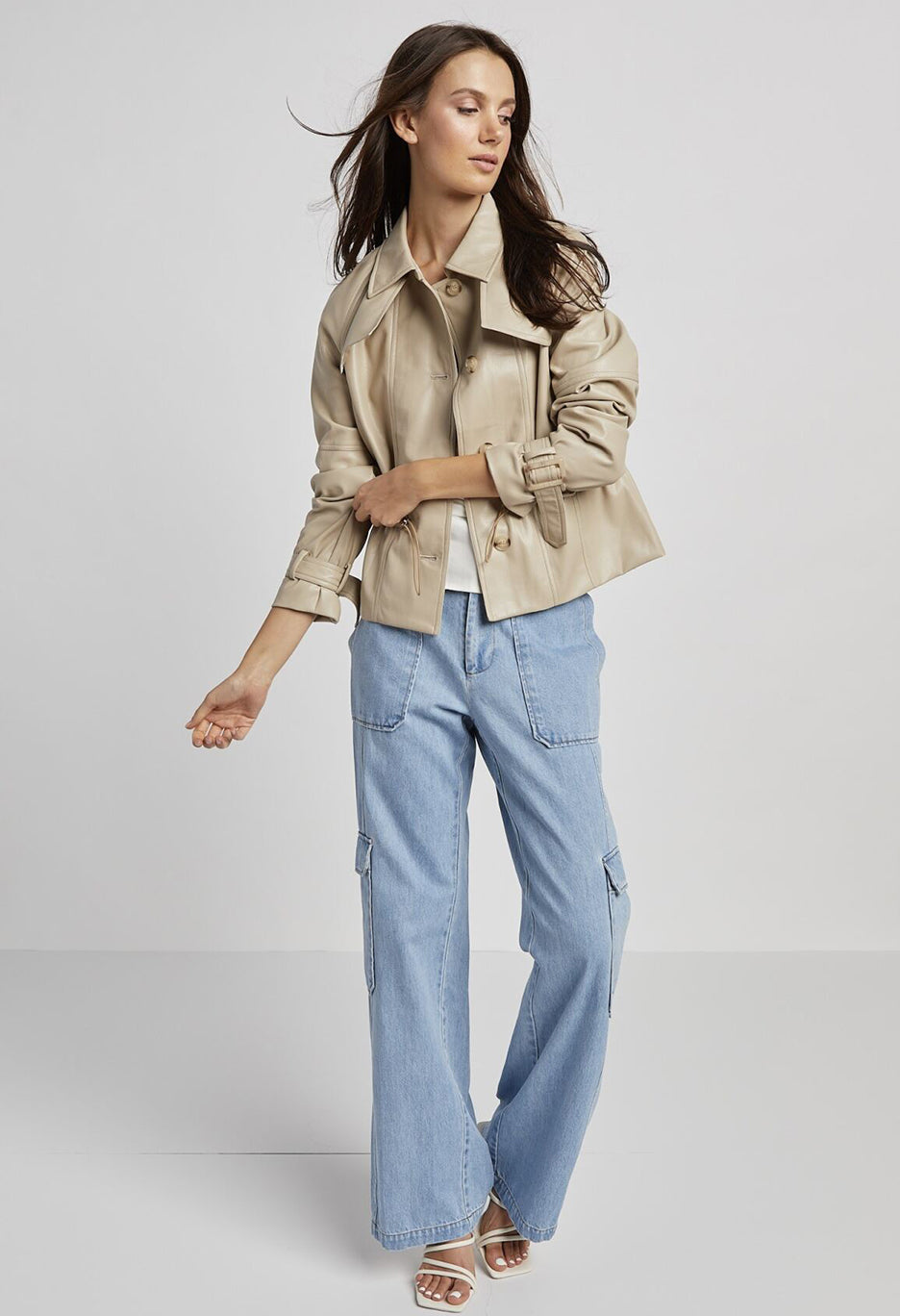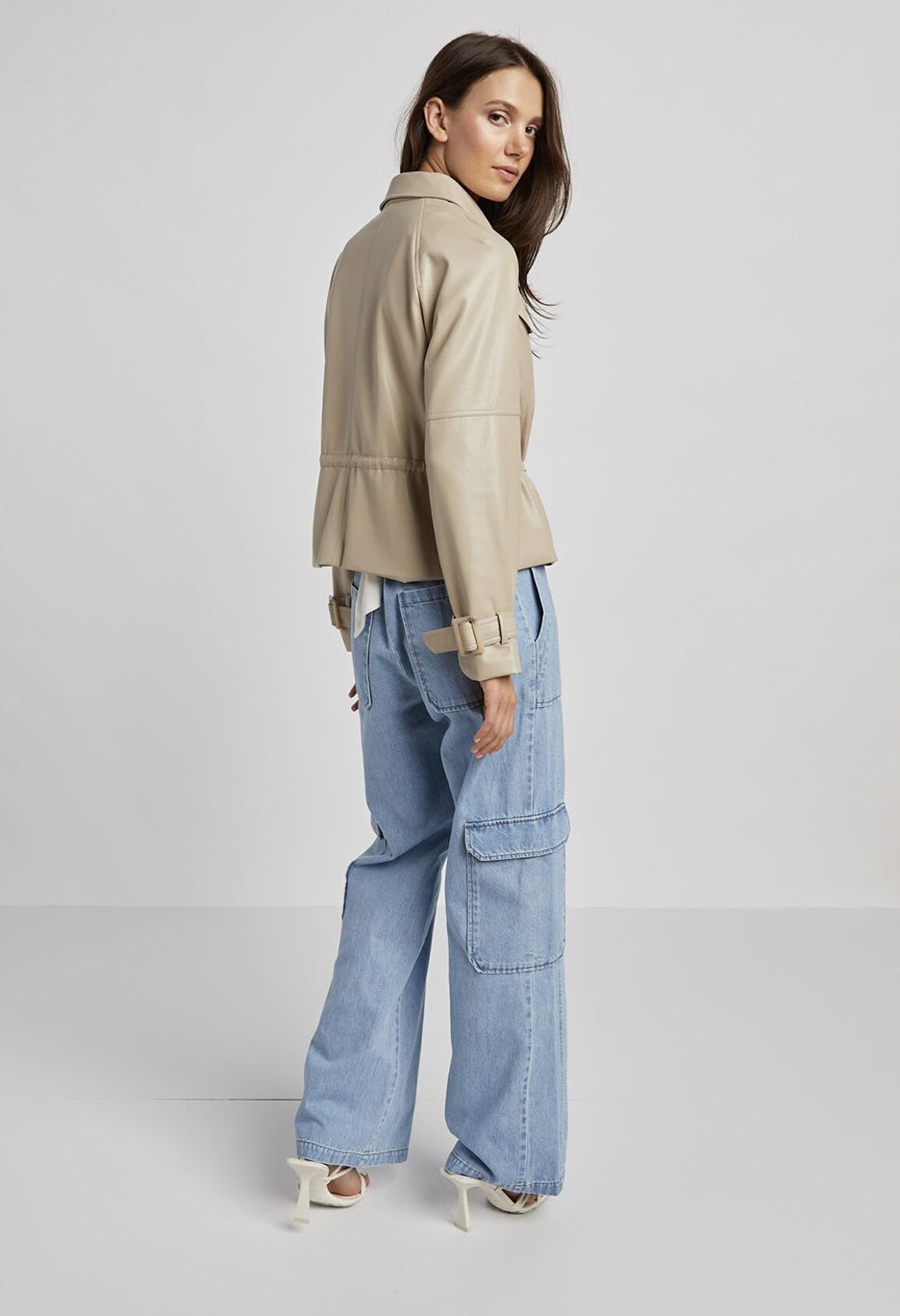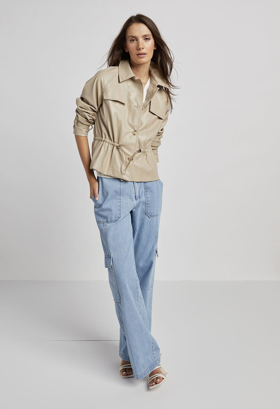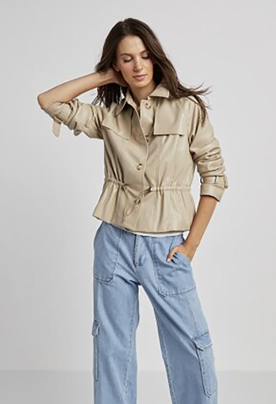 The Rae Faux Leather jacket features a drawstring cinched waist, adding a touch of style to the classic design. Made with vegan leather, it provides a cruelty-free alternative without compromising on durability. Perfect for a polished and conscious fashion look.