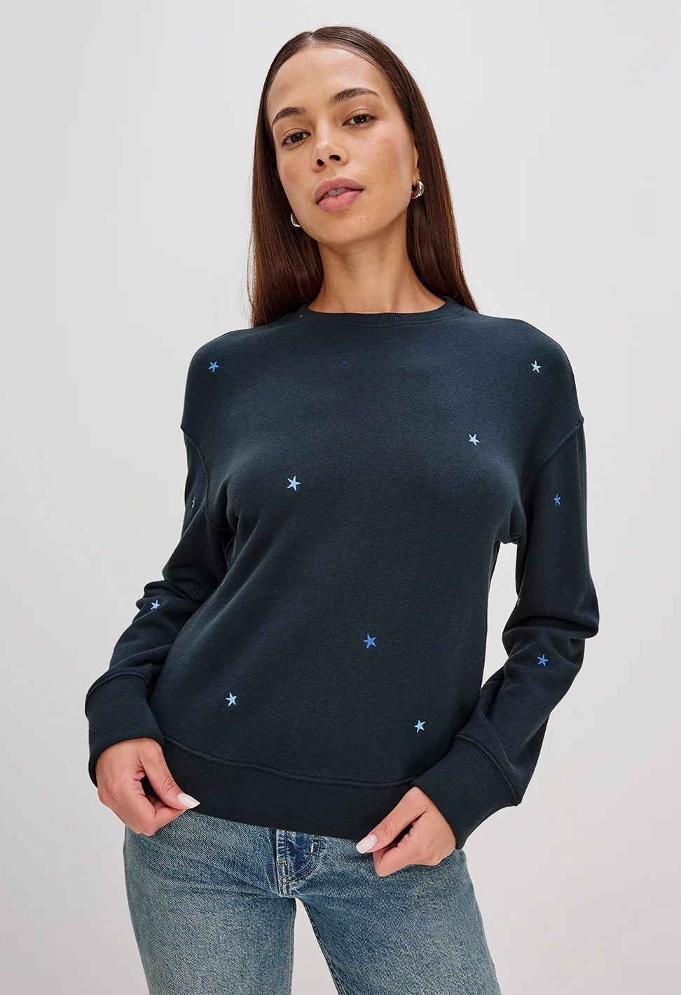 This comfortable pullover sweatshirt is ideal for unwinding at home or running errands with ease. Crafted from lounge terry, it offers a long sleeve crewneck design adorned with embroidered stars across the body, featuring dropped shoulders and tall ribbed cuffs and hem for a refined finish.