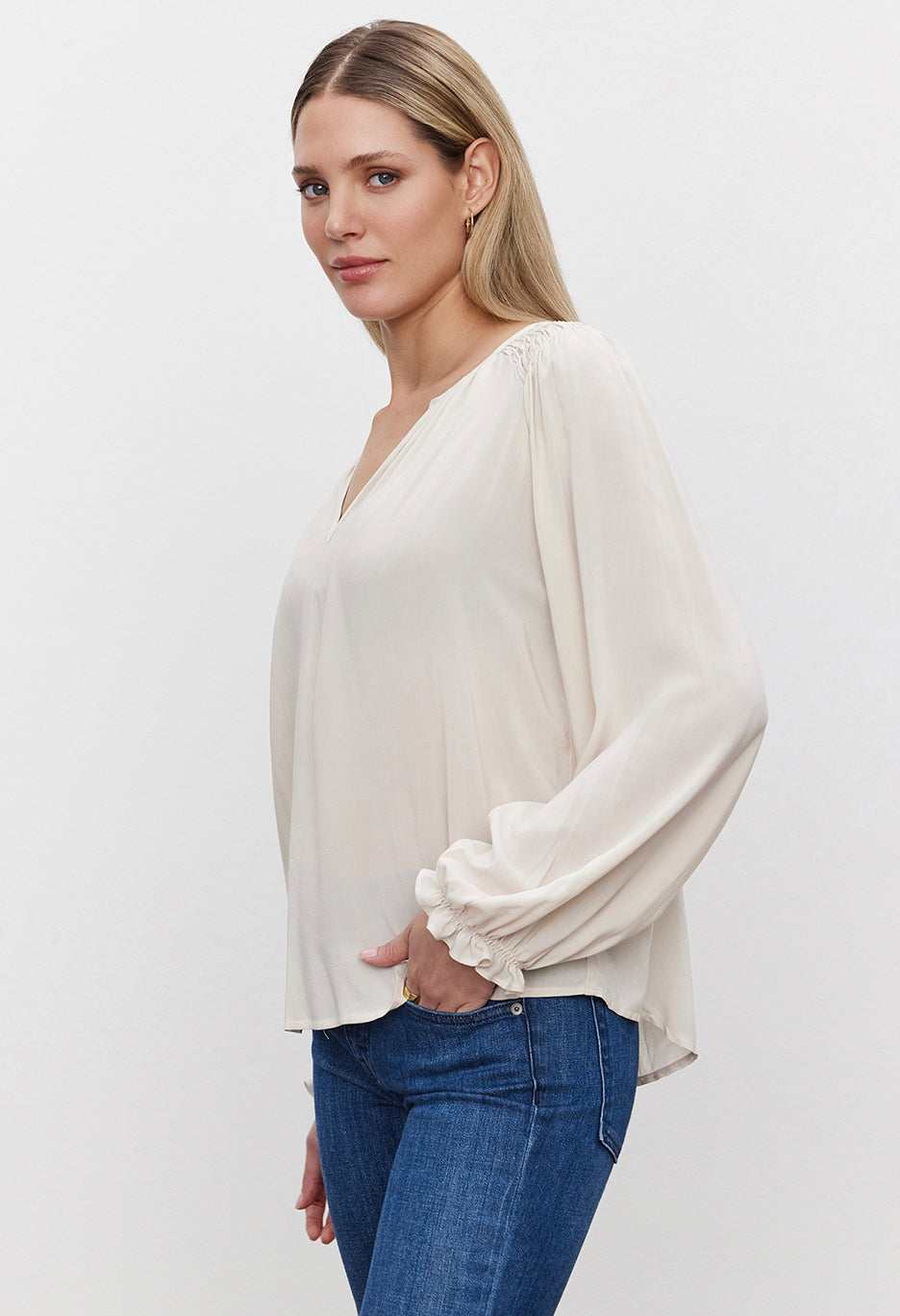 Elevate your style with our Azalea Rayon Challis Long Sleeve Top. Made from luxurious rayon challis fabric, featuring a banded neckline and relaxed fit. The shirred seams provide a chic touch. Experience effortless sophistication and comfort in one.