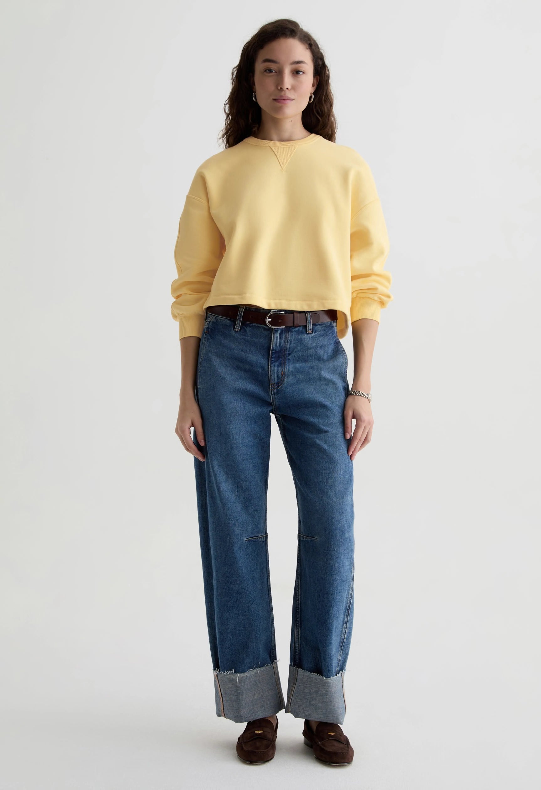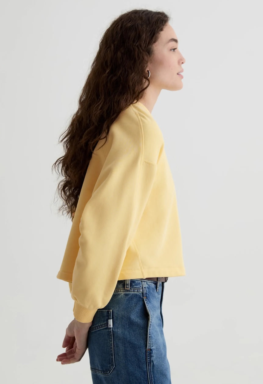 Roselle is a cotton blend fleece sweatshirt that balances classic and contemporary style. Traditional V-notch stitching adds timeless detail, while the relaxed dropped sleeves and cropped silhouette bring modern ease to your everyday wardrobe. Cut to hit just right above the hip, it pairs effortlessly with your favorite jeans. Finished in our signature Sunlight Yellow for a warm, inviting look.