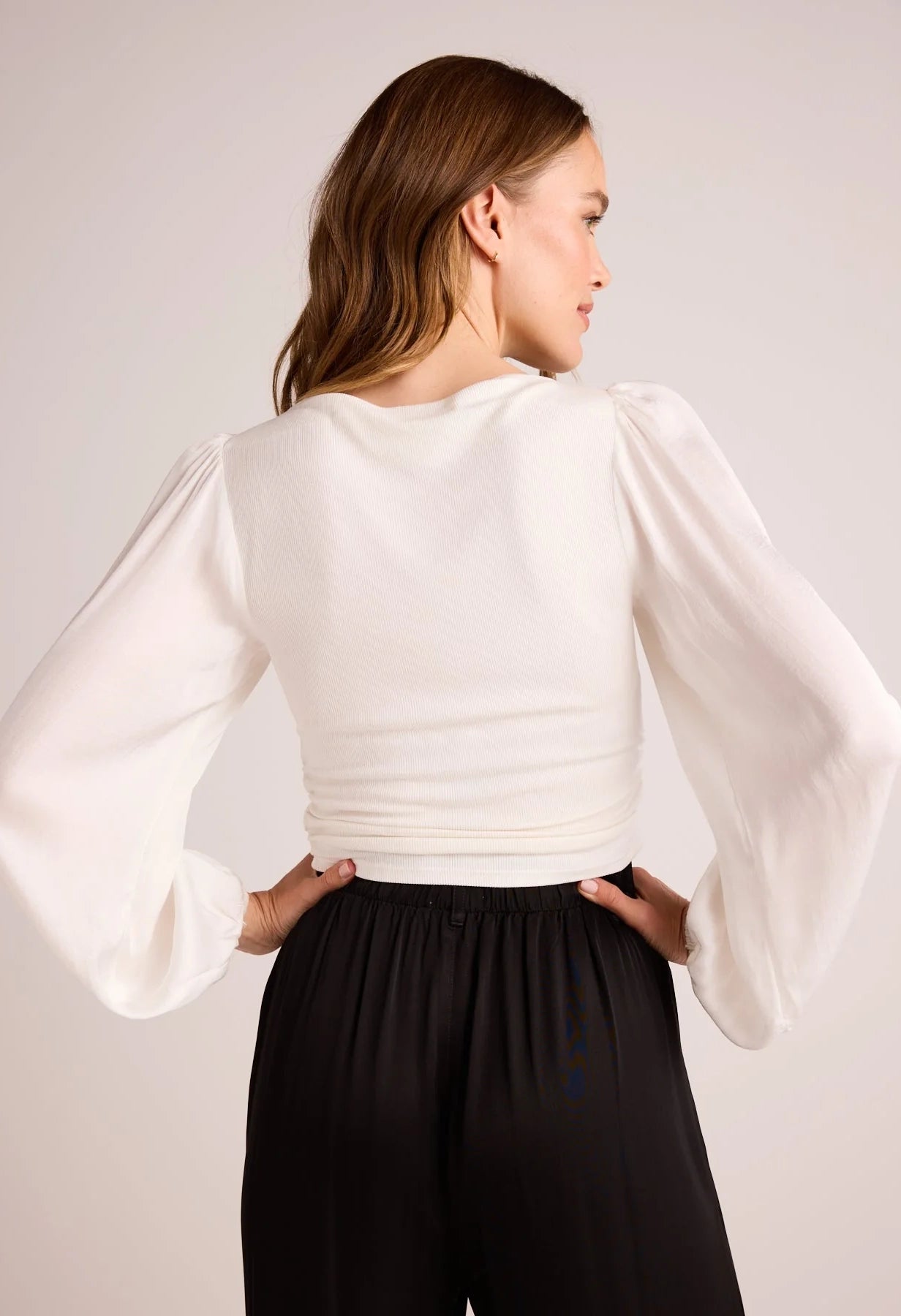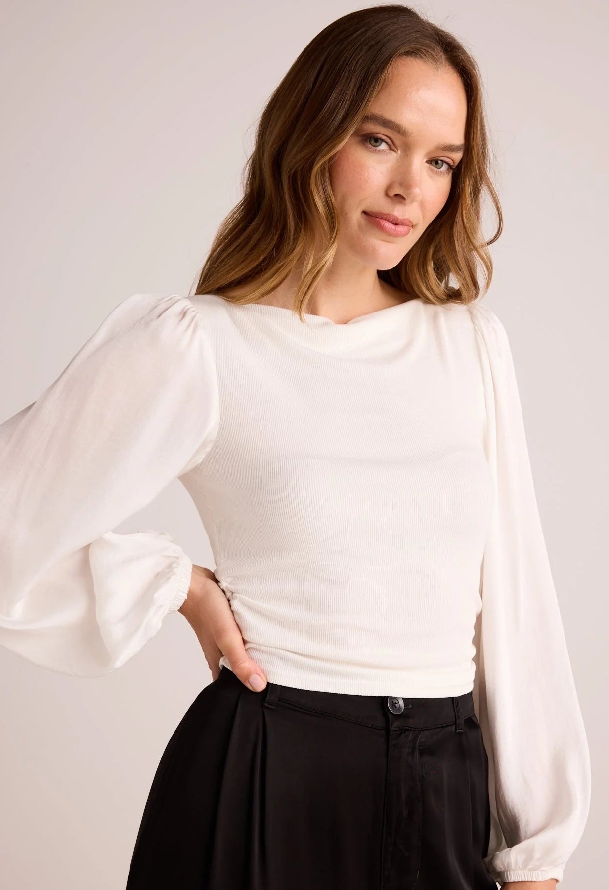 This top is made of ribbed knit and boasts luxurious satin flowy sleeves, adding a touch of glamour to your wardrobe. Its soft knit fabric ensures both comfort and elegance, making it a versatile choice for any occasion.