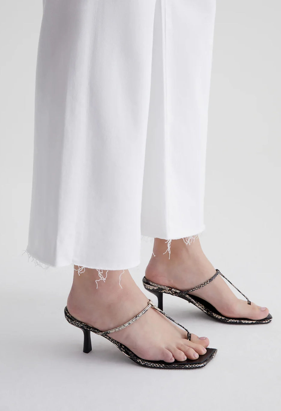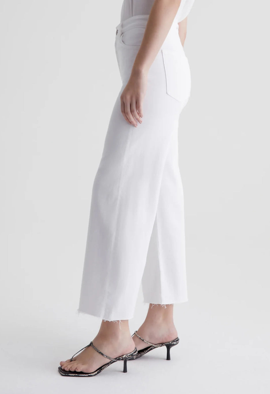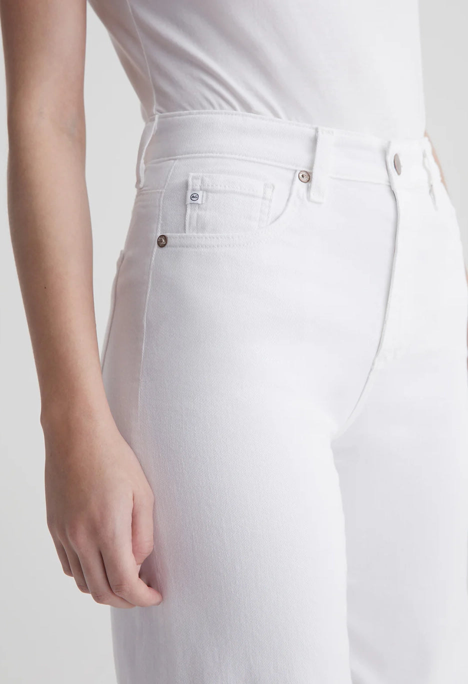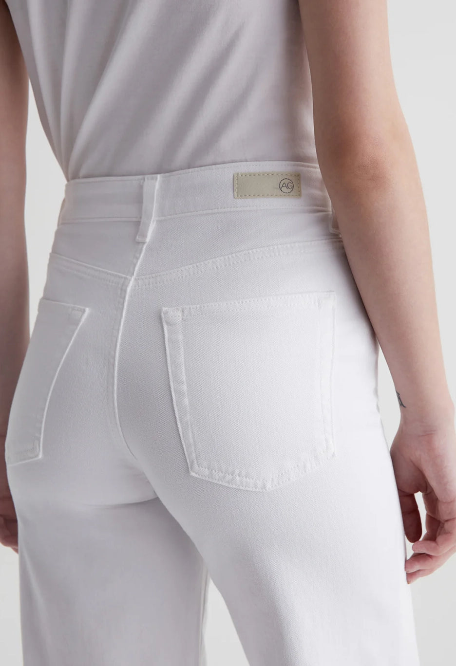 The Saige Wide Leg Crop is a high-rise jean with loose, cropped legs and raw hems. Made from AG Cloud Soft Denim™, this bright white pair comes in 8.7 oz. Hyper Soft Bull Denim, AG's special left-hand twill fabric that allows the yarns to gently relax and untwist for a luxe, supple feel. It's designed to get even softer the more you wear it. Dual-elastic stretch offers extra comfort and a resilient shape.