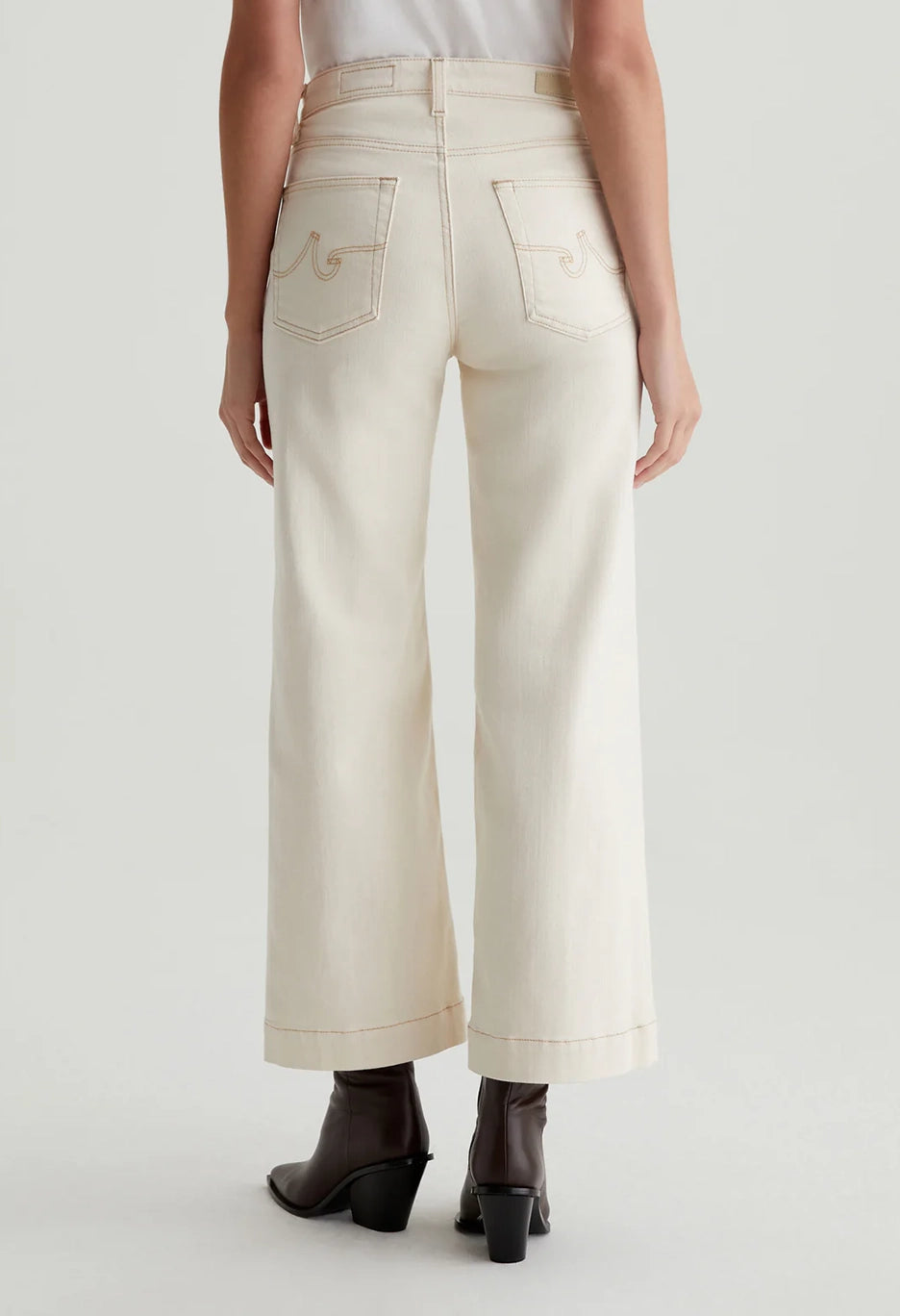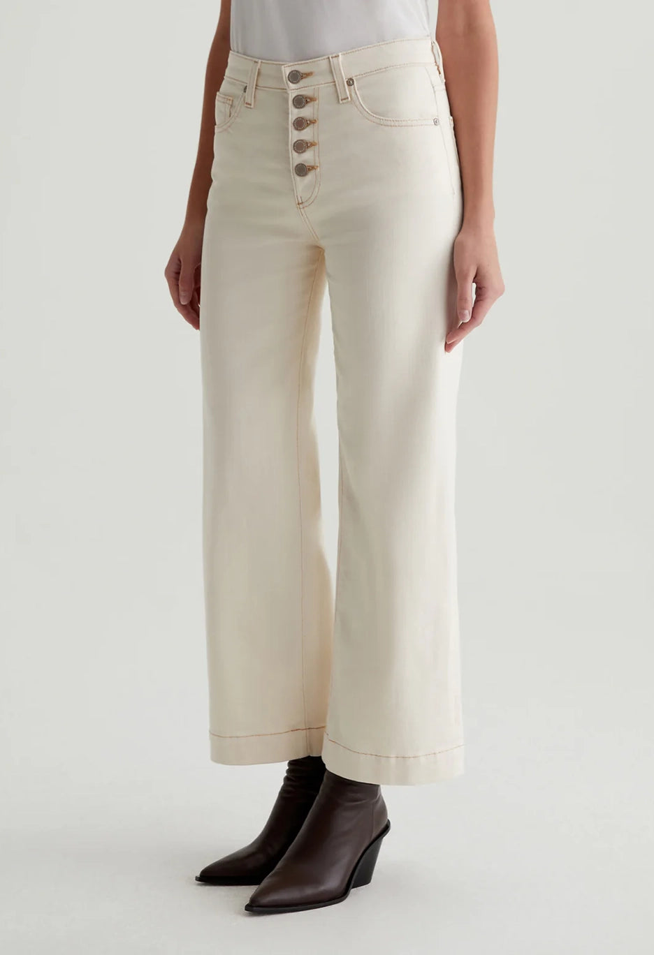 The Saige Wide Leg Crop has been refreshed with a cream-colored denim and an exposed button fly. Featuring tan contrast stitching, these wide-leg jeans have a mid-rise waist and loose, cropped legs. Made from 10 oz. Dover Stretch Denim, a comfortable cotton blend from Japan, these five-pocket jeans are a stylish and comfortable choice.