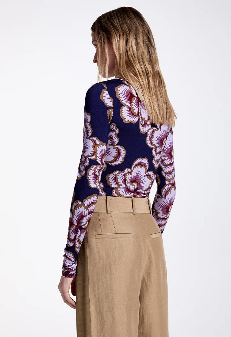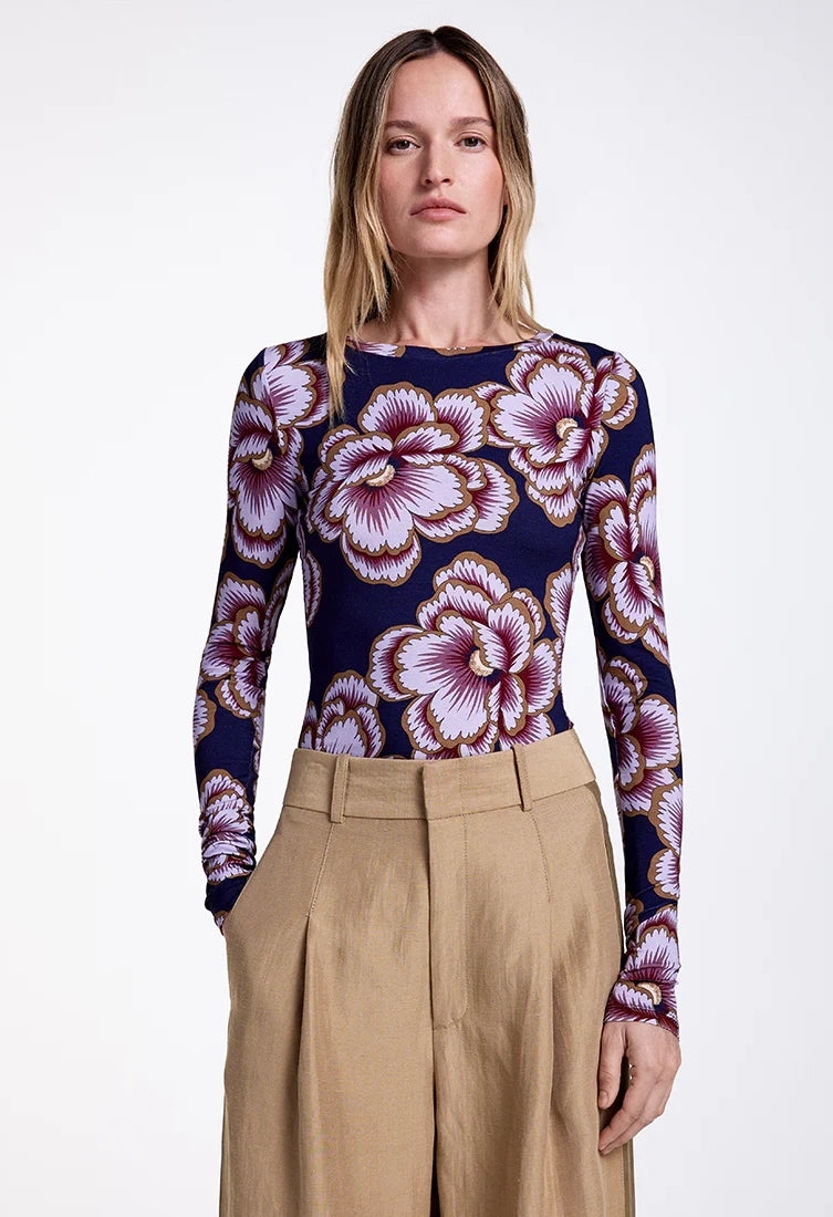 This fitted stretch knit top showcases a dark-based print and a timeless crewneck design. It includes extra-long sleeves ideal for scrunching. Please note, the sizing runs small, so consider ordering a size larger