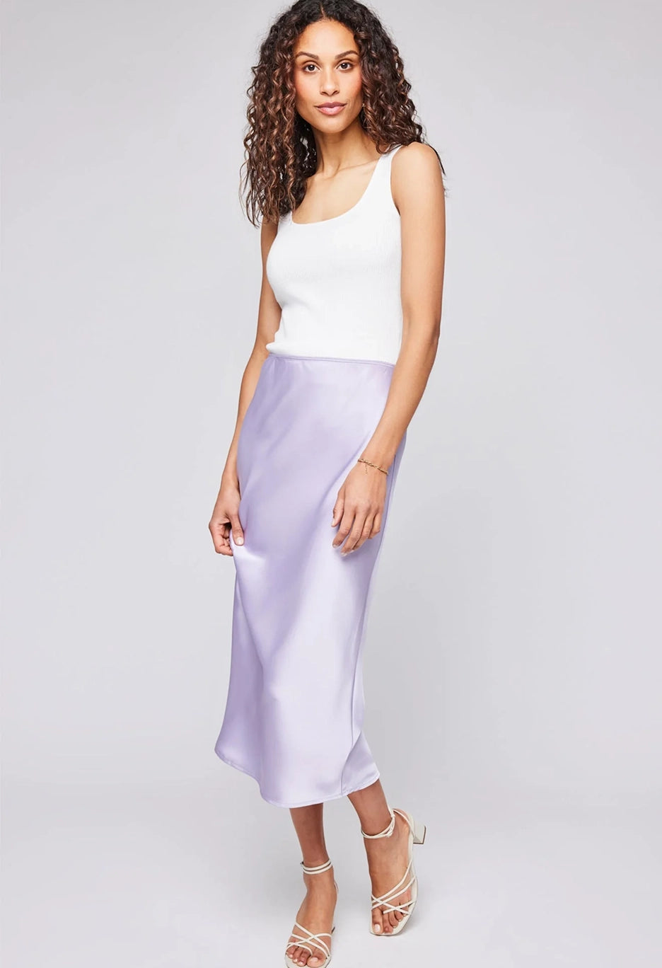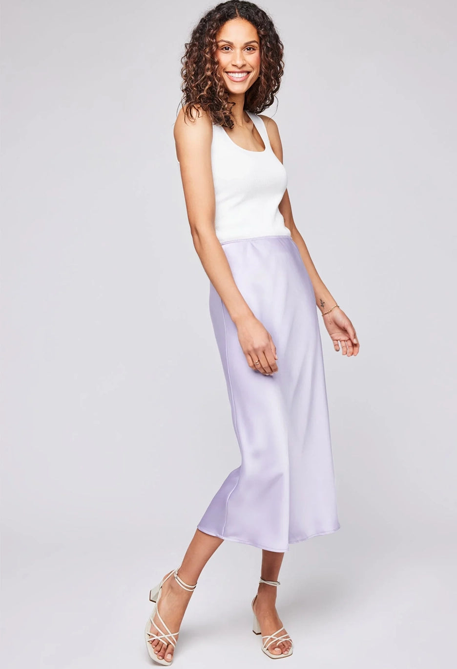 The Selena skirt is made of a bias cut satin fabric for a flattering fit. Features include an elastic waistband with a delicate scallop trim along the edge. Complete the look with the Anisa tank.